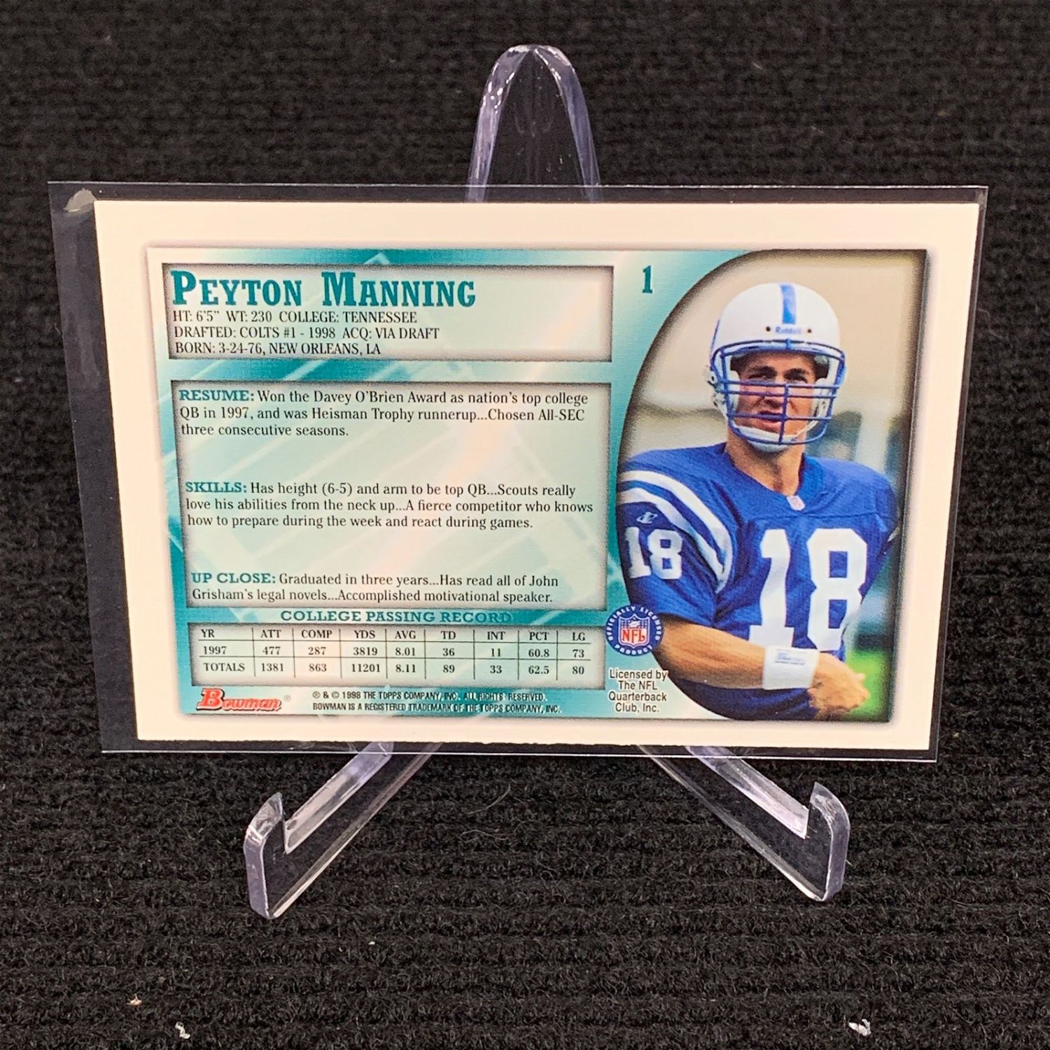 1998 Bowman Peyton Manning #1 Rookie Football Card. We are a veteran owned company. Please look at the pictures carefully to determine what you believe the condition of collecitible is. We are currently accepting consignments. Email us a [email protected] or visit our website, www.ahauctionhouse.com.