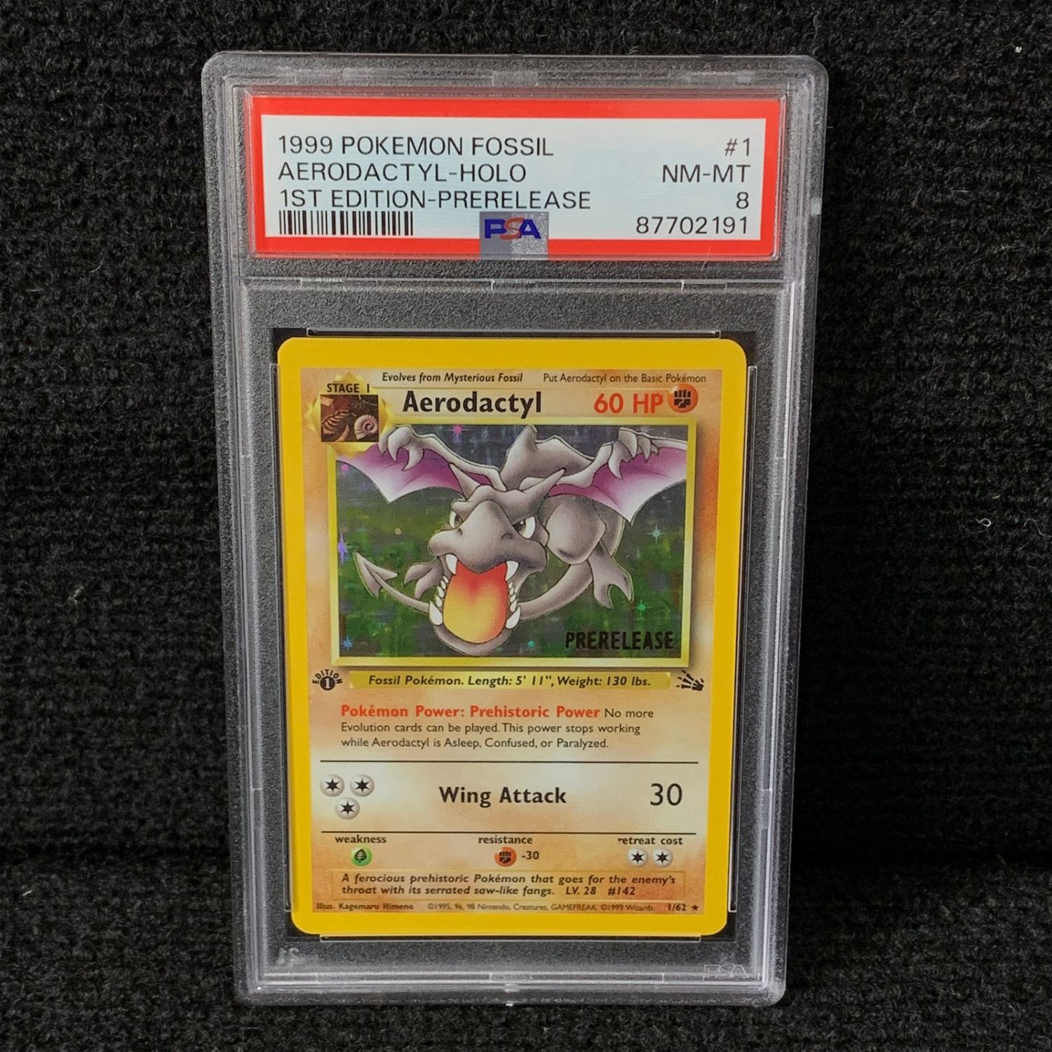PSA 8 NM-MT 1st Edition Prerelease Aerodactyl #1 Holo Fossil Vintage Pokemon Card. We are a veteran owned company. Please look at the pictures carefully to determine what you believe the condition of collecitible is. We are currently accepting consignments. Email us a [email protected] or visit our website, www.ahauctionhouse.com.