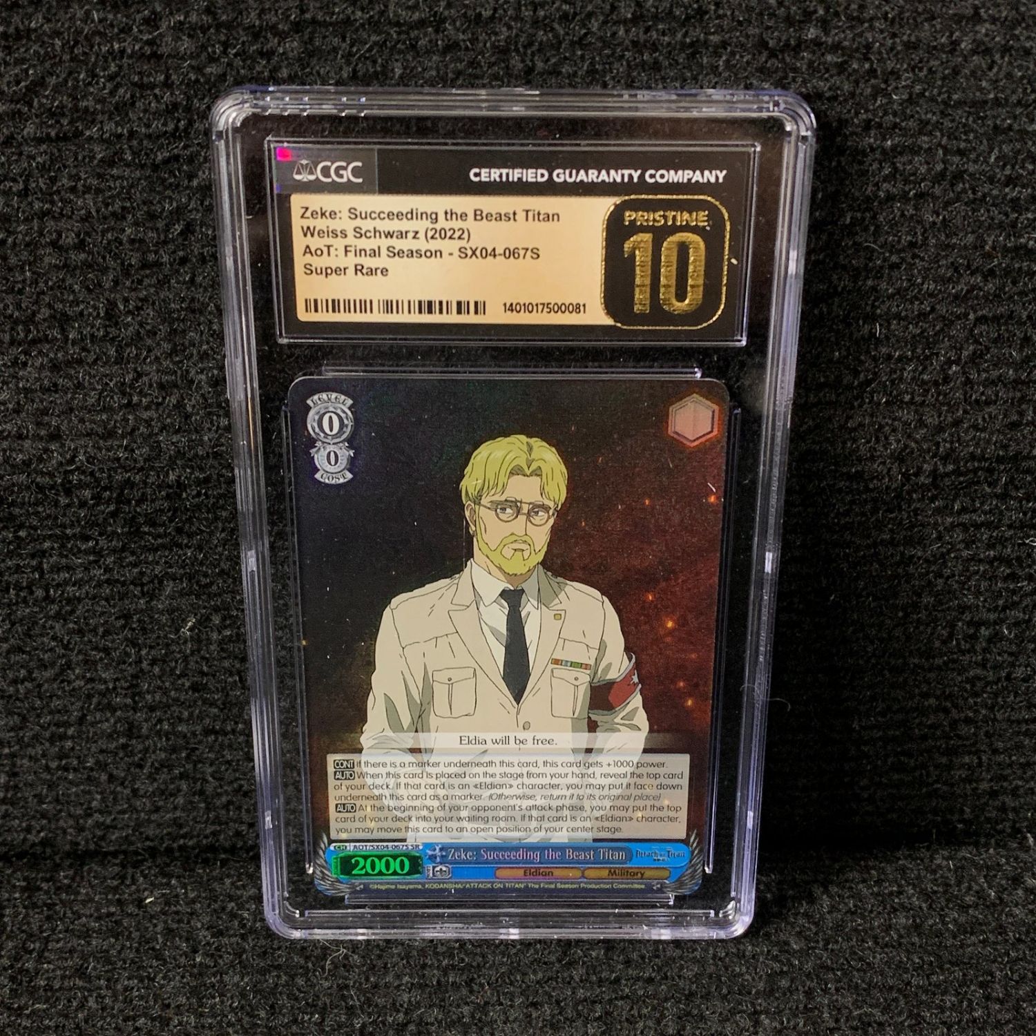 CGC Pristine 10 Zeke: Succeeding the Beast Titan #SX04-067S Attack On Titan: Final Season Weiss Schwarz Card. We are a veteran owned company. Please look at the pictures carefully to determine what you believe the condition of collecitible is. We are currently accepting consignments. Email us a [email protected] or visit our website, www.ahauctionhouse.com.