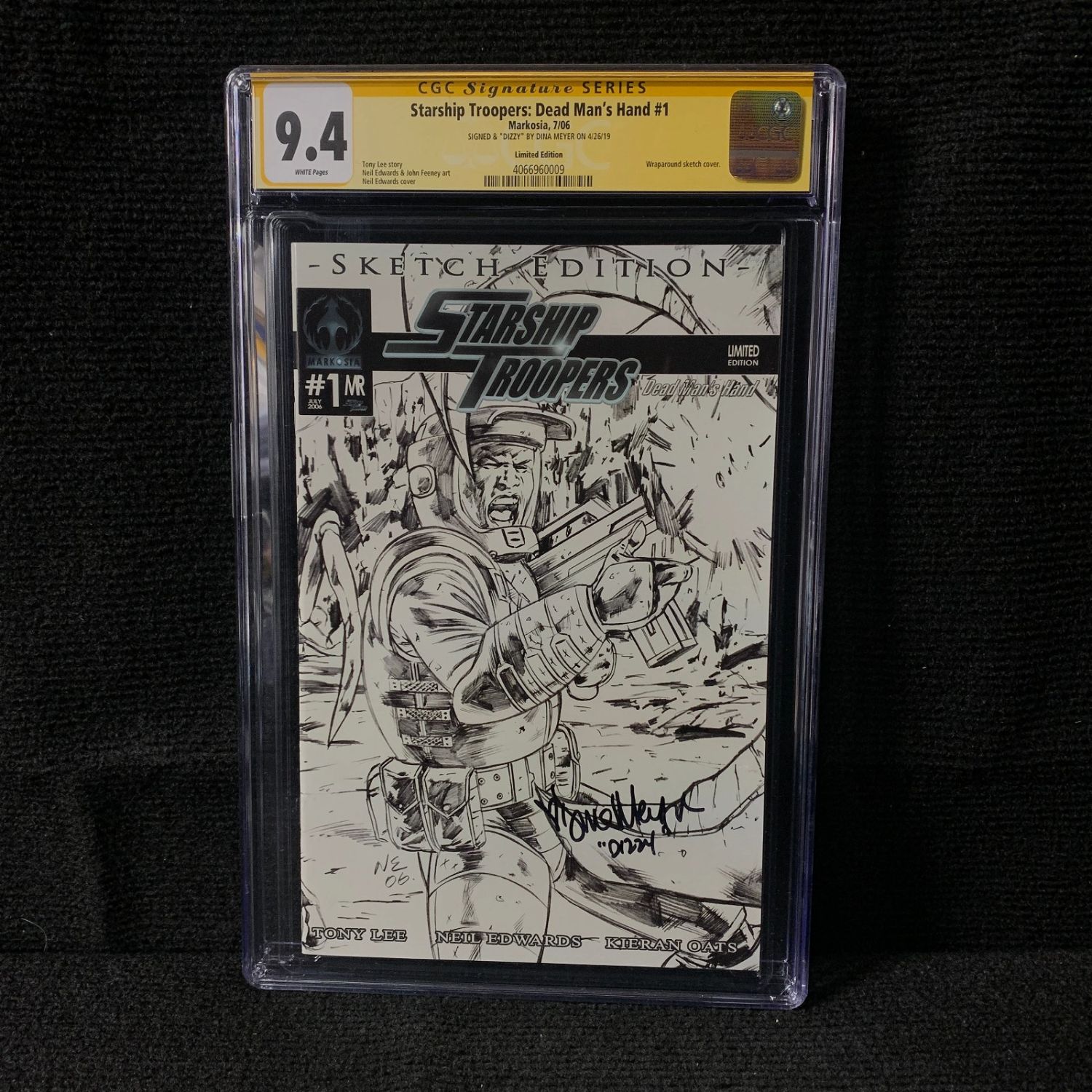 CGC 9.4 Starship Troopers: Dead Man’s Hand #1 Signature Series. Signed and "Dizzy" by Dina Meyer. Wraparound sketch cover. Limited Edition. We are a veteran owned company. Please look at the pictures carefully to determine what you believe the condition of collecitible is. We are currently accepting consignments. Email us a [email protected] or visit our website, www.ahauctionhouse.com.
