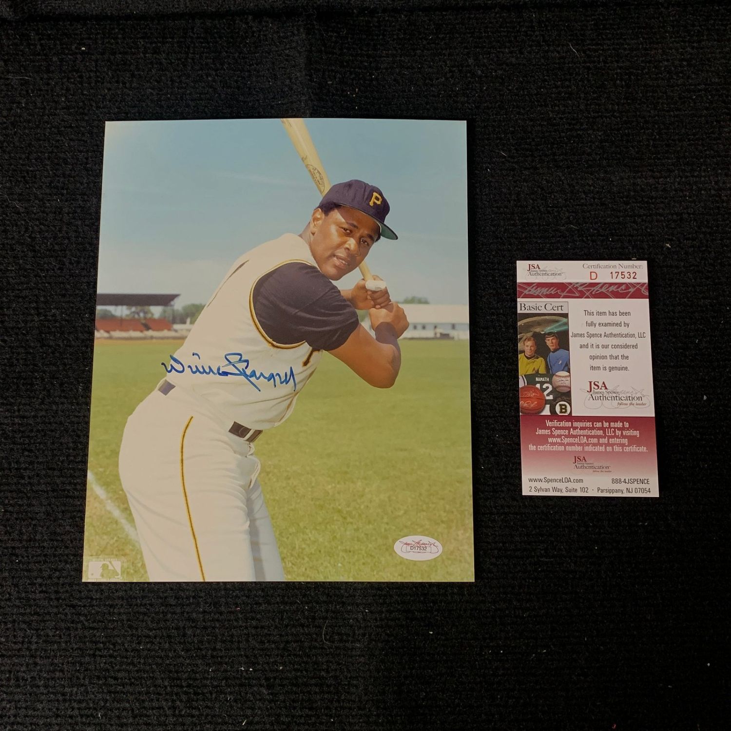 Color Photograph of Baseball Player Willie Stargell. Includes COA from JSA. We are a veteran owned company. Please look at the pictures carefully to determine what you believe the condition of collecitible is. We are currently accepting consignments. Email us a [email protected] or visit our website, www.ahauctionhouse.com.