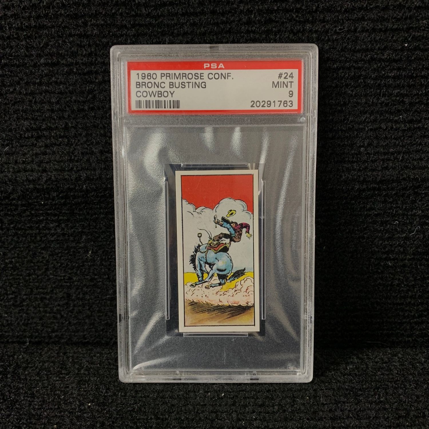 PSA 9 Bronc Busting #24. Cowboy card. 1960 Primrose Confectionery POP 3. We are a veteran owned company. Please look at the pictures carefully to determine what you believe the condition of collecitible is. We are currently accepting consignments. Email us a [email protected] or visit our website, www.ahauctionhouse.com.