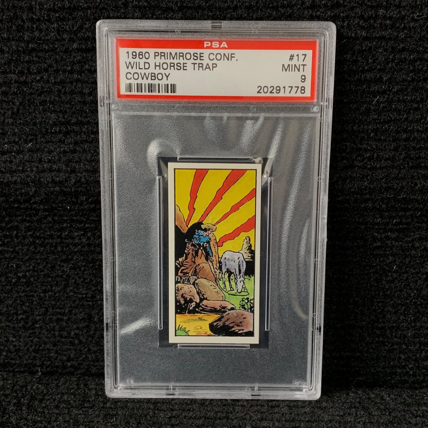 PSA 9 Wild Horse Trap #17 Cowboy card. 1960 Primrose Confectionery POP 8 no grades higher. We are a veteran owned company. Please look at the pictures carefully to determine what you believe the condition of collecitible is. We are currently accepting consignments. Email us a [email protected] or visit our website, www.ahauctionhouse.com.