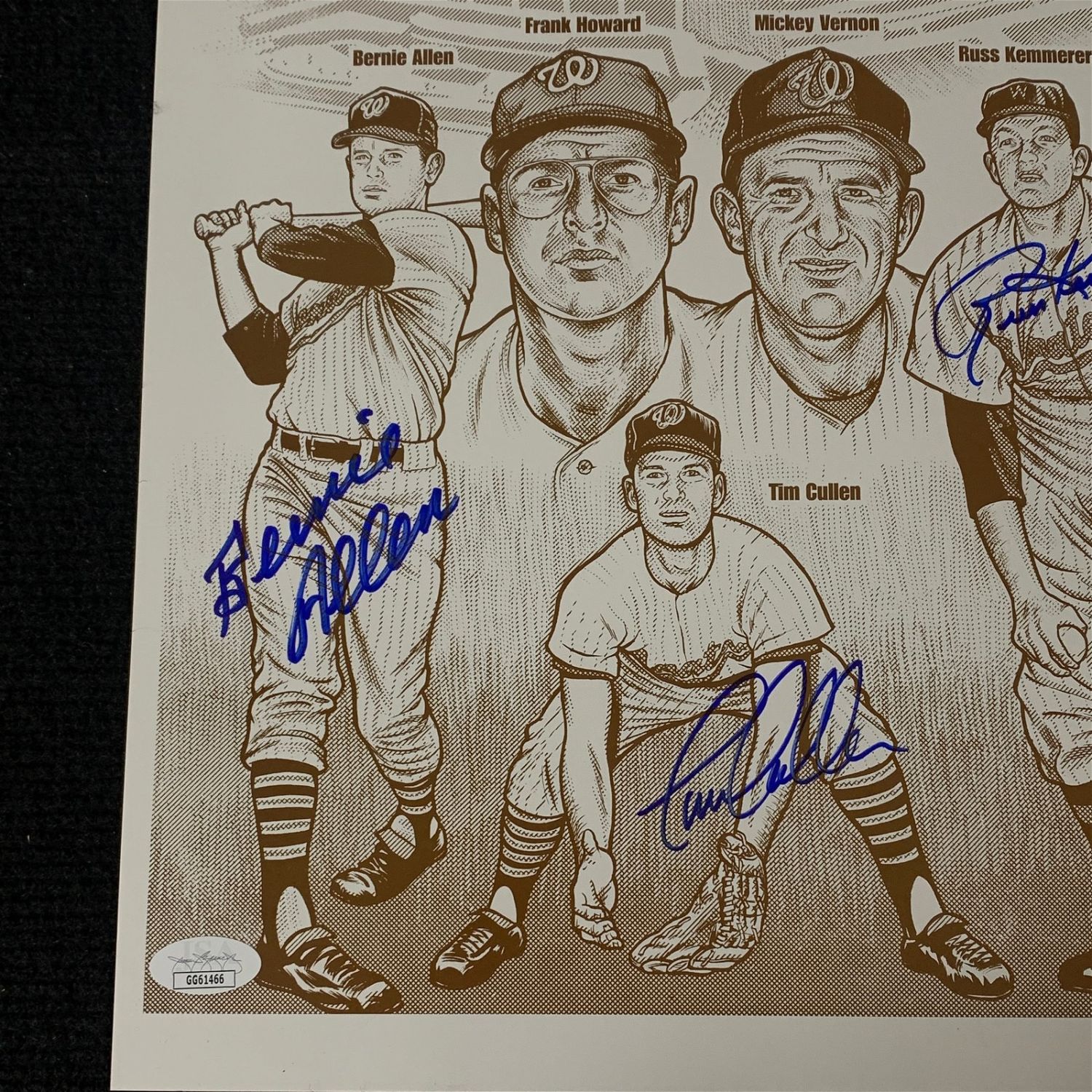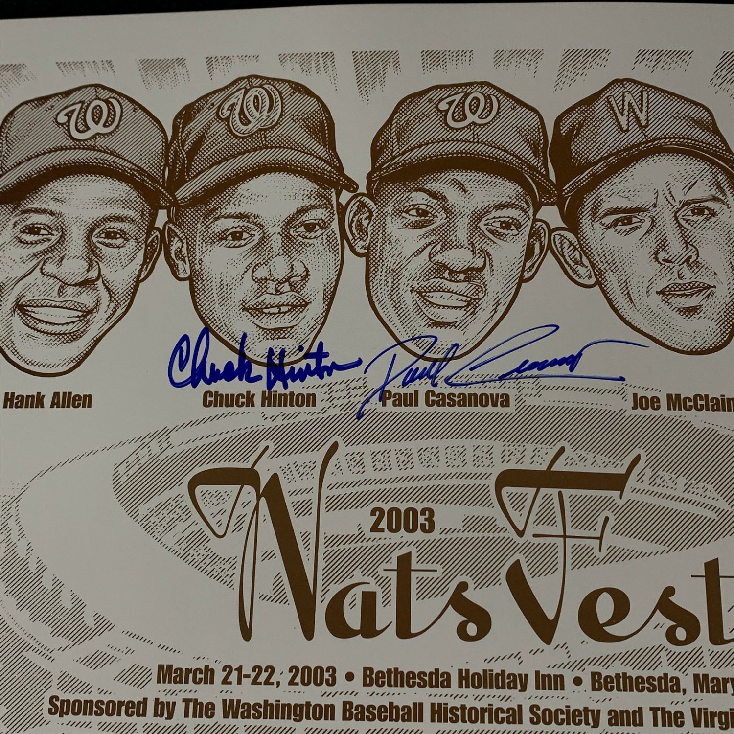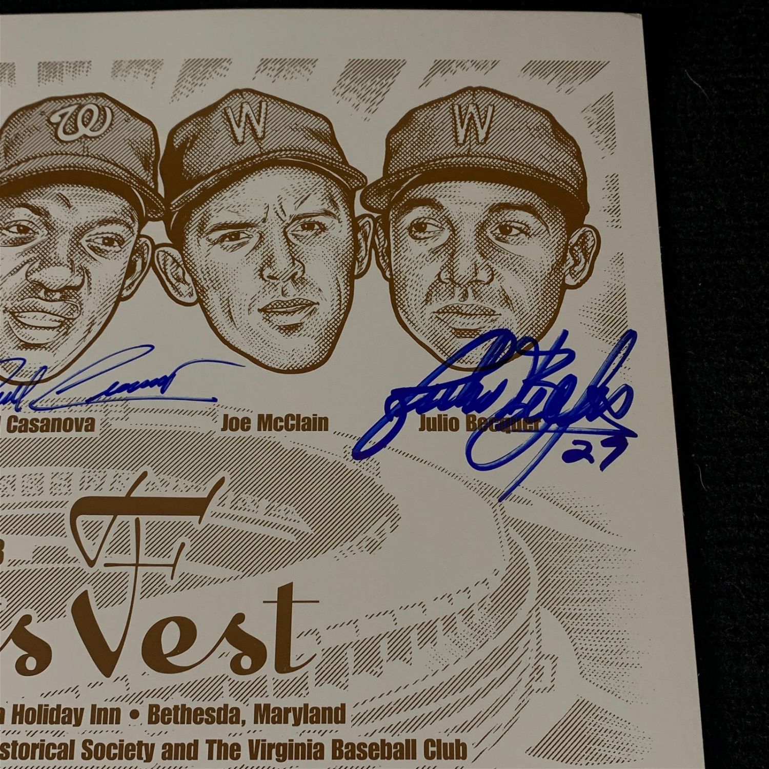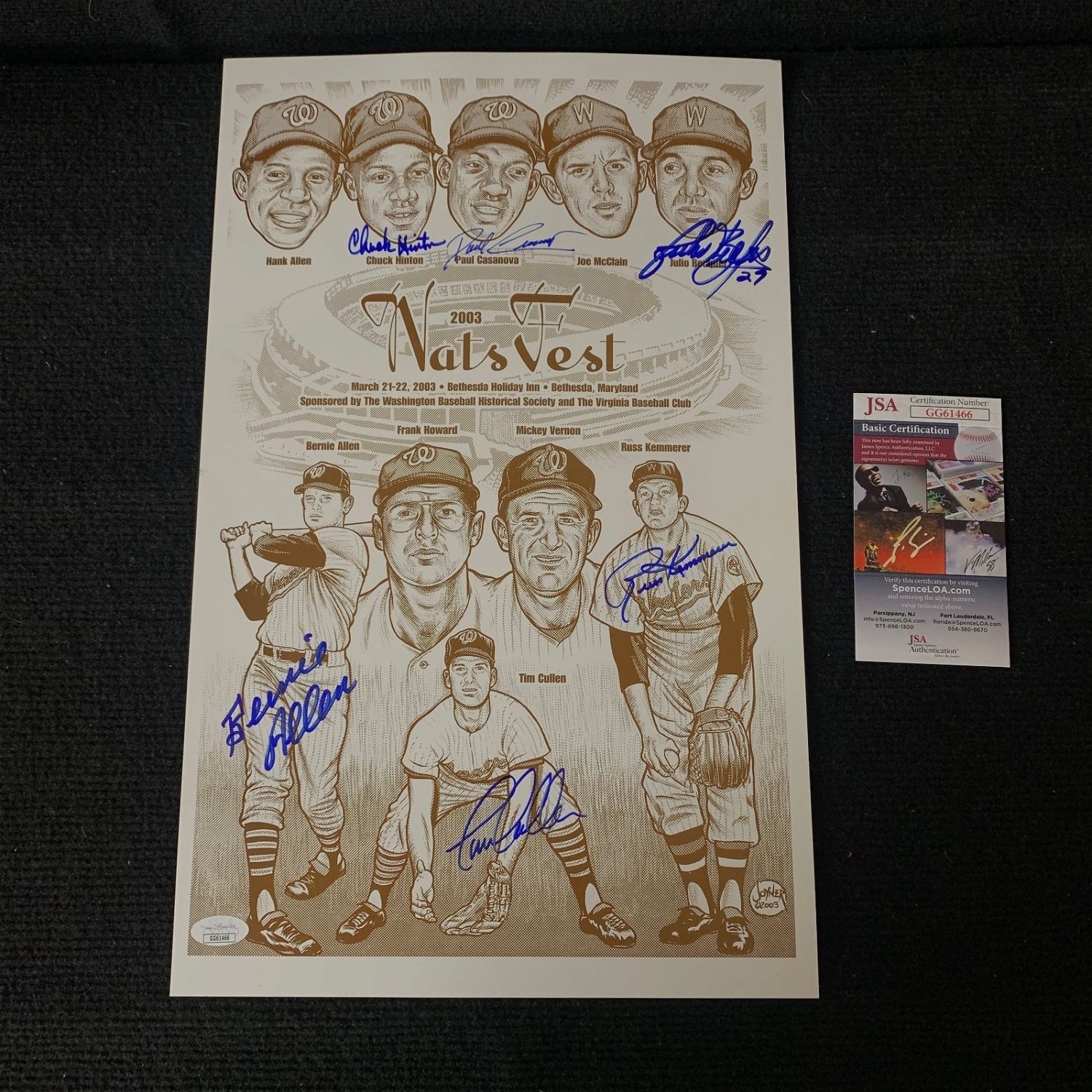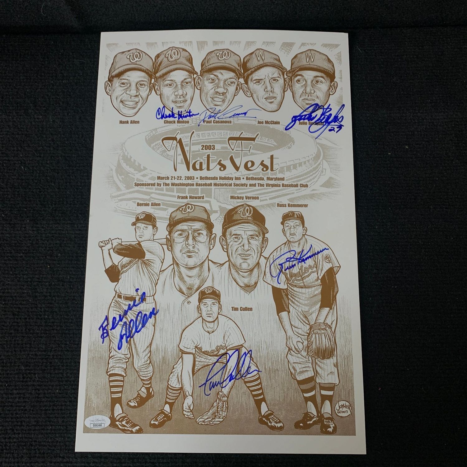 In beautiful perfect blue sharpie comes this group of signatures at the 2003 Washington Senators Reunion. Signed are B. Allen, Becquer, Casanova, Cullen, Hinton, and Kemmerer