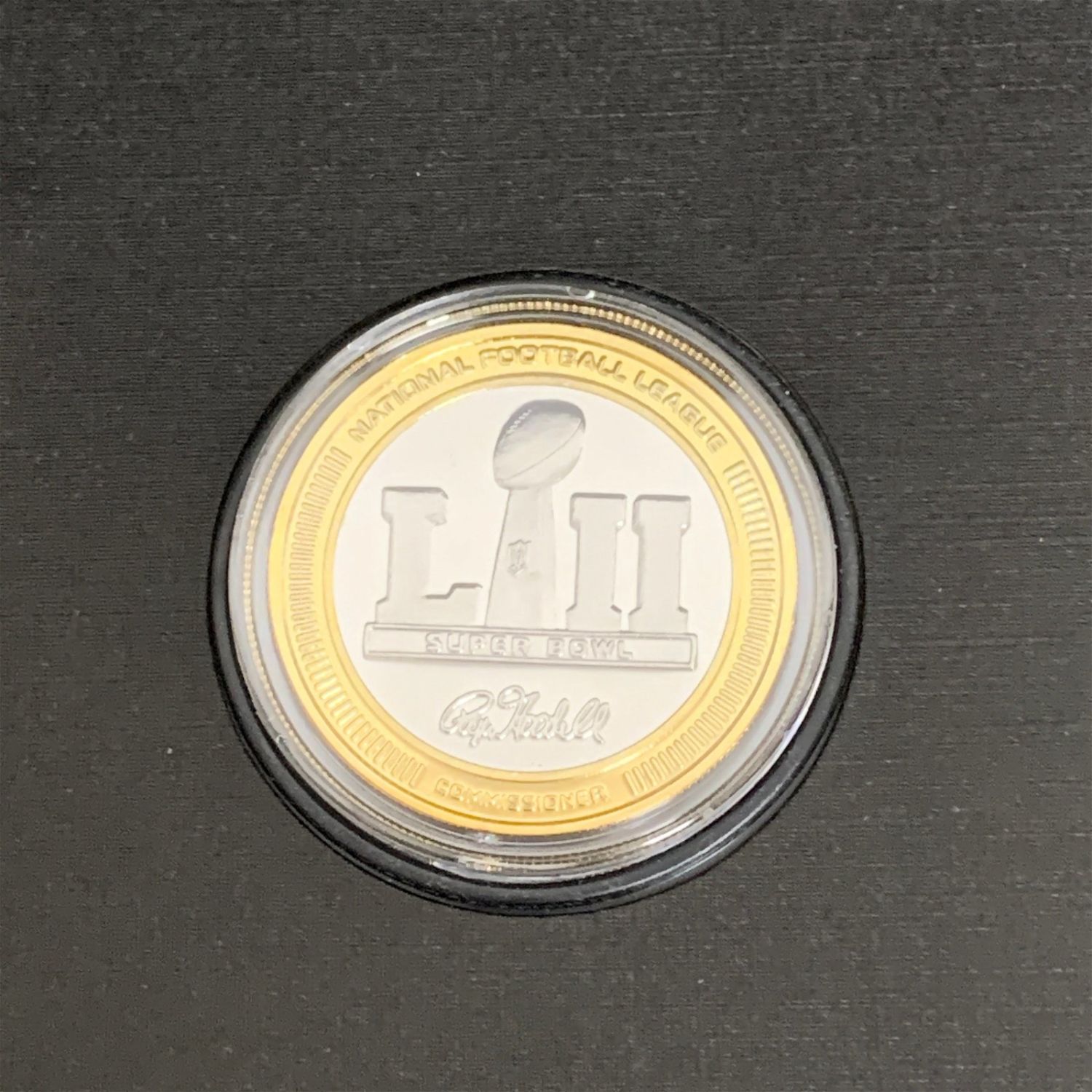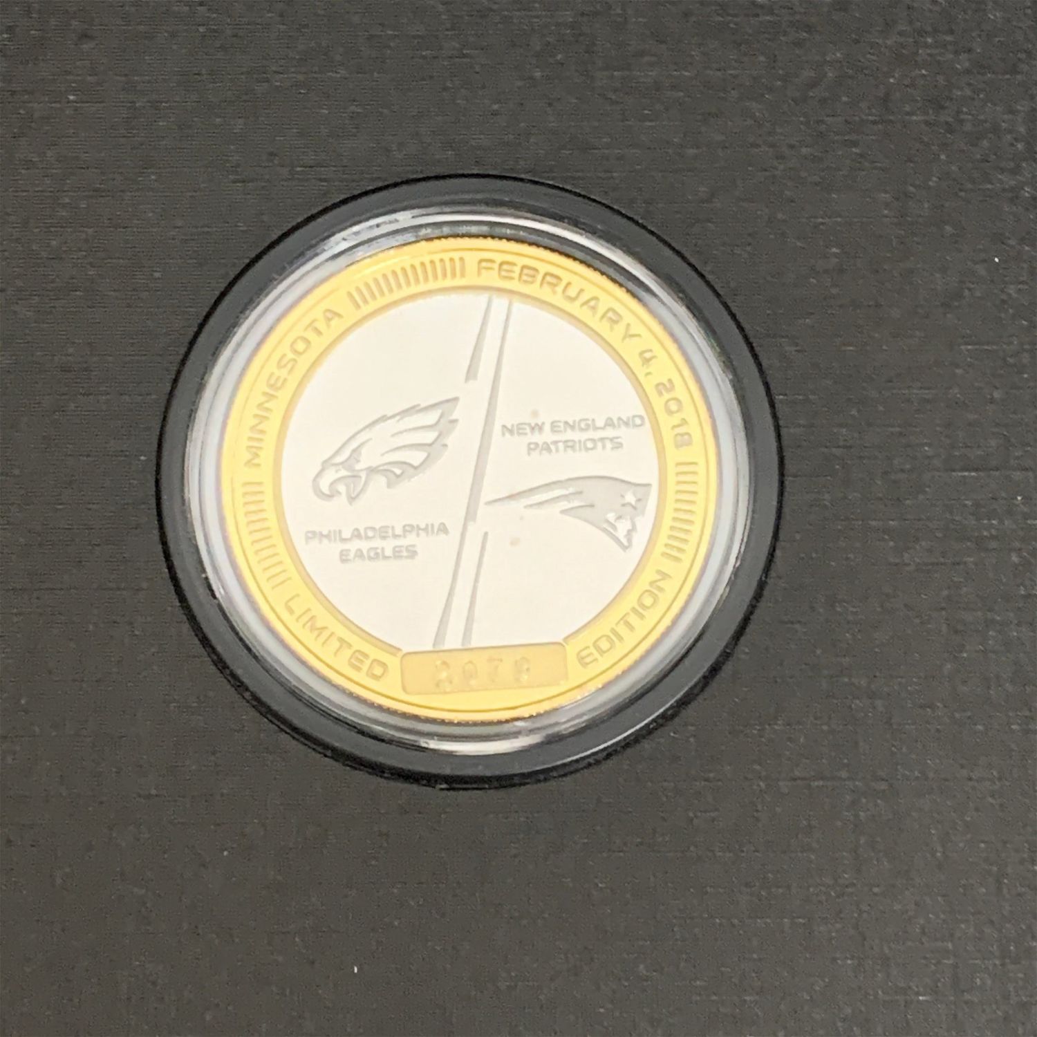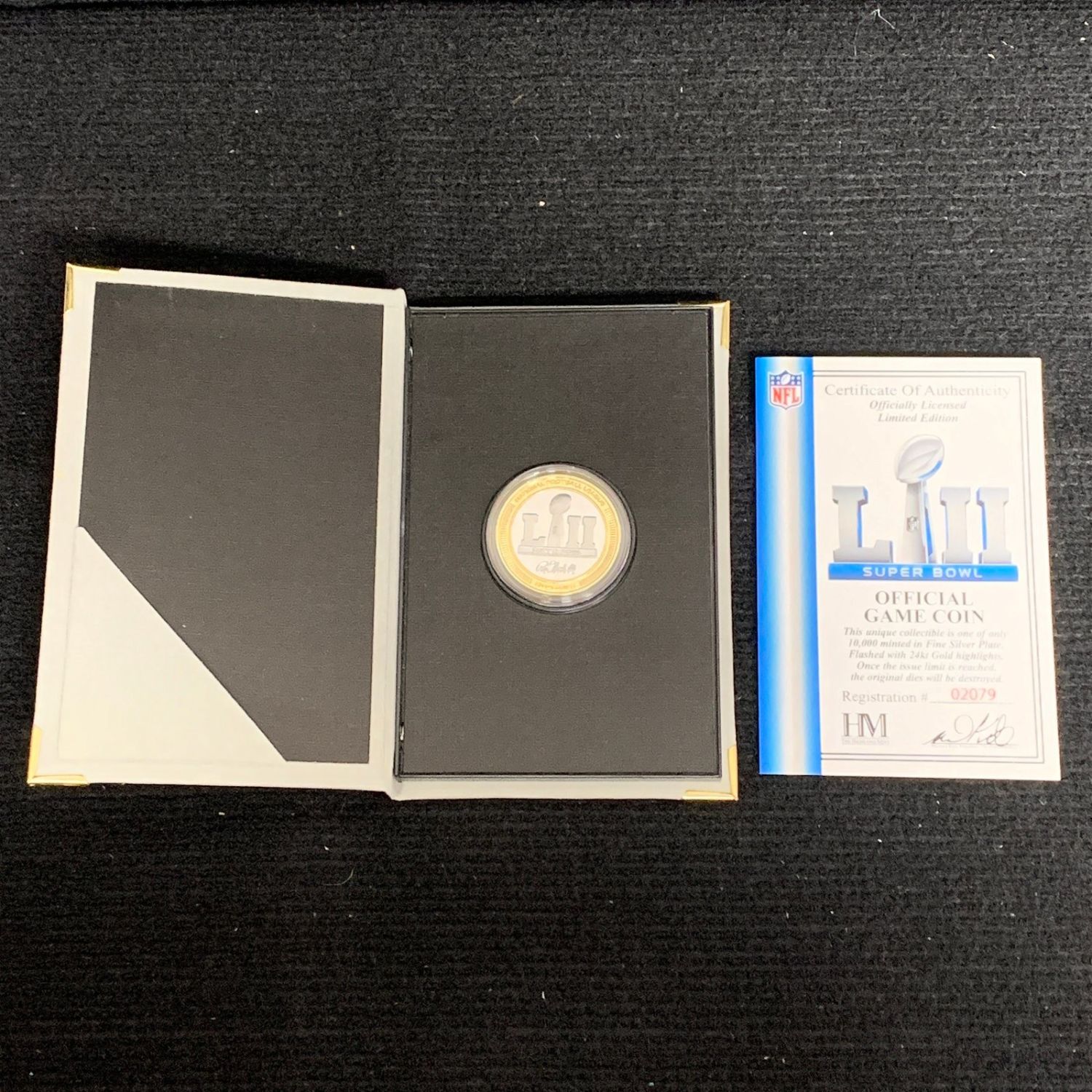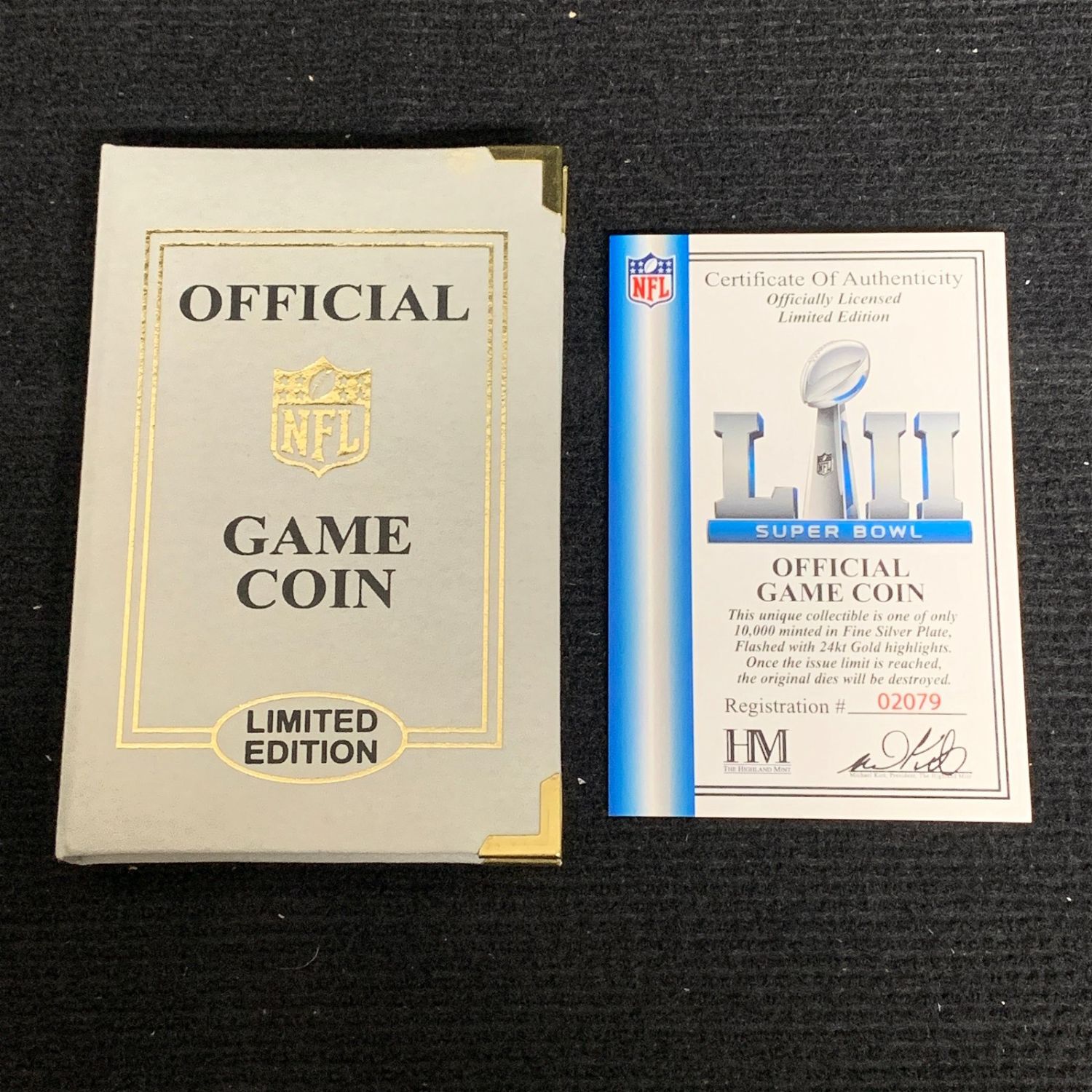 Limited Edition Super bowl 53 Game Coin. Minted in fine silver plate and finished with 24k gold highlights. Eagles Vs. Patriots coin. Includes COA from the NFL and the Highland Mint. We are a veteran owned company. Please look at the pictures carefully to determine what you believe the condition of collecitible is. We are currently accepting consignments. Email us a [email protected] or visit our website, www.ahauctionhouse.com.