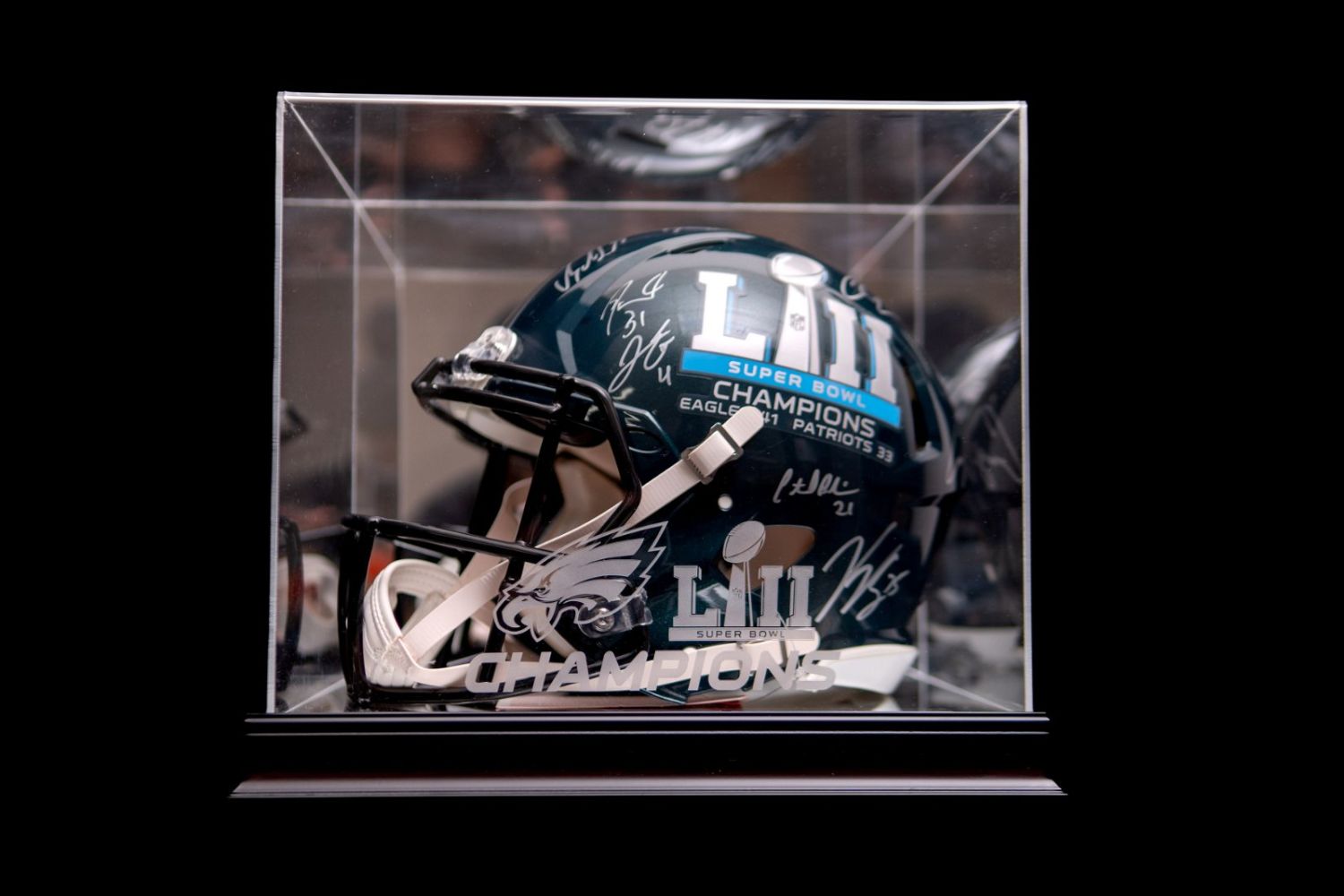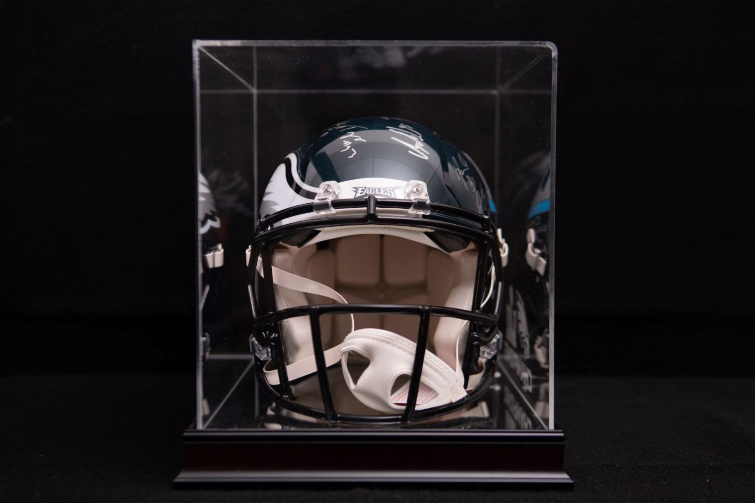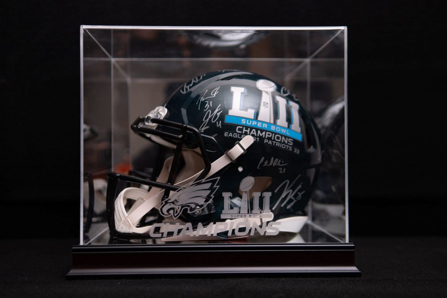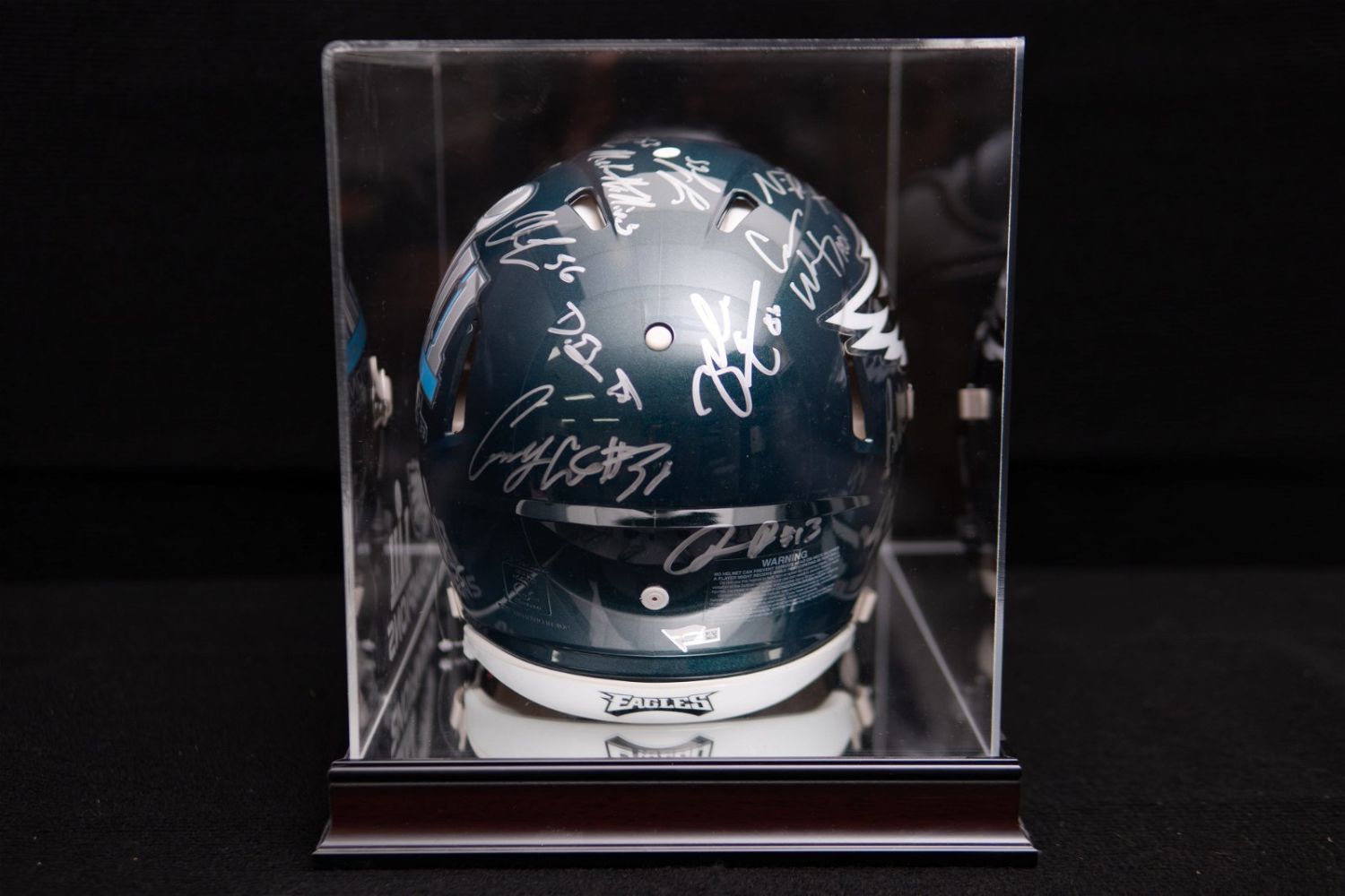 one of the highlights of the auction, a team signed, Philadelphia Eagles, Superbowl full-sized helmet! Signatures are beautiful with silver sharpie and a COA from Fanatics. This item is heavy and we do ship internationally, but we will also deliver within 60 miles of the Washington DC metro area if someone wants to meet and pick up, or you can pick it up at our office too!