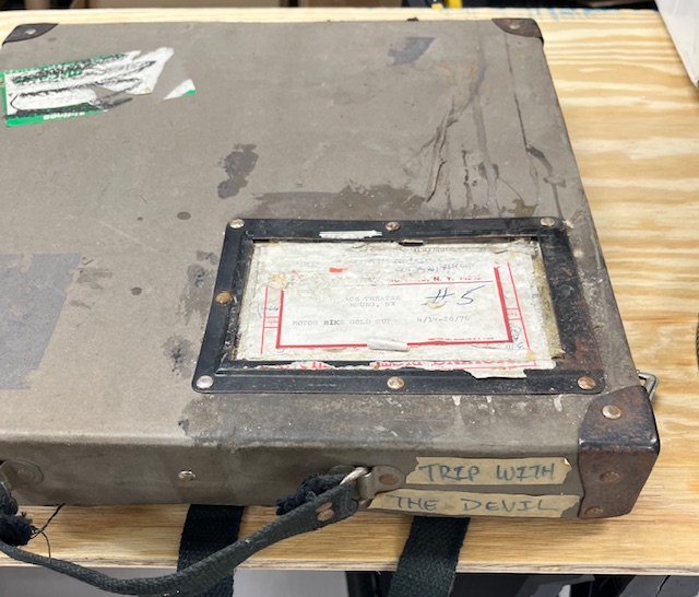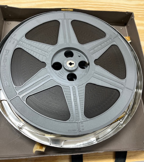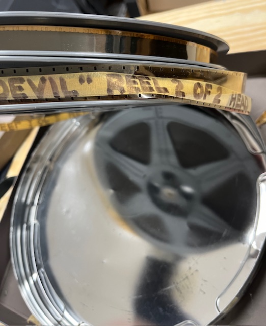 Two movie reels containing the movie, Trip with the Devil, in Silver Canister and case.