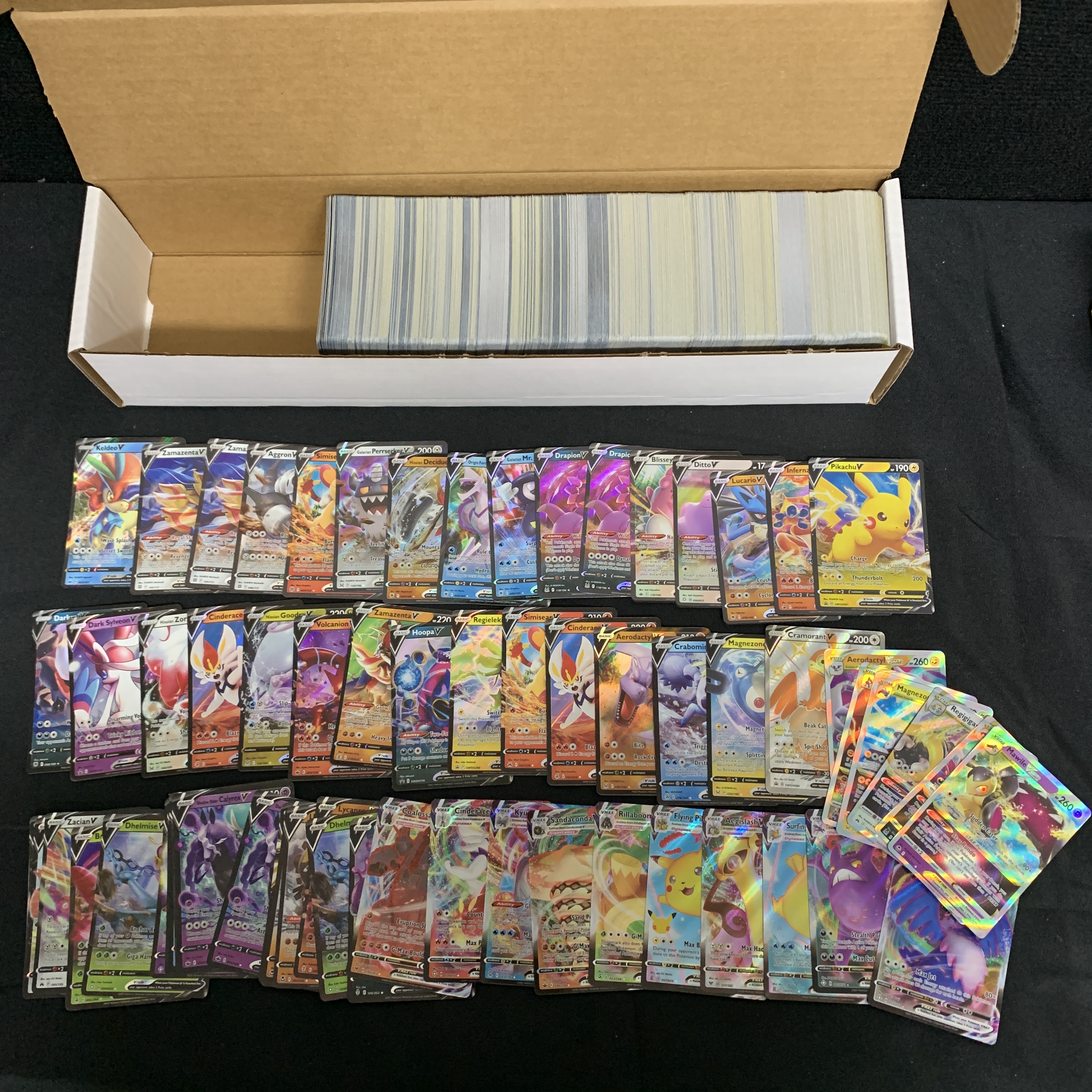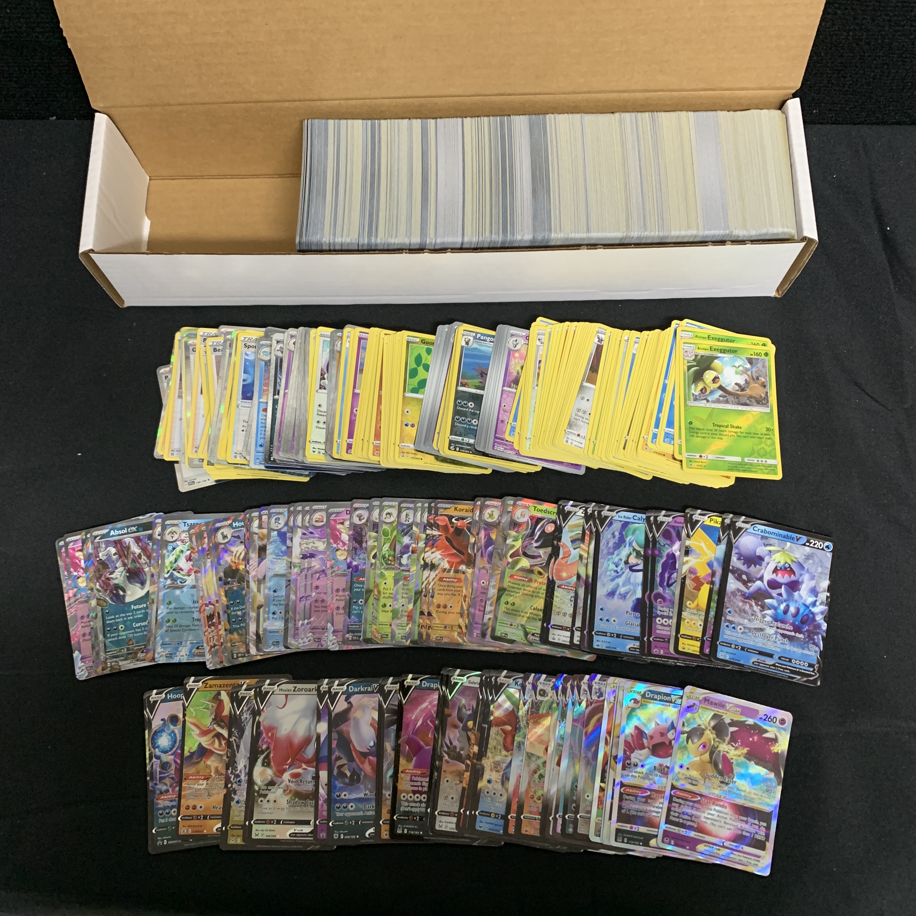 Approximately 1200 Pokemon Cards includes Vstar, Vmax, 50 EX, 50 Vs, 100 Holos, 100 Reverse Holos. Cards are from various years and sets We are a veteran owned company. Please look at the pictures carefully to determine what you believe the condition of collectible is. We are currently accepting consignments. Email us a [email protected] or visit our website, www.ahauctionhouse.com. We are currently seeking all types of collectibles.