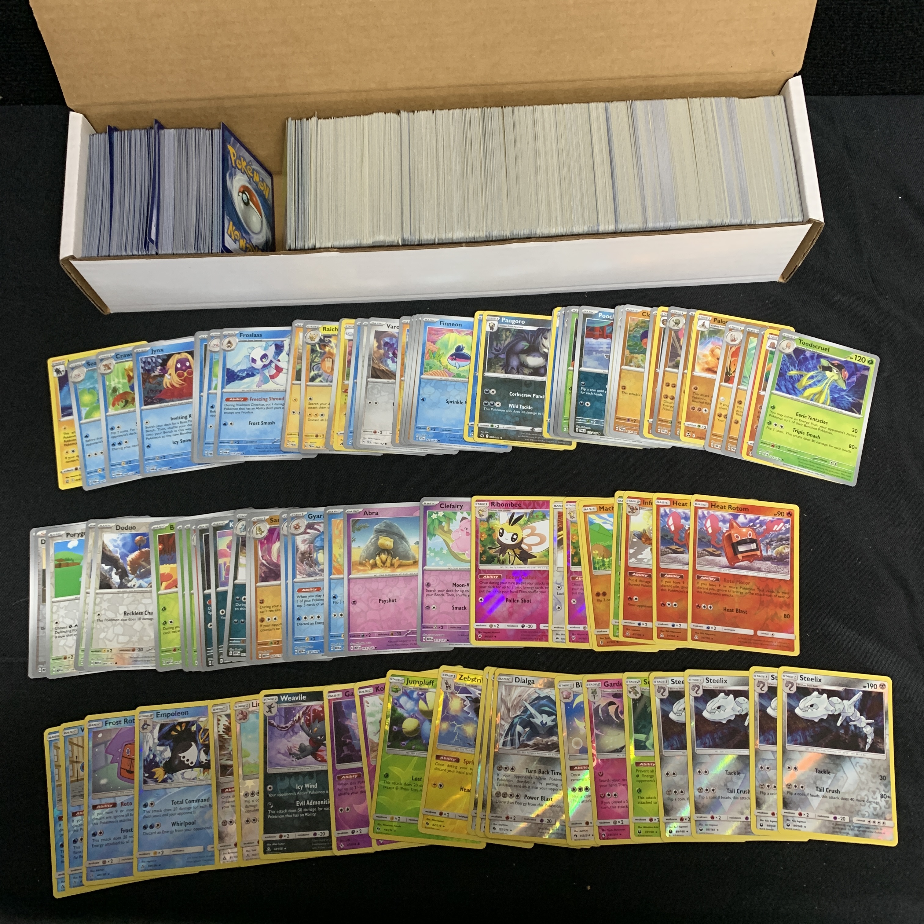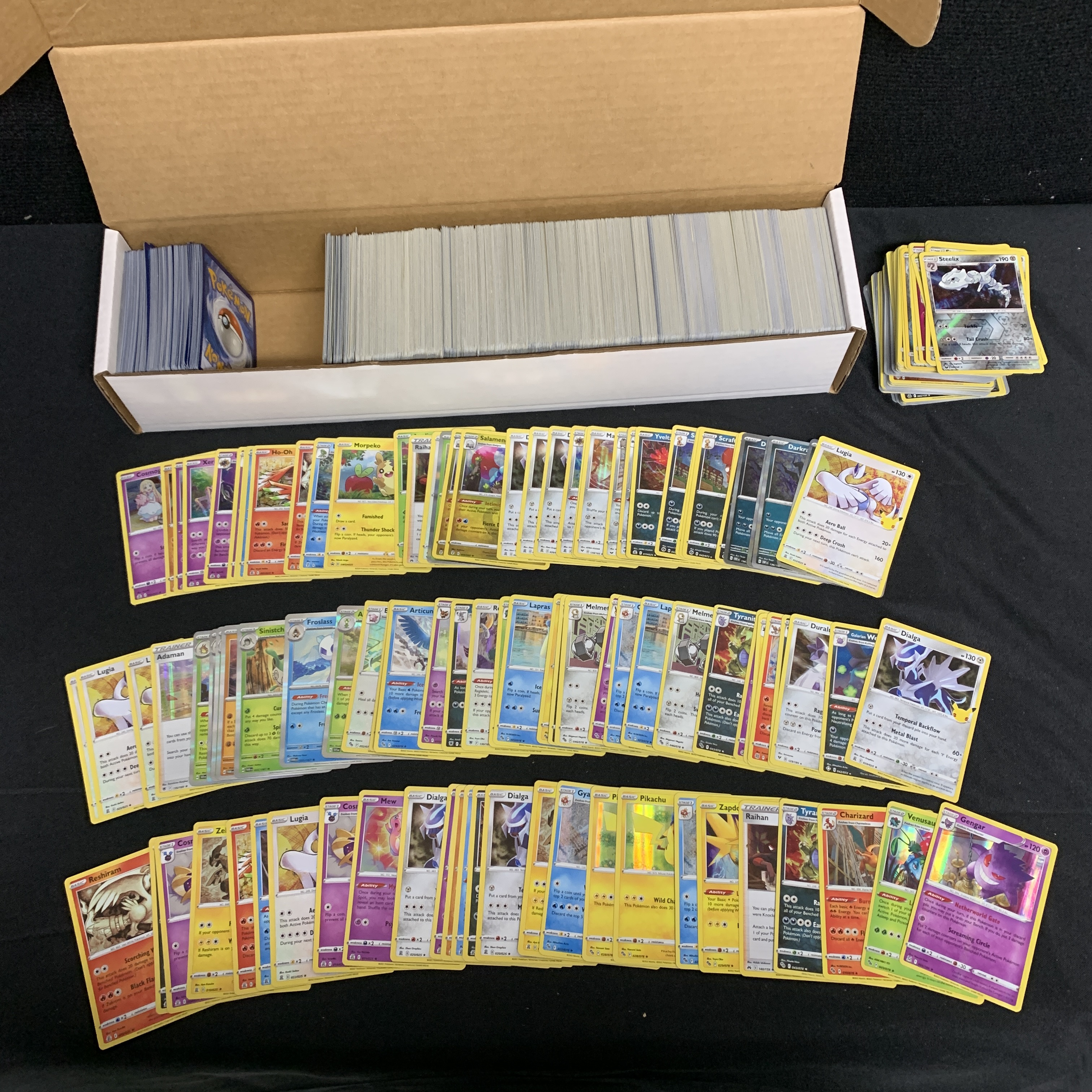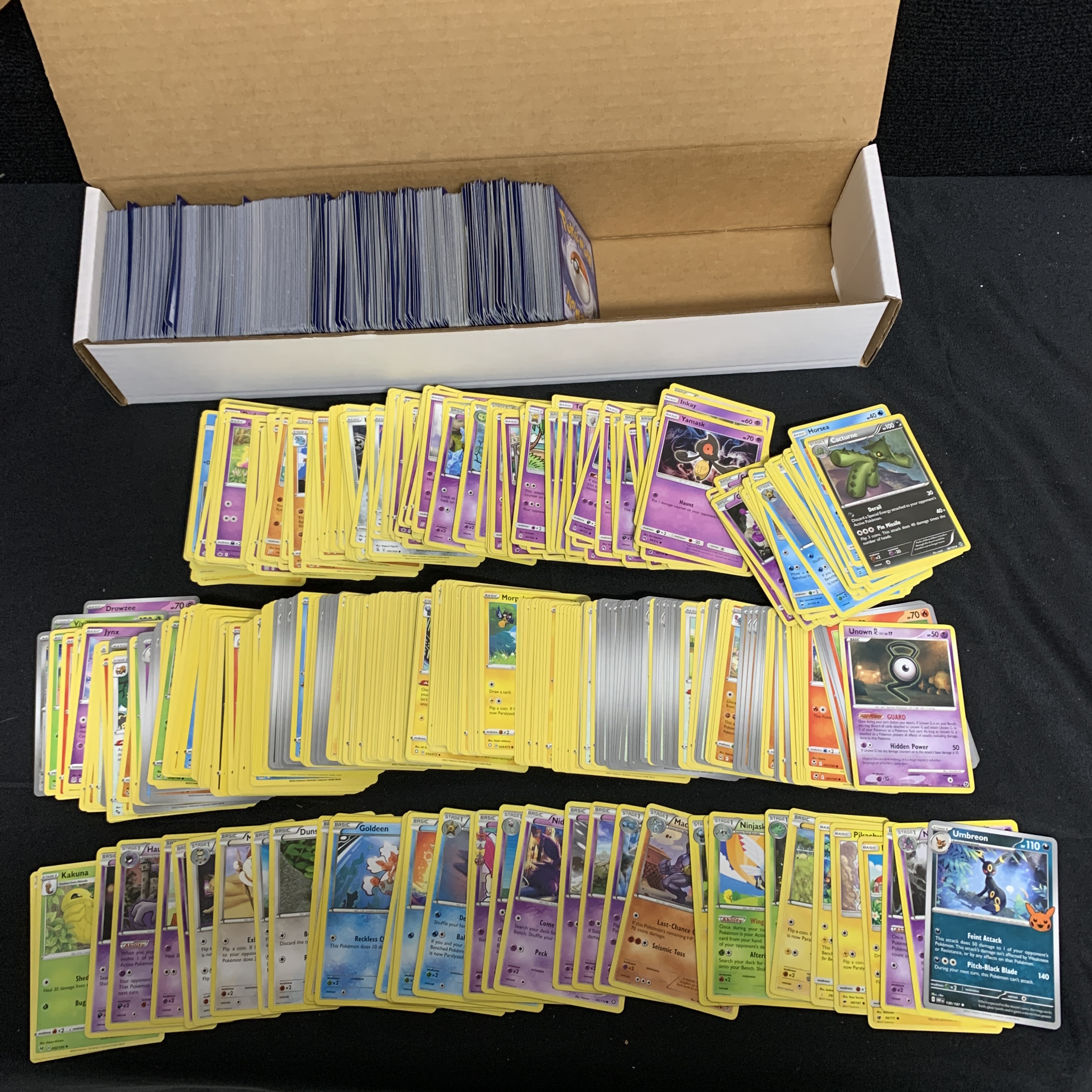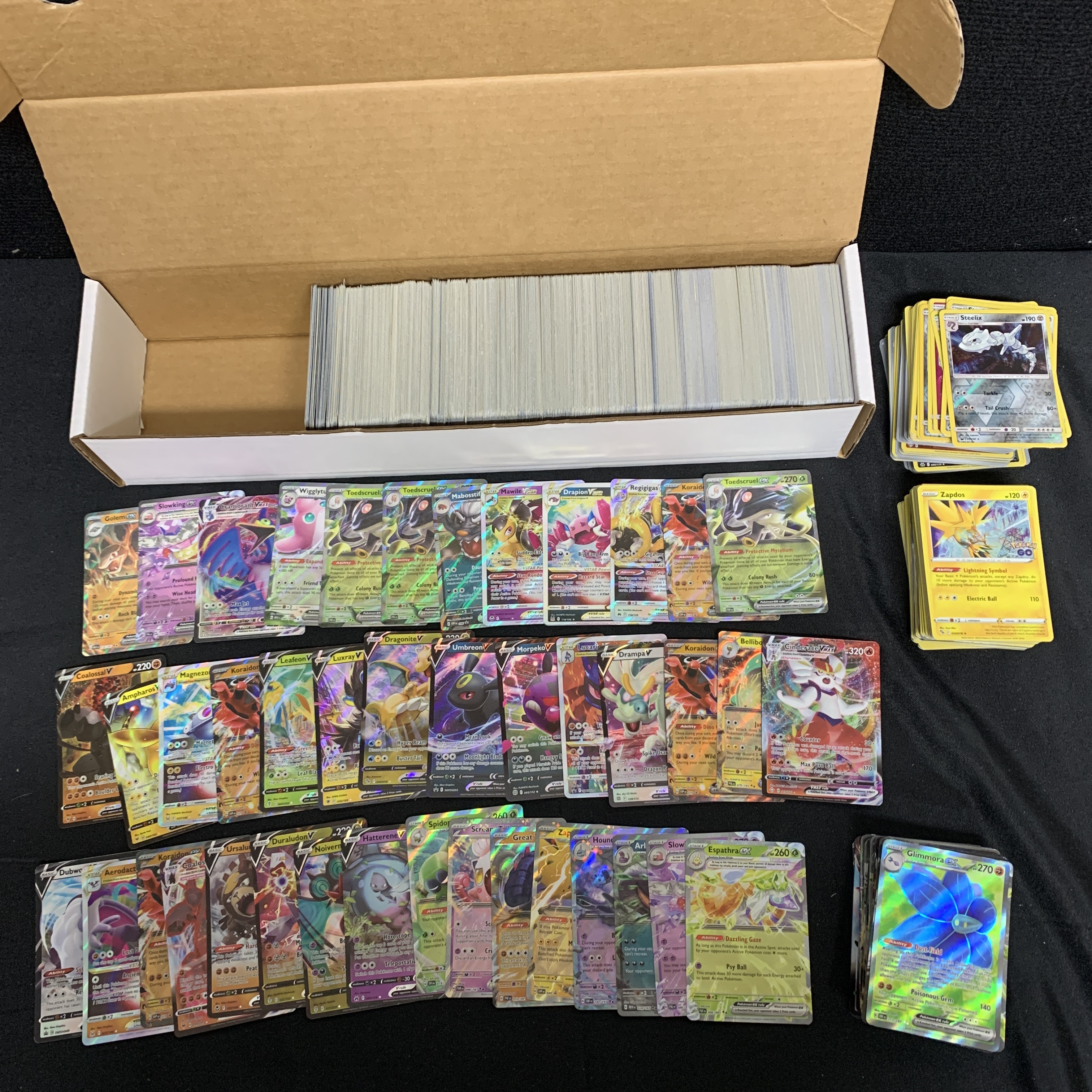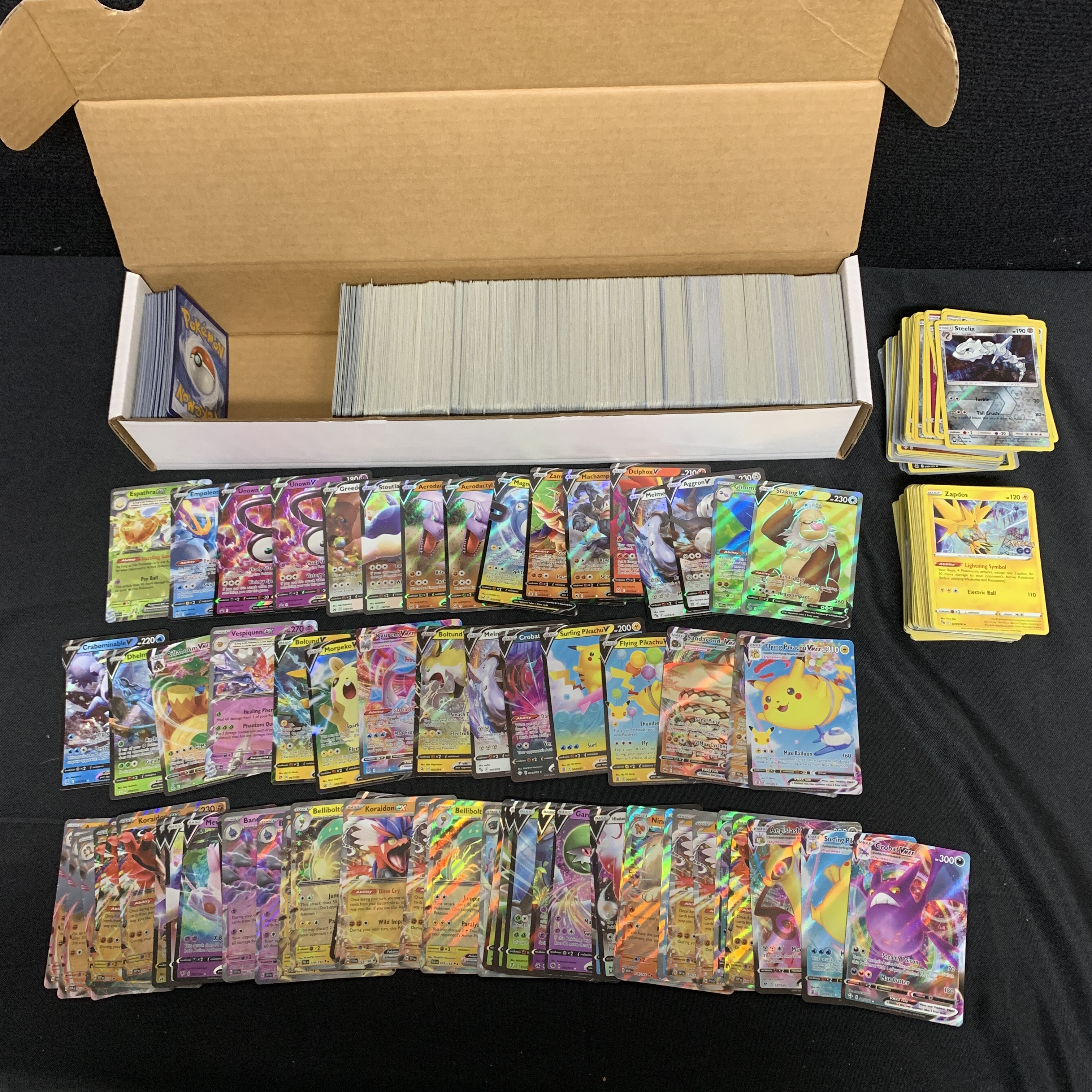 Approximately 1200 Pokemon Cards includes Vstar, Vmax, 50 EX, 50 Vs, 100 Holos, 100 Reverse Holos. Cards are from various years and sets We are a veteran owned company. Please look at the pictures carefully to determine what you believe the condition of collectible is. We are currently accepting consignments. Email us a [email protected] or visit our website, www.ahauctionhouse.com. We are currently seeking all types of collectibles.