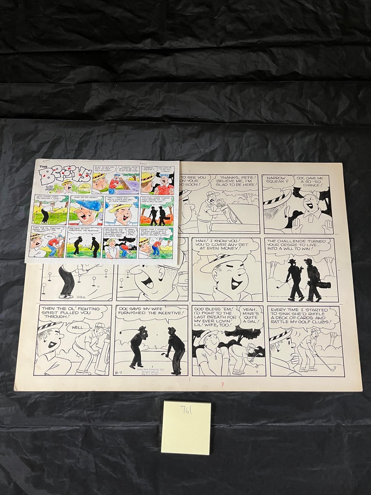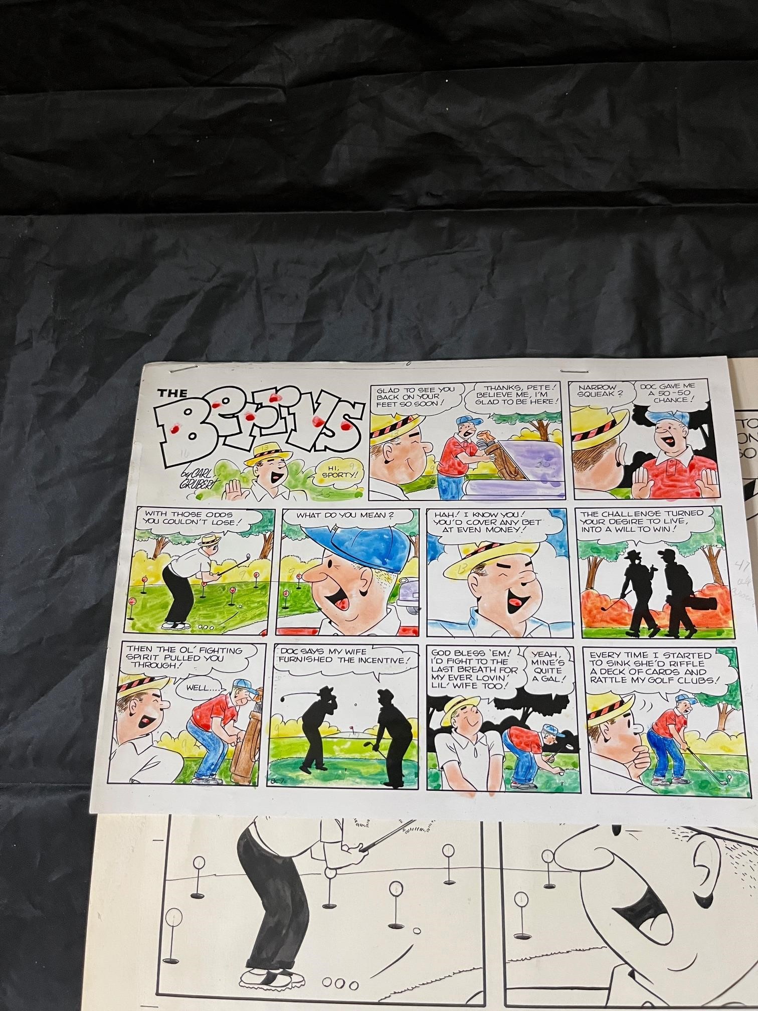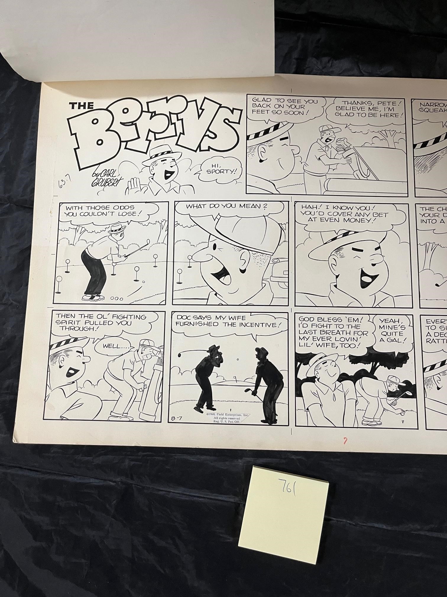 Wow, Original Comic Daily Strip art by Carl Grubert. Also contains the original color pencils page. This original comic strip art was printed on August 7, 1960. Carl Grubert ran the Berry’s daily comic strip from 1942-1974. Please look at photos carefully. All sales are final. Items sold as is. We offer virtual and in person previews of any lots up until auction day. By placing a bid you agree to allow us to charge the card on file with hi-bid to complete your purchase and to ship items to you if you are not picking items up at our office. We are a veteran owned company. We are currently accepting assignments. Please contact us at [email protected] for more information.