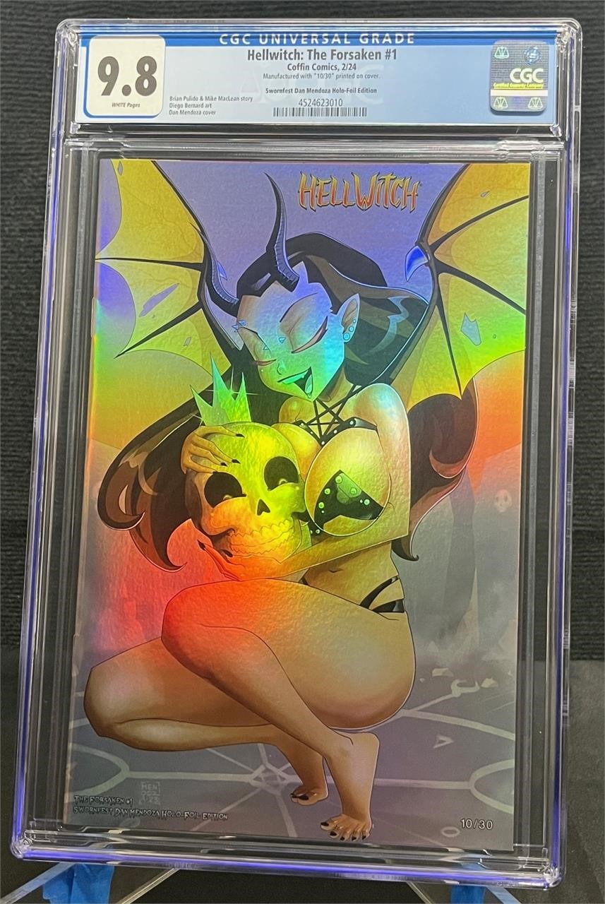 Swornfest Dan Mendoza Foil Variant individually numbered 10/30 and graded by CGC a 9.8 All items are sold as is. Please look at pictures carefully to determine what you believe are the condition of each lot. By choosing which card to use to register to bid, you authorize us to use the card on file that you used at the time of registration.at the end of the auction to pay for any lots and shipping you won. Happy Bidding and Best of luck! We offer in-house shipping.