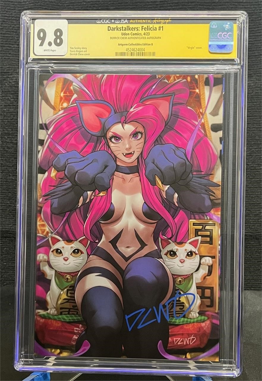 Virgin variant signed by Art Germ, authenticated by JSA and graded 9.8 by CGC. All items are sold as is. Please look at pictures carefully to determine what you believe are the condition of each lot. By choosing which card to use to register to bid, you authorize us to use the card on file that you used at the time of registration.at the end of the auction to pay for any lots and shipping you won. Happy Bidding and Best of luck! We offer in-house shipping.