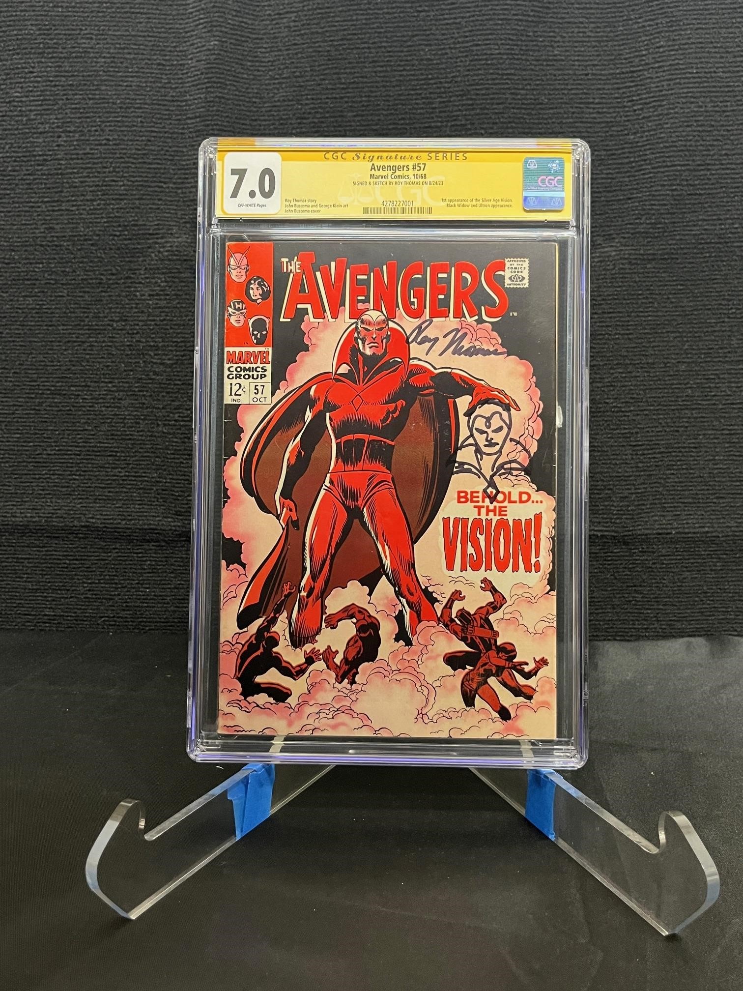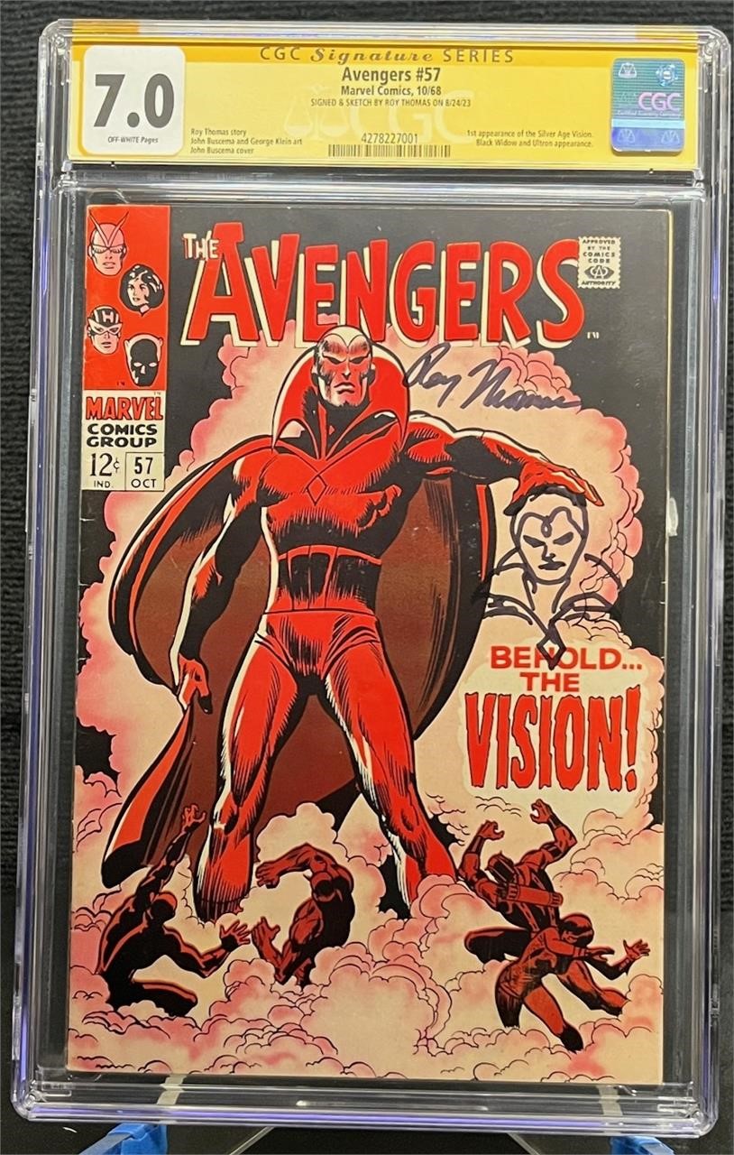 Avengers 57 1st appearance of Vision Signed with a sketch by Roy Thomas, creator of Vision, CGC Signature Series 7.0 All items are sold as is. Please look at pictures carefully to determine what you believe are the condition of each lot. By choosing which card to use to register to bid, you authorize us to use the card on file that you used at the time of registration.at the end of the auction to pay for any lots and shipping you won. Happy Bidding and Best of luck! We offer in-house shipping.