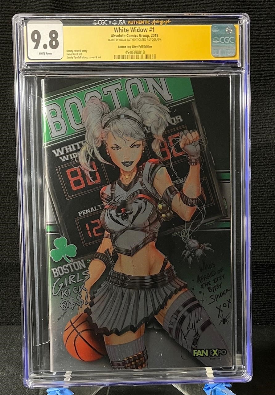 Boston Itsy Bitsy Foil Edition White Widow Limited Edition Foil Variant Comic certified Tyndall Signature by JSA and graded 9.8 by CGC. All items are sold as is. Please look at pictures carefully to determine what you believe are the condition of each lot. By choosing which card to use to register to bid, you authorize us to use the card on file that you used at the time of registration.at the end of the auction to pay for any lots and shipping you won. Happy Bidding and Best of luck! We offer in-house shipping.
