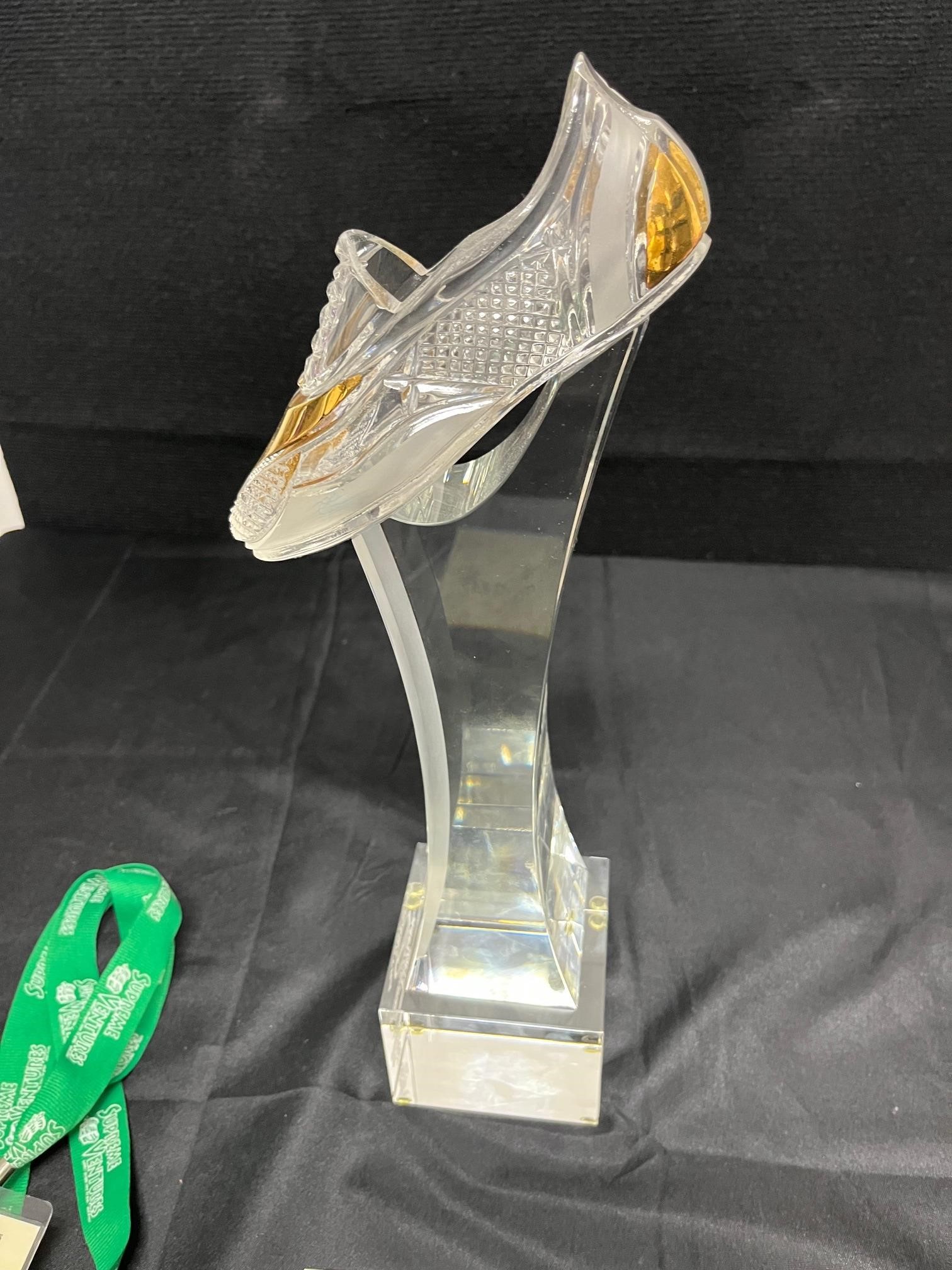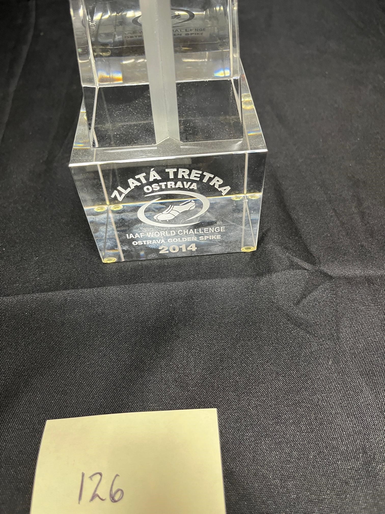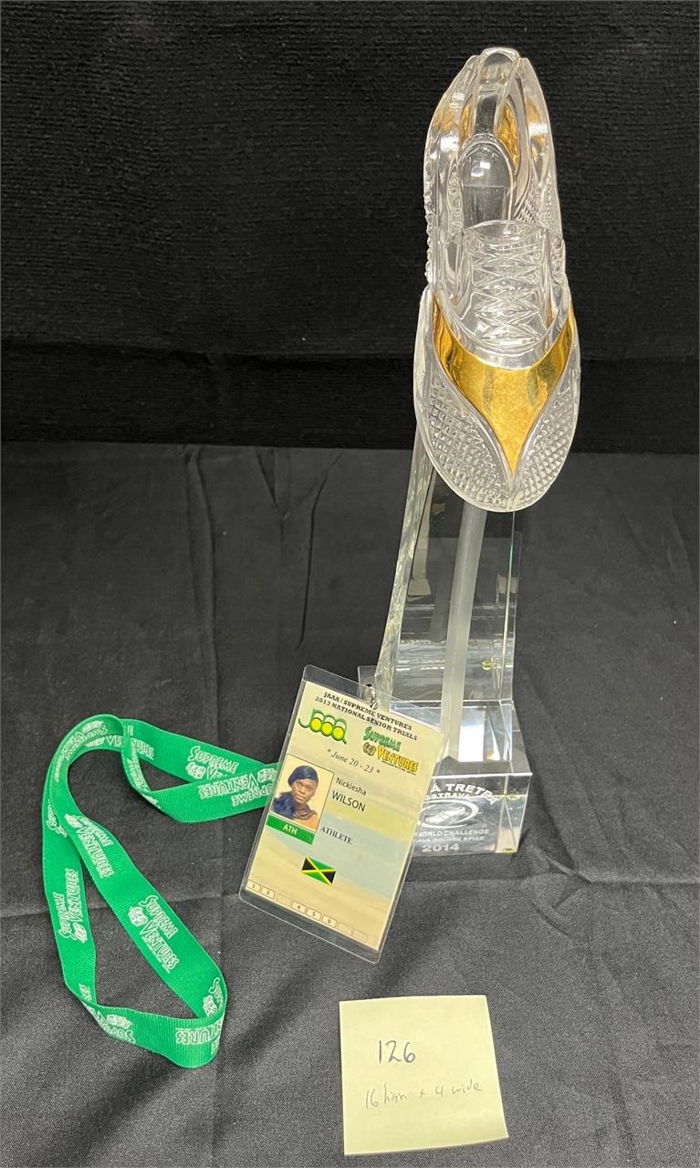 The item comes with the tournament credentials of Bahama international track and field member Nickiesha Wilson. This item is tall and heavy. It is a premium international competition award. These types of individual athletic achievement awards rarely come to market. This item is tall and heavy. It is a premium original MVP award, the equivalent of an MVP award for professional or international competition. These types of individual athletic achievement awards rarely come to market. All items are sold as is. Please look at pictures carefully to determine what you believe are the condition of each lot. By choosing which card to use to register to bid, you authorize us to use the card on file that you used at the time of registration.at the end of the auction to pay for any lots and shipping you won. Happy Bidding and Best of luck! We offer in-house shipping. We are currently accepting consignments.