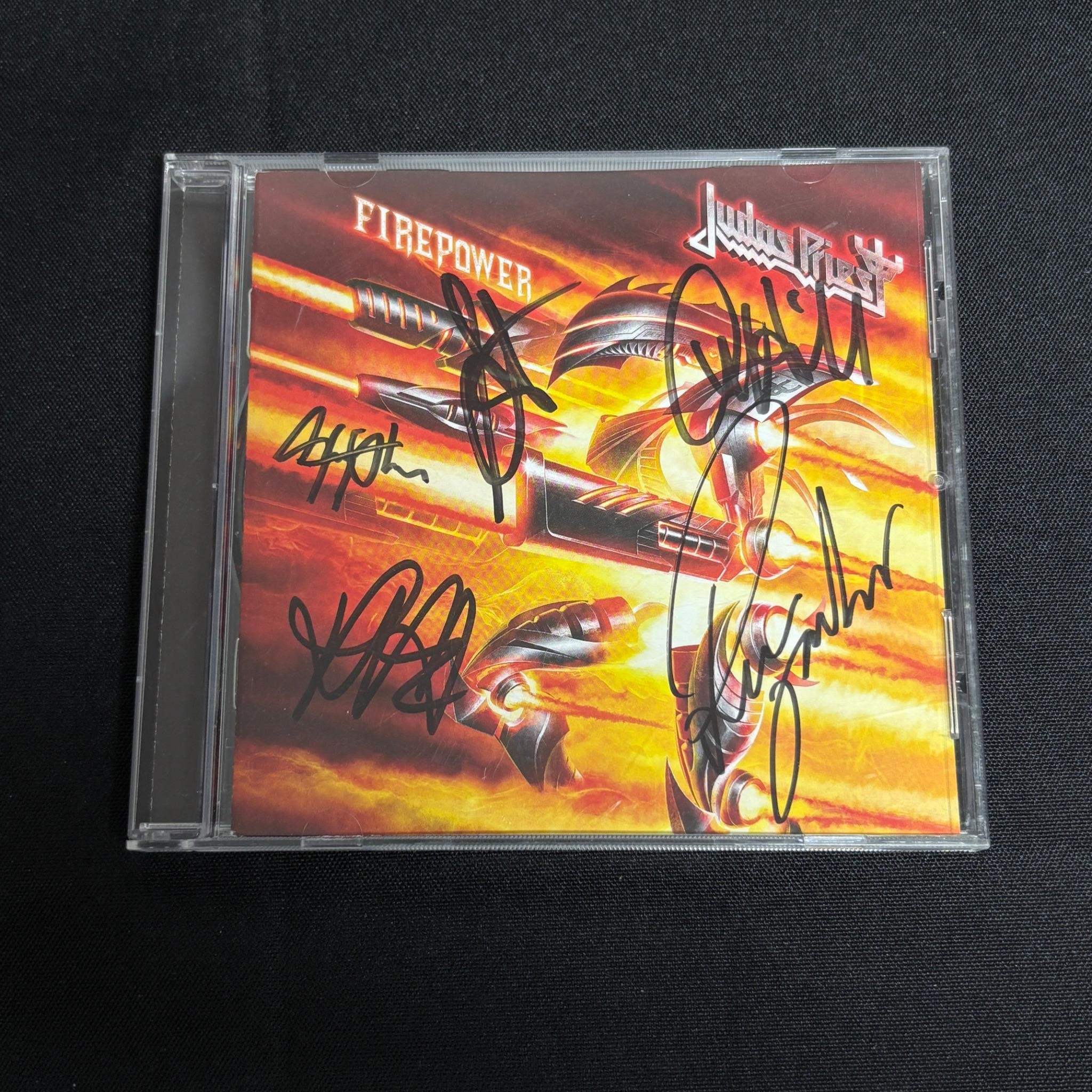 Signed by Rob Halford, Glenn Tipton, Ian Hill, Richie Faulkner and Scott Travis. Fire Power CD. All items are sold as is. Please look at pictures carefully to determine what you believe are the condition of each lot. By choosing which card to use to register to bid, you authorize us to use the card on file that you used at the time of registration.at the end of the auction to pay for any lots and shipping you won. Happy Bidding and Best of luck! We offer in-house shipping. We are currently accepting consignments.