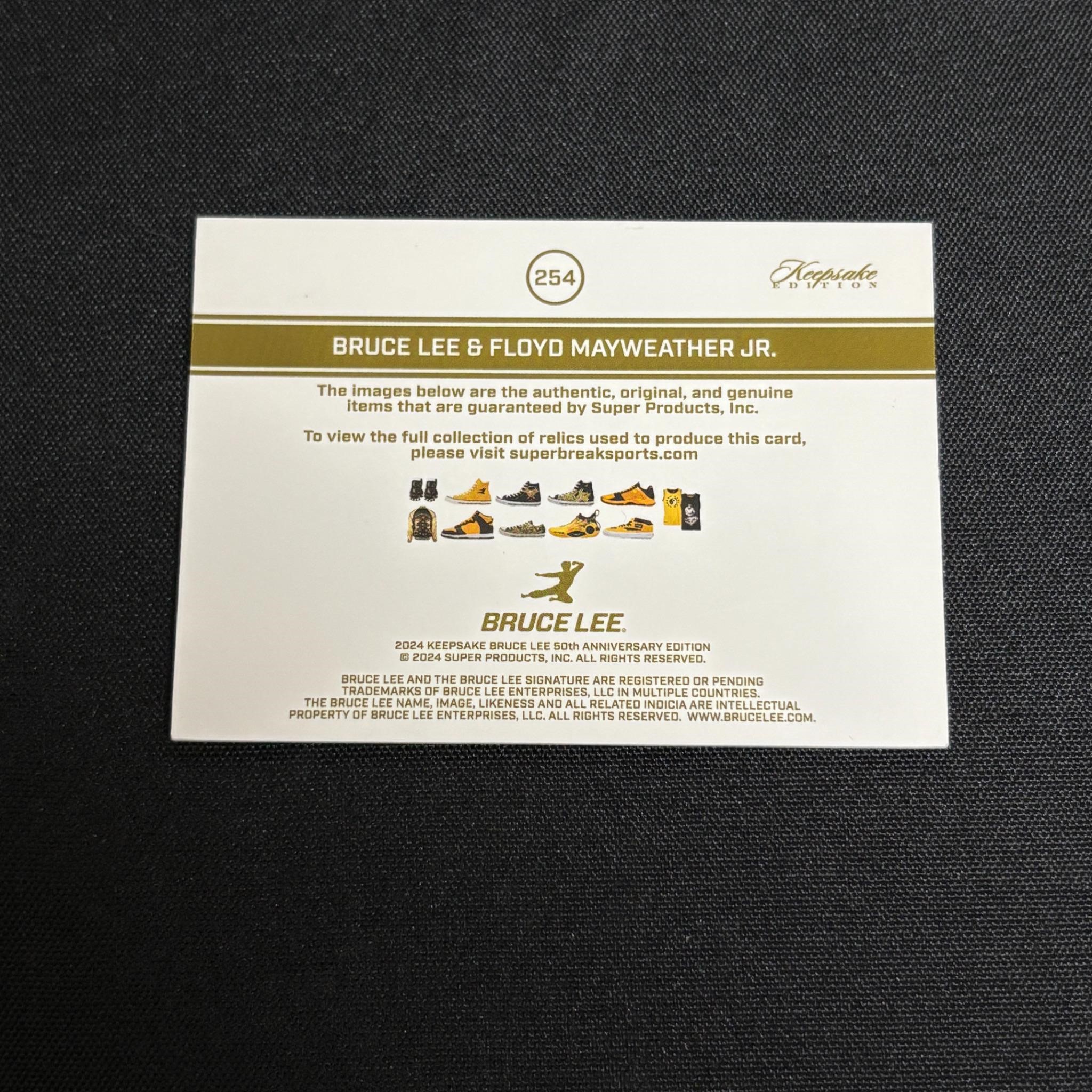 2024 Bruce Lee Keepsake Edition Relic Card Featuring Bruce Lee and Floyd Mayweather. Double Relic Card. All items are sold as is. Please look at pictures carefully to determine what you believe are the condition of each lot. By choosing which card to use to register to bid, you authorize us to use the card on file that you used at the time of registration.at the end of the auction to pay for any lots and shipping you won. Happy Bidding and Best of luck! We offer in-house shipping. We are currently accepting consignments.