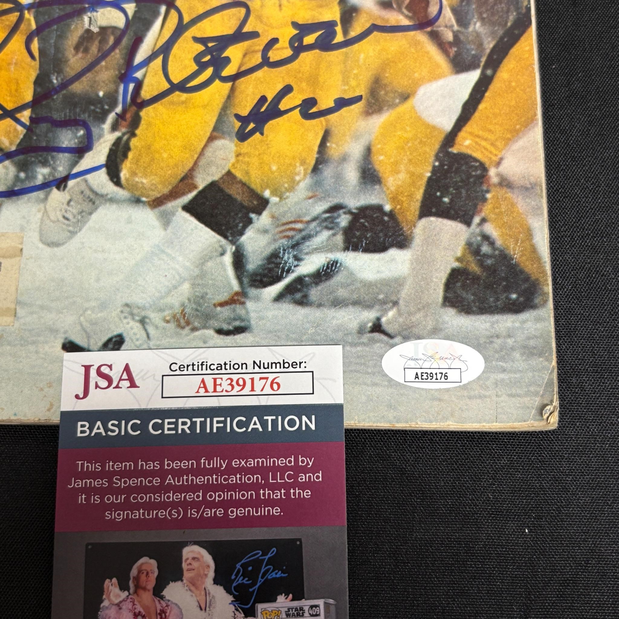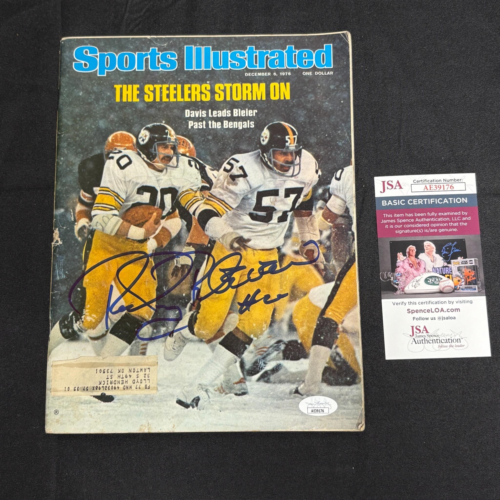Rocky Bleier Signed Sports Illustrated Magazine, JSA COA. American Football Player for the Pittsburg Steelers. Played in Four Super Bowl Championships. All items are sold as is. Please look at pictures carefully to determine what you believe are the condition of each lot. By choosing which card to use to register to bid, you authorize us to use the card on file that you used at the time of registration.at the end of the auction to pay for any lots and shipping you won. Happy Bidding and Best of luck! We offer in-house shipping. We are currently accepting consignments.