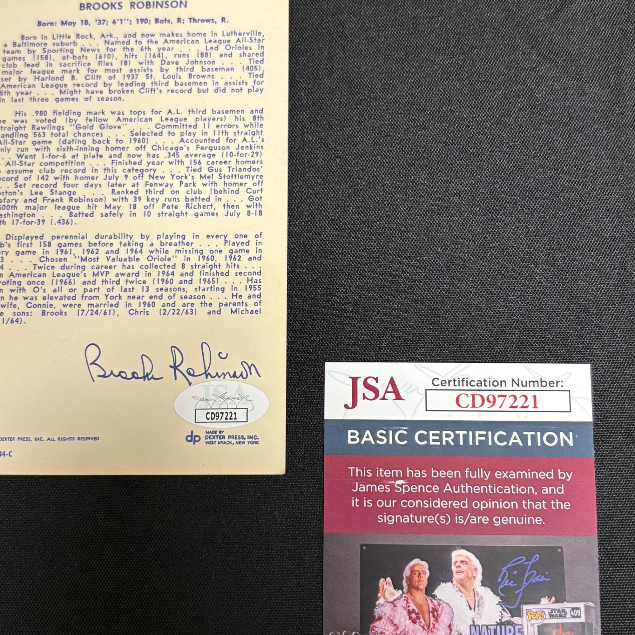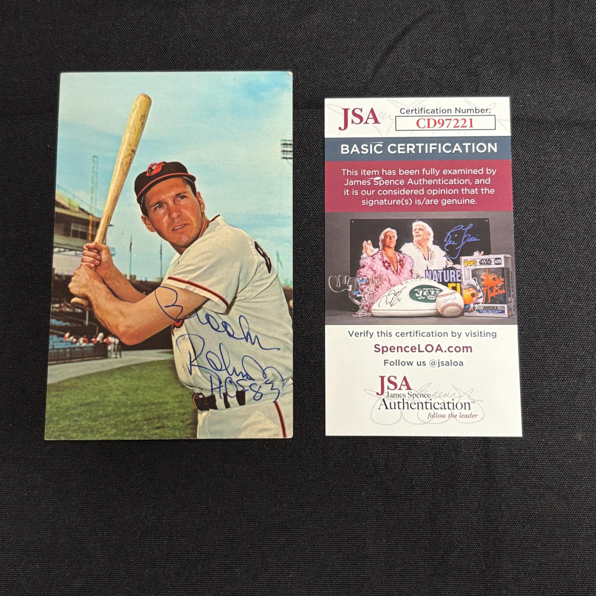 Photo Signed by Baseball Player Brooks Robinson. Played his entire career for the Baltimore Orioles. Was inducted into the Hall of Fame in 1983. All items are sold as is. Please look at pictures carefully to determine what you believe are the condition of each lot. By choosing which card to use to register to bid, you authorize us to use the card on file that you used at the time of registration.at the end of the auction to pay for any lots and shipping you won. Happy Bidding and Best of luck! We offer in-house shipping. We are currently accepting consignments.