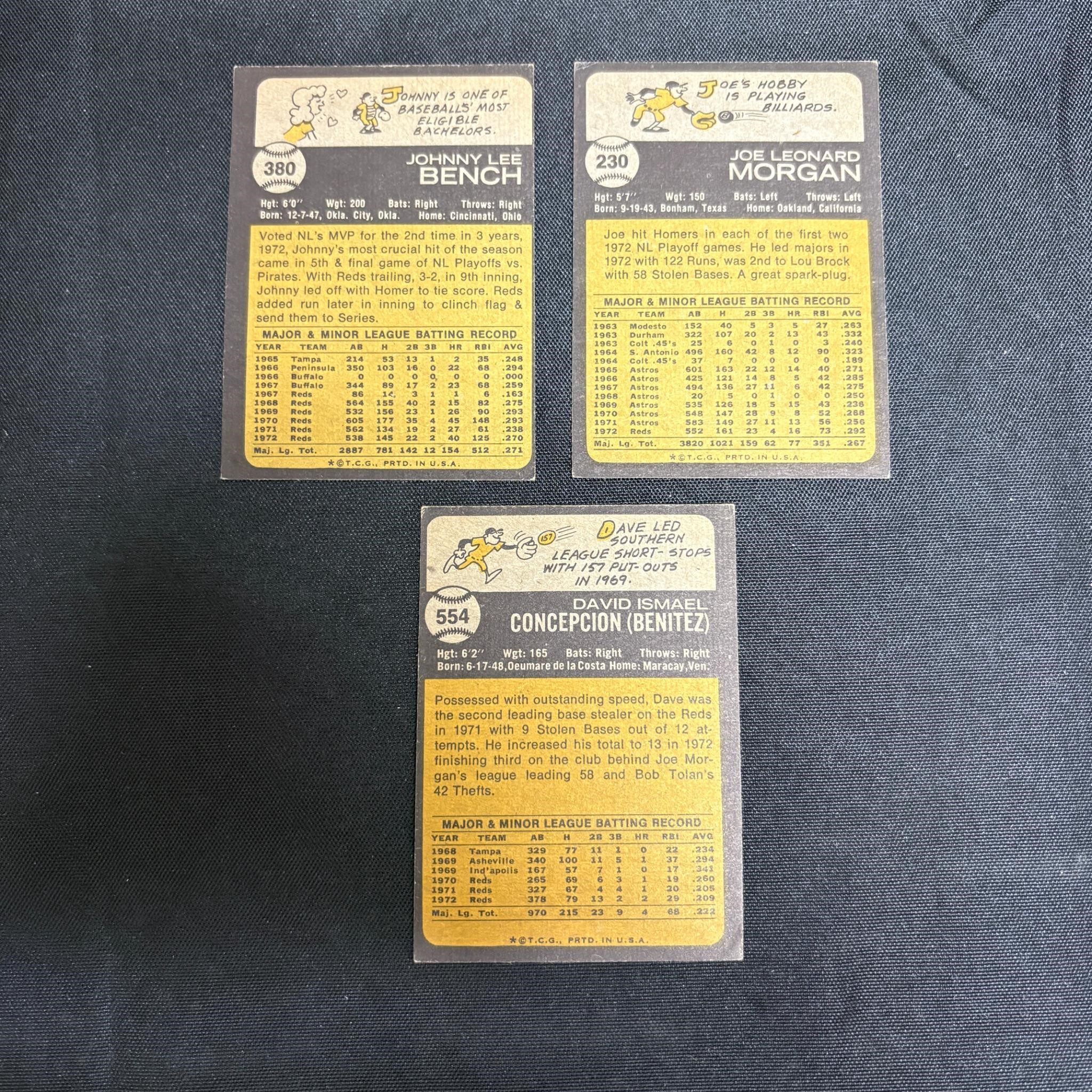 1973 Topps Baseball Cards. Johnny Bench #380, Joe Morgan #230, and Dave Concepcion #554. All items are sold as is. Please look at pictures carefully to determine what you believe are the condition of each lot. By choosing which card to use to register to bid, you authorize us to use the card on file that you used at the time of registration.at the end of the auction to pay for any lots and shipping you won. Happy Bidding and Best of luck! We offer in-house shipping. We are currently accepting consignments.