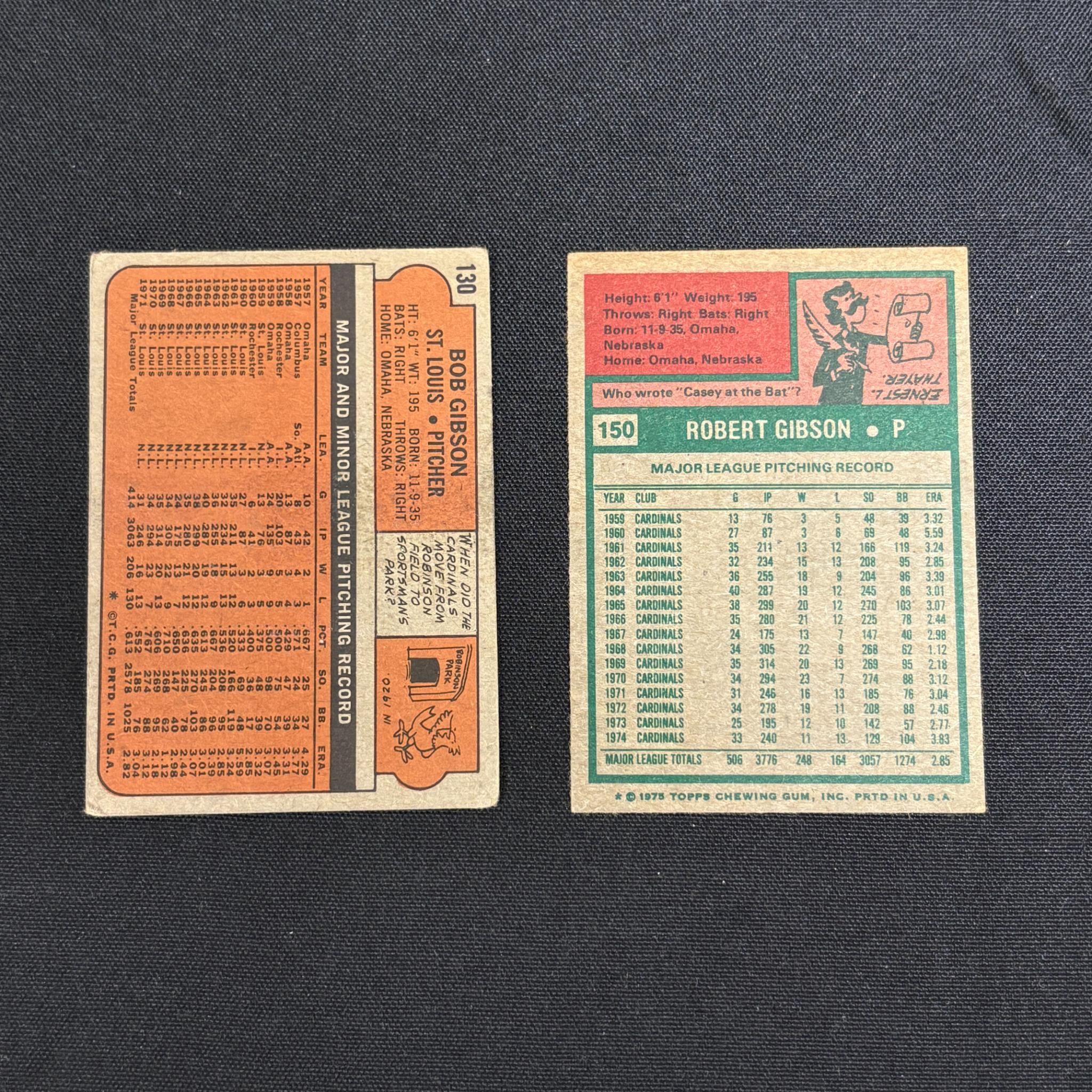 Bob Gibson #130, Bob Gibson #150. All items are sold as is. Please look at pictures carefully to determine what you believe are the condition of each lot. By choosing which card to use to register to bid, you authorize us to use the card on file that you used at the time of registration.at the end of the auction to pay for any lots and shipping you won. Happy Bidding and Best of luck! We offer in-house shipping. We are currently accepting consignments.