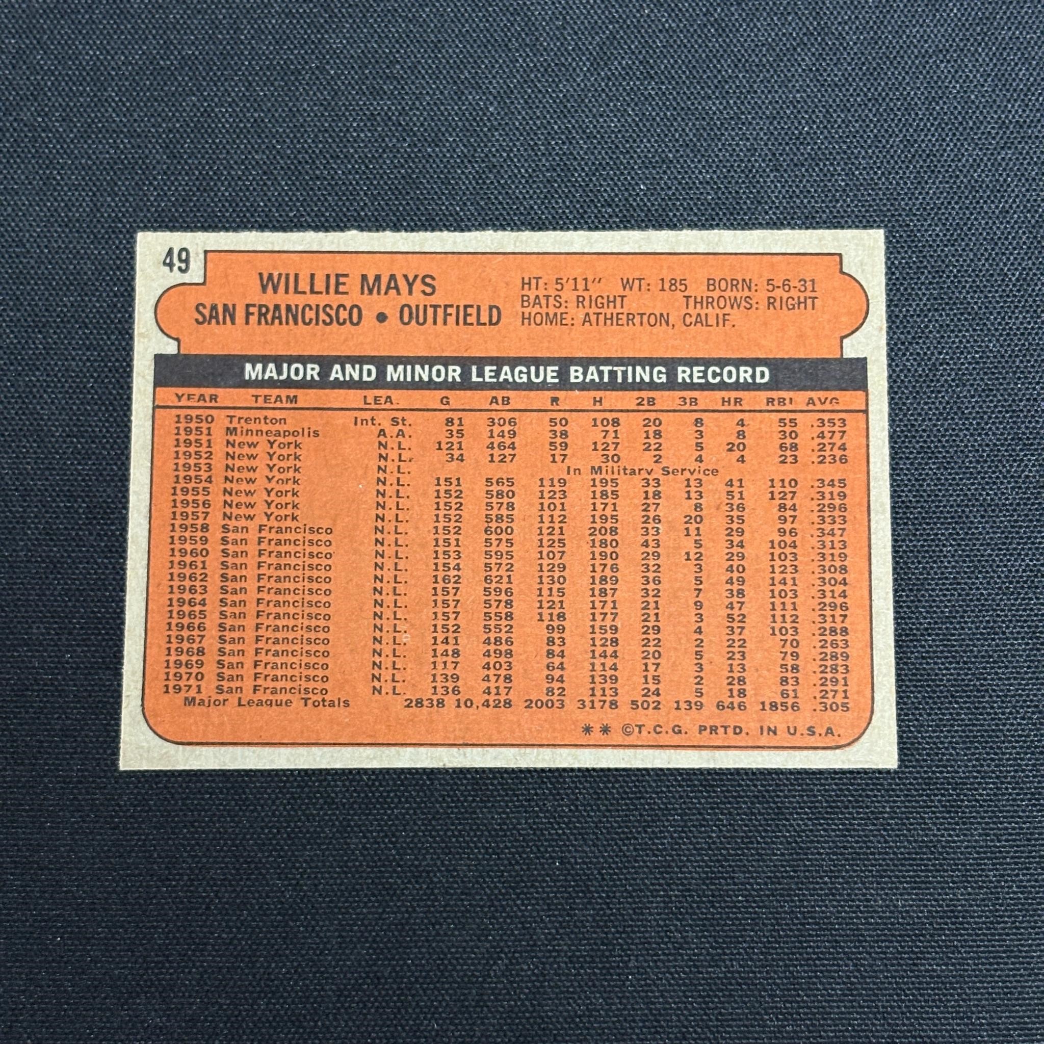 Willie Mays #49. All items are sold as is. Please look at pictures carefully to determine what you believe are the condition of each lot. By choosing which card to use to register to bid, you authorize us to use the card on file that you used at the time of registration.at the end of the auction to pay for any lots and shipping you won. Happy Bidding and Best of luck! We offer in-house shipping. We are currently accepting consignments.