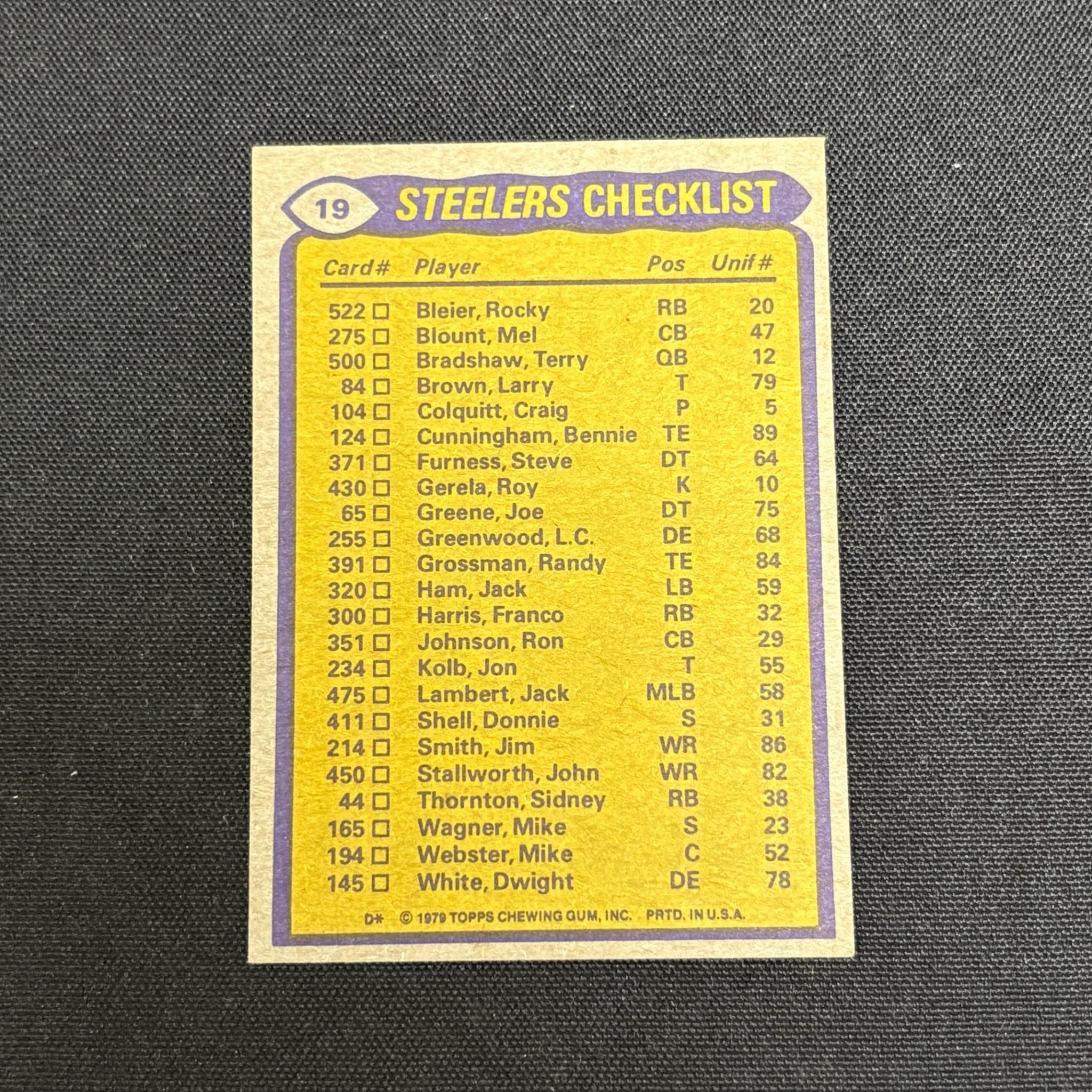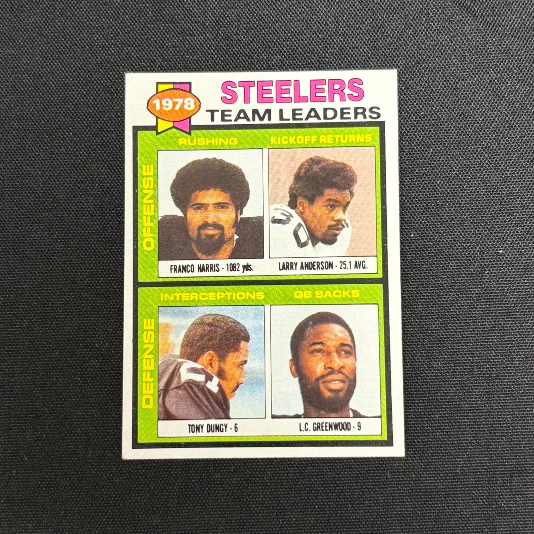 1979 Topps Football Card. Steelers Team leaders #19, Franco Harris, Larry Anderson, Tony Dungy, LC Greenwood. All items are sold as is. Please look at pictures carefully to determine what you believe are the condition of each lot. By choosing which card to use to register to bid, you authorize us to use the card on file that you used at the time of registration.at the end of the auction to pay for any lots and shipping you won. Happy Bidding and Best of luck! We offer in-house shipping. We are currently accepting consignments.