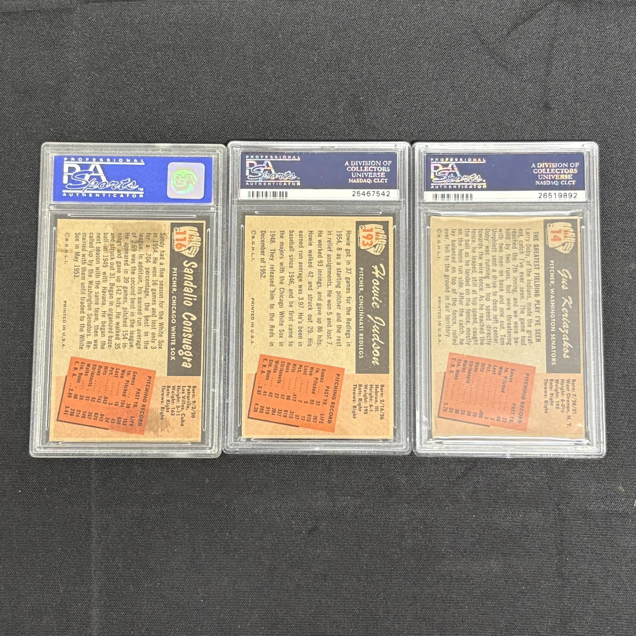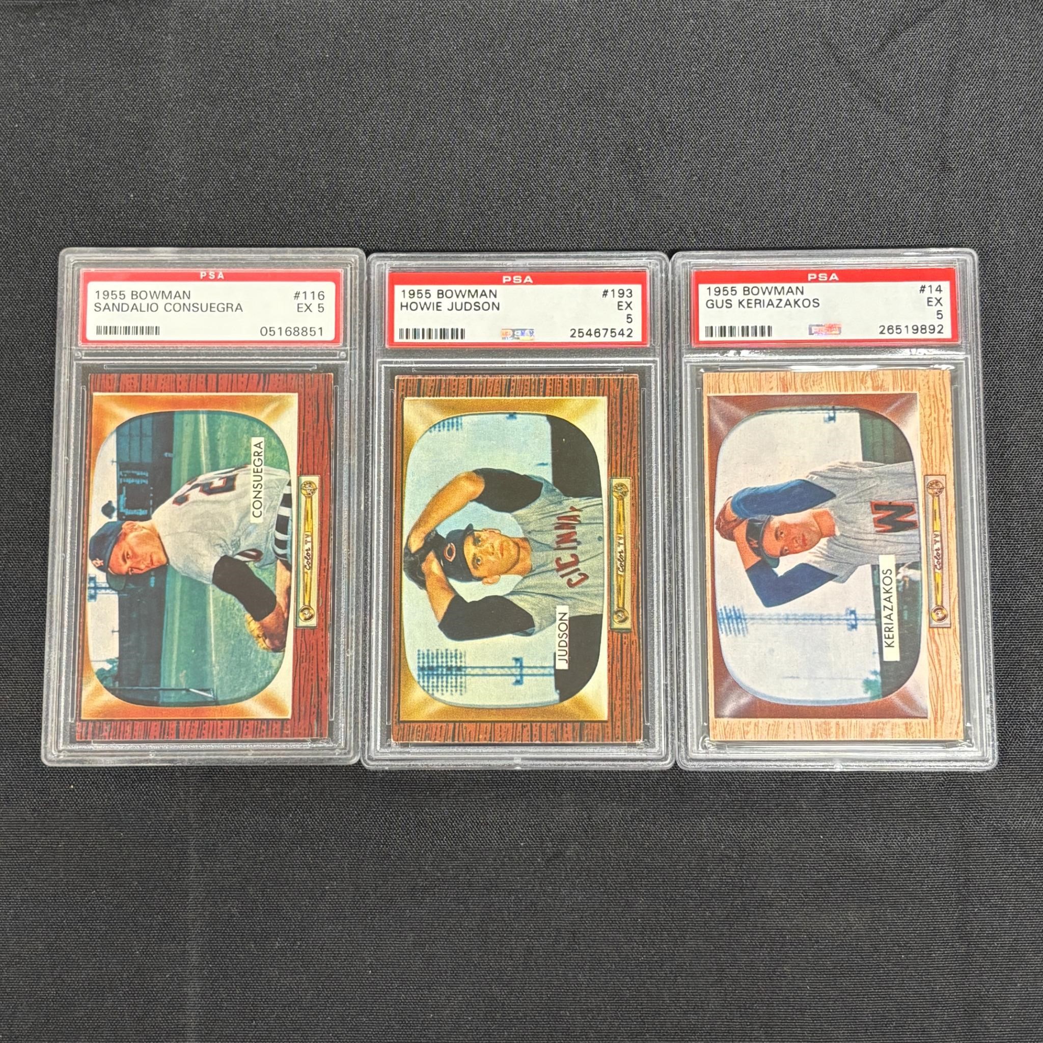 PSA 5 Graded 1955 Bowman Baseball Cards. Sandalio Consuegra #116, Howie Judson #193, Gus Keriazakos #14. All items are sold as is. Please look at pictures carefully to determine what you believe are the condition of each lot. By choosing which card to use to register to bid, you authorize us to use the card on file that you used at the time of registration.at the end of the auction to pay for any lots and shipping you won. Happy Bidding and Best of luck! We offer in-house shipping. We are currently accepting consignments.