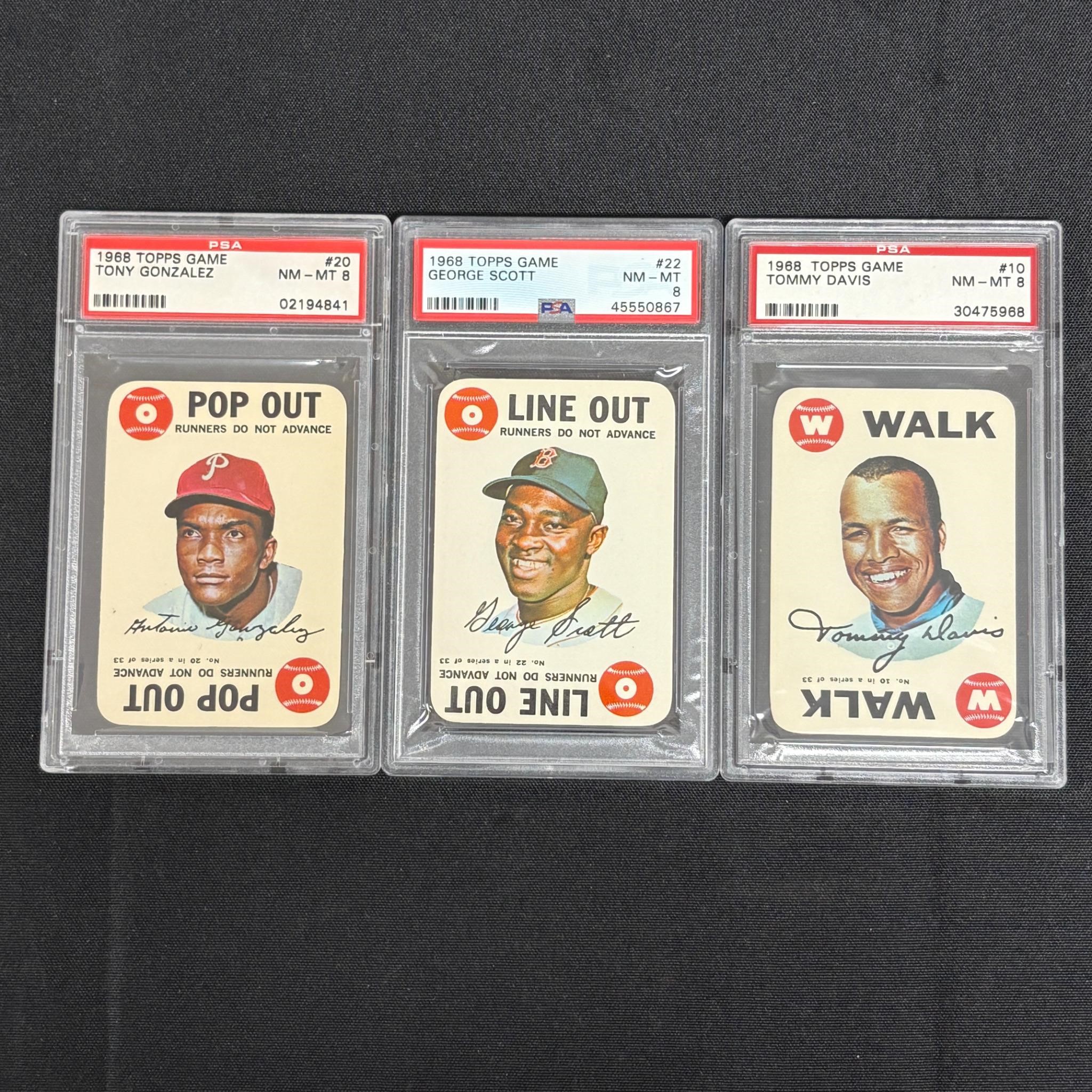 PSA 8 Graded 1968 Topps Game Baseball Cards. Tony Gonzalez #20, George Scott #22, Tommy Davis #10. All items are sold as is. Please look at pictures carefully to determine what you believe are the condition of each lot. By choosing which card to use to register to bid, you authorize us to use the card on file that you used at the time of registration.at the end of the auction to pay for any lots and shipping you won. Happy Bidding and Best of luck! We offer in-house shipping. We are currently accepting consignments.