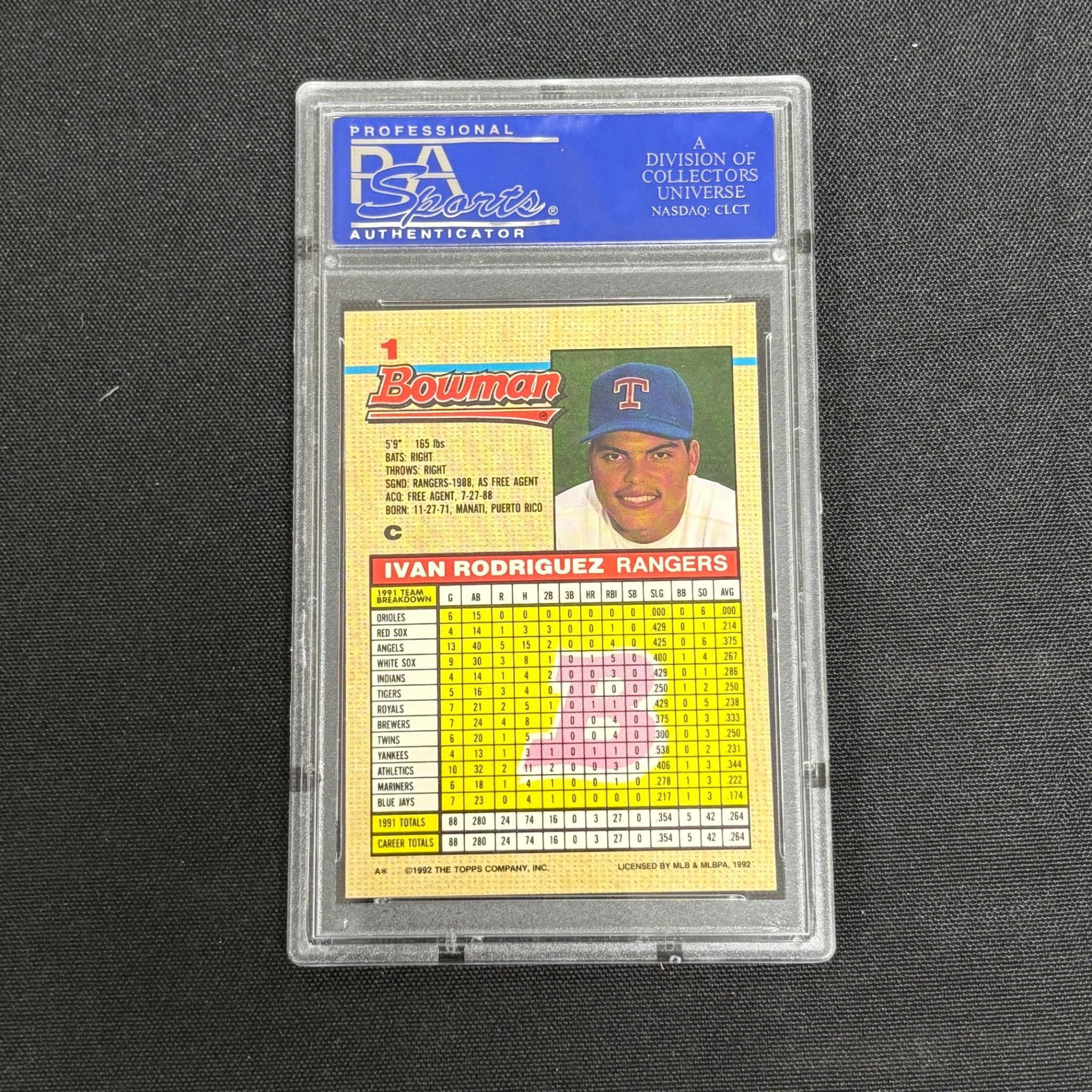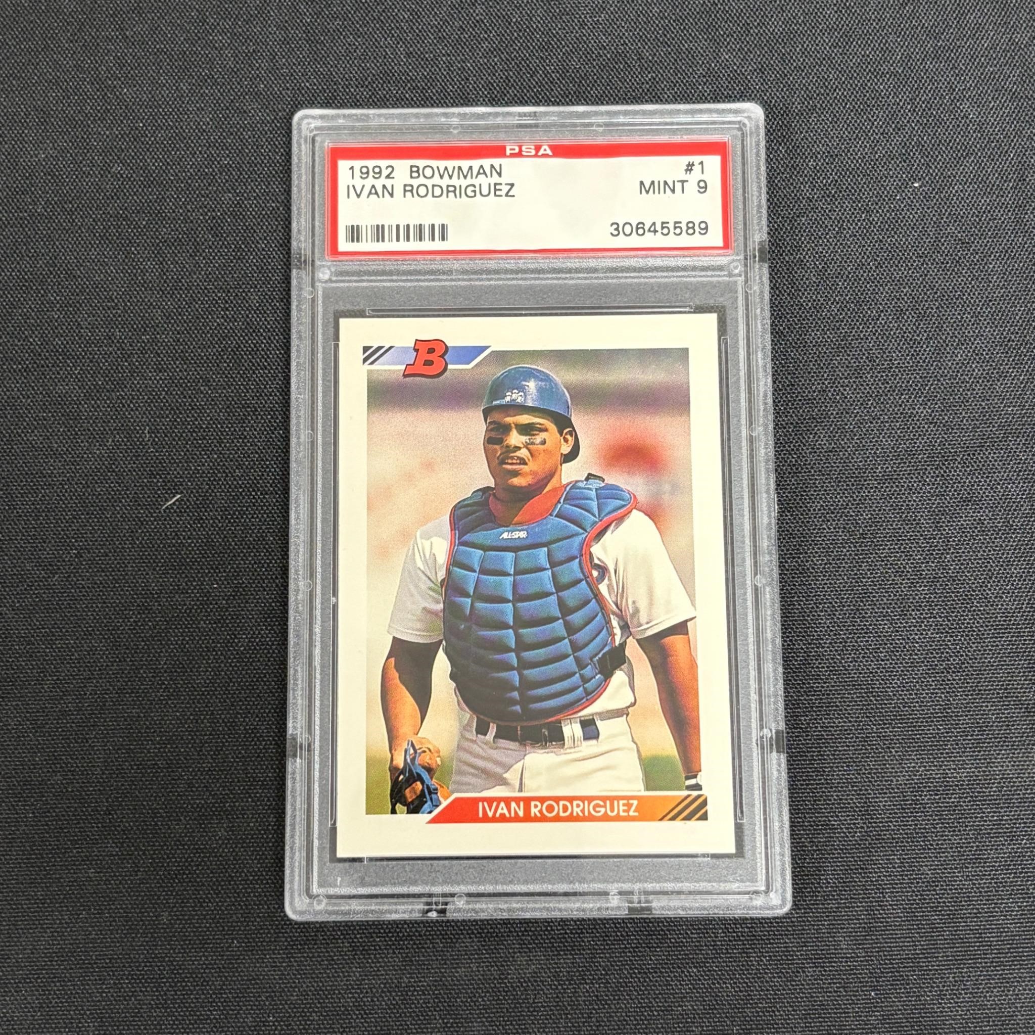 PSA 9 Ivan Rodriguez #1 1992 Bowman Baseball Card. All items are sold as is. Please look at pictures carefully to determine what you believe are the condition of each lot. By choosing which card to use to register to bid, you authorize us to use the card on file that you used at the time of registration.at the end of the auction to pay for any lots and shipping you won. Happy Bidding and Best of luck! We offer in-house shipping. We are currently accepting consignments.