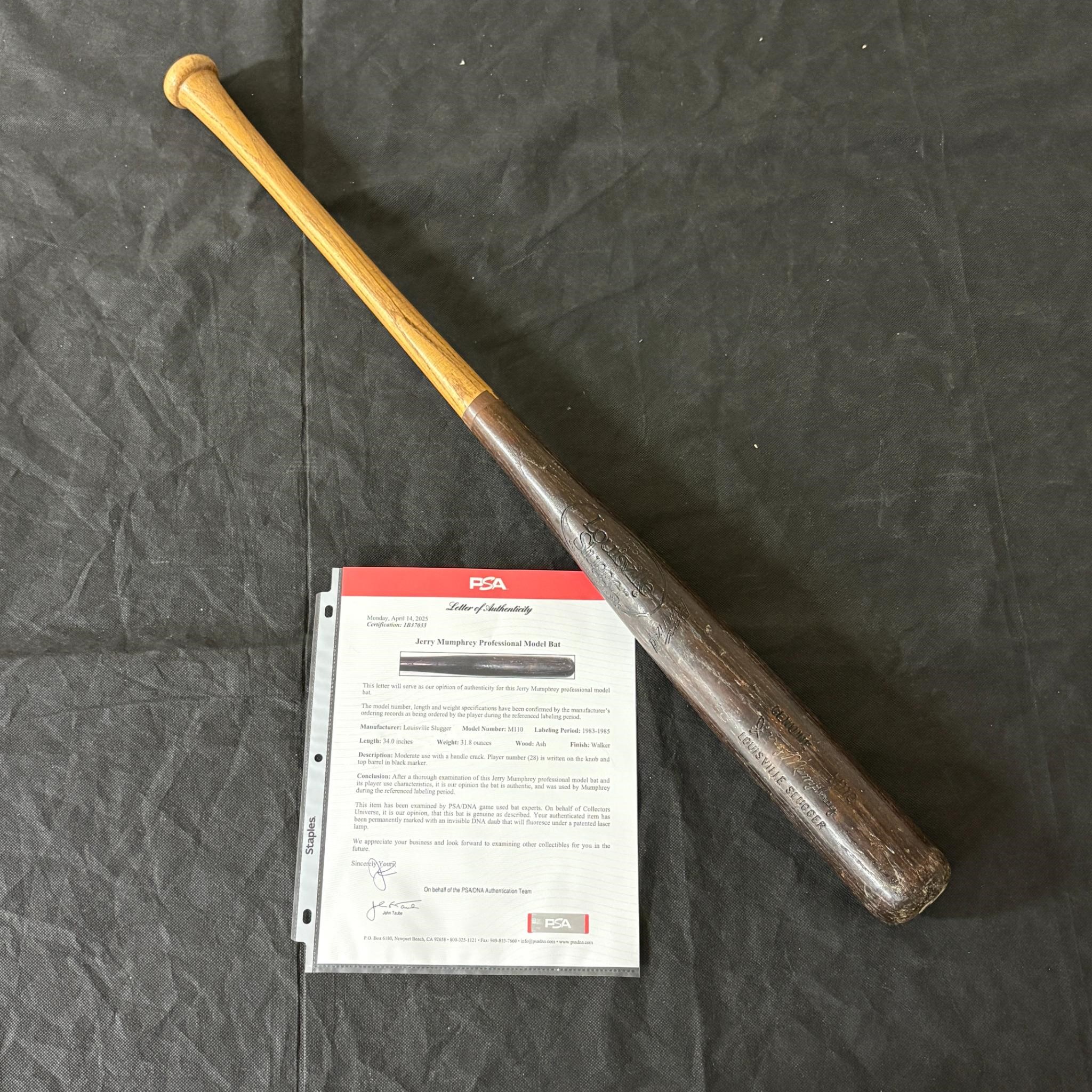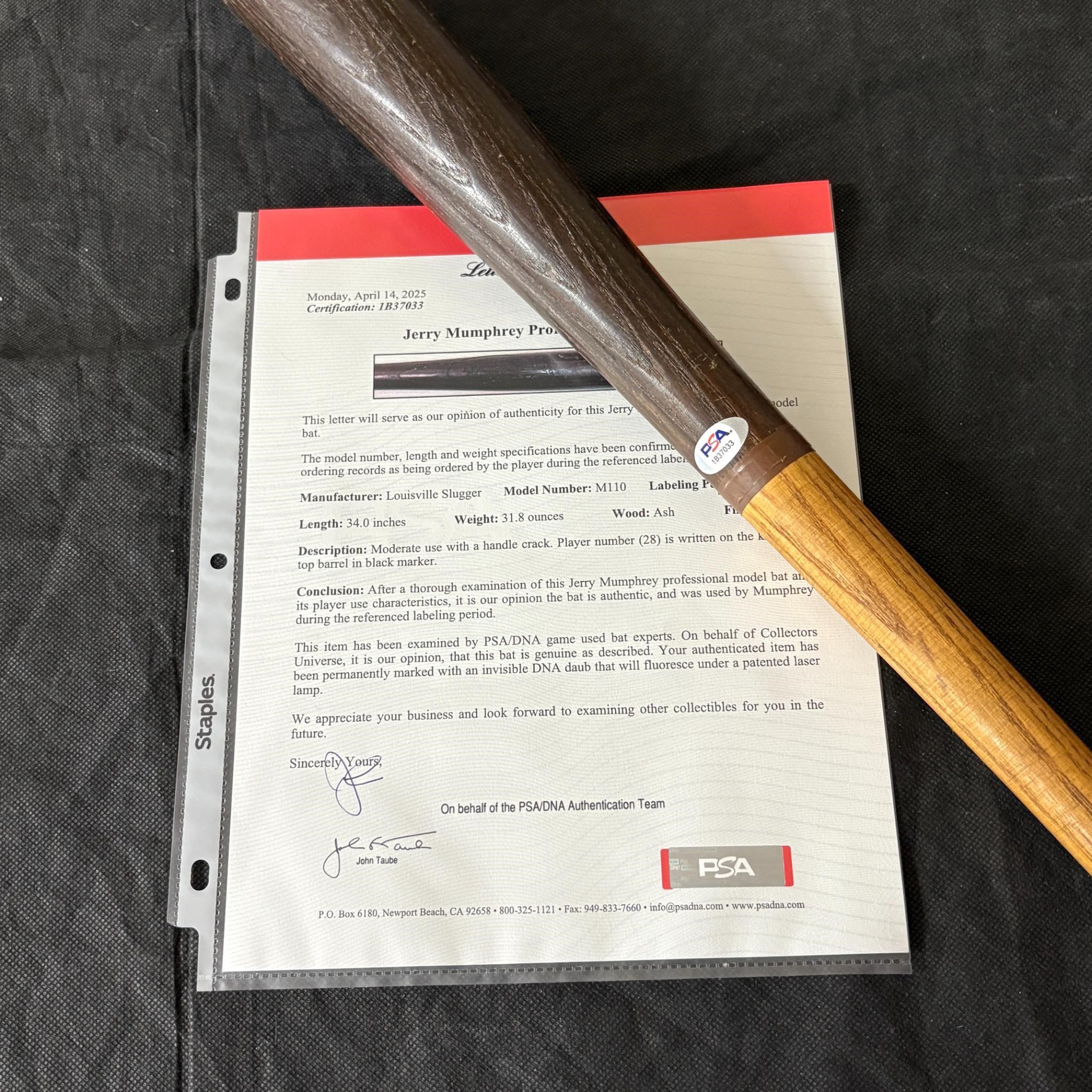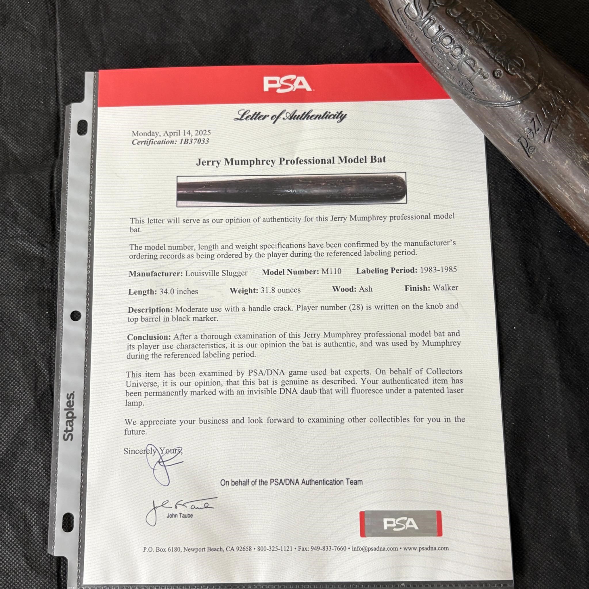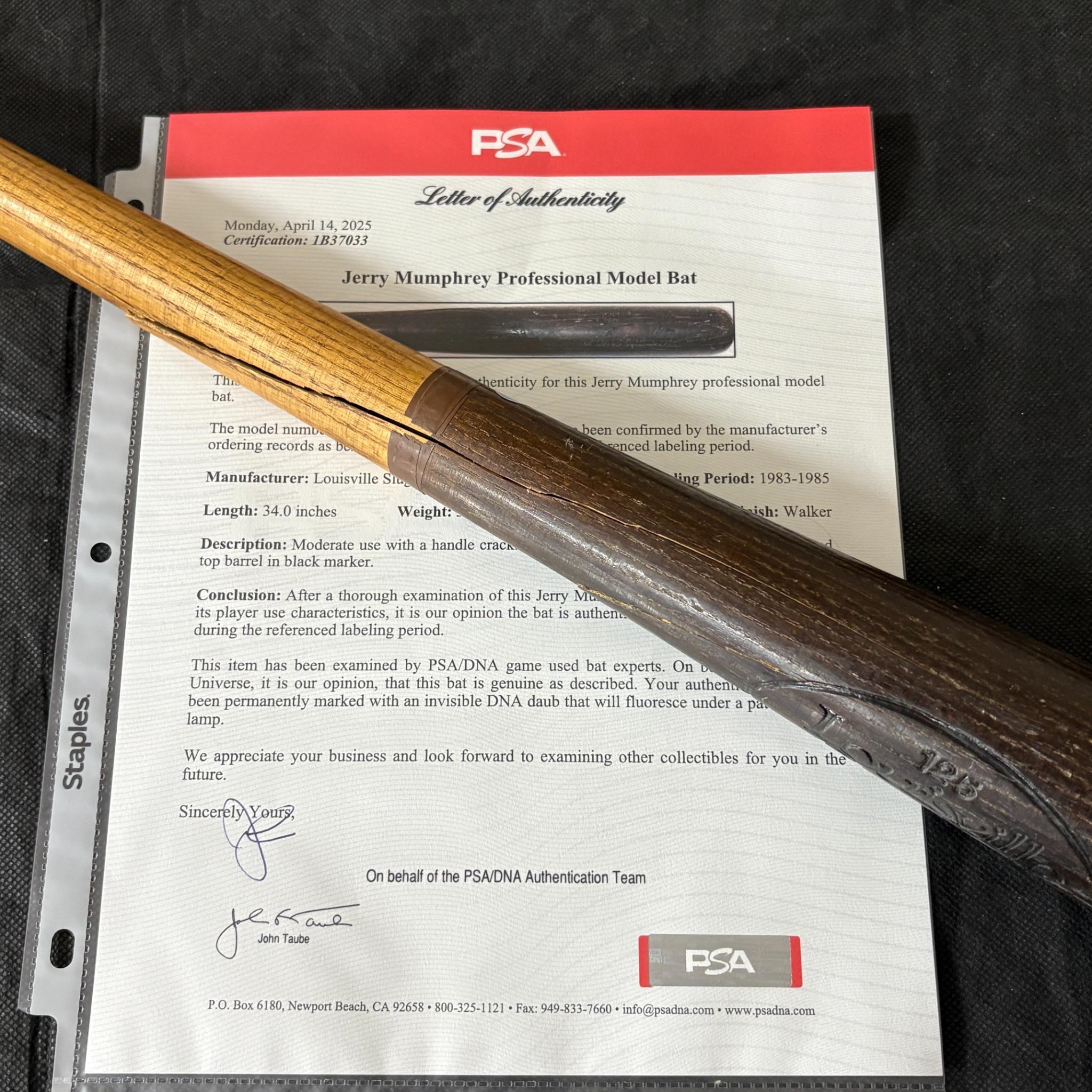 PSA/DNA Certified Game Used baseball bat by Jerry Mumphrey. Bat displays use with a handle crack. Bat was used from 1983-1985. All items are sold as is. Please look at pictures carefully to determine what you believe are the condition of each lot. By choosing which card to use to register to bid, you authorize us to use the card on file that you used at the time of registration.at the end of the auction to pay for any lots and shipping you won. Happy Bidding and Best of luck! We offer in-house shipping. We are currently accepting consignments.