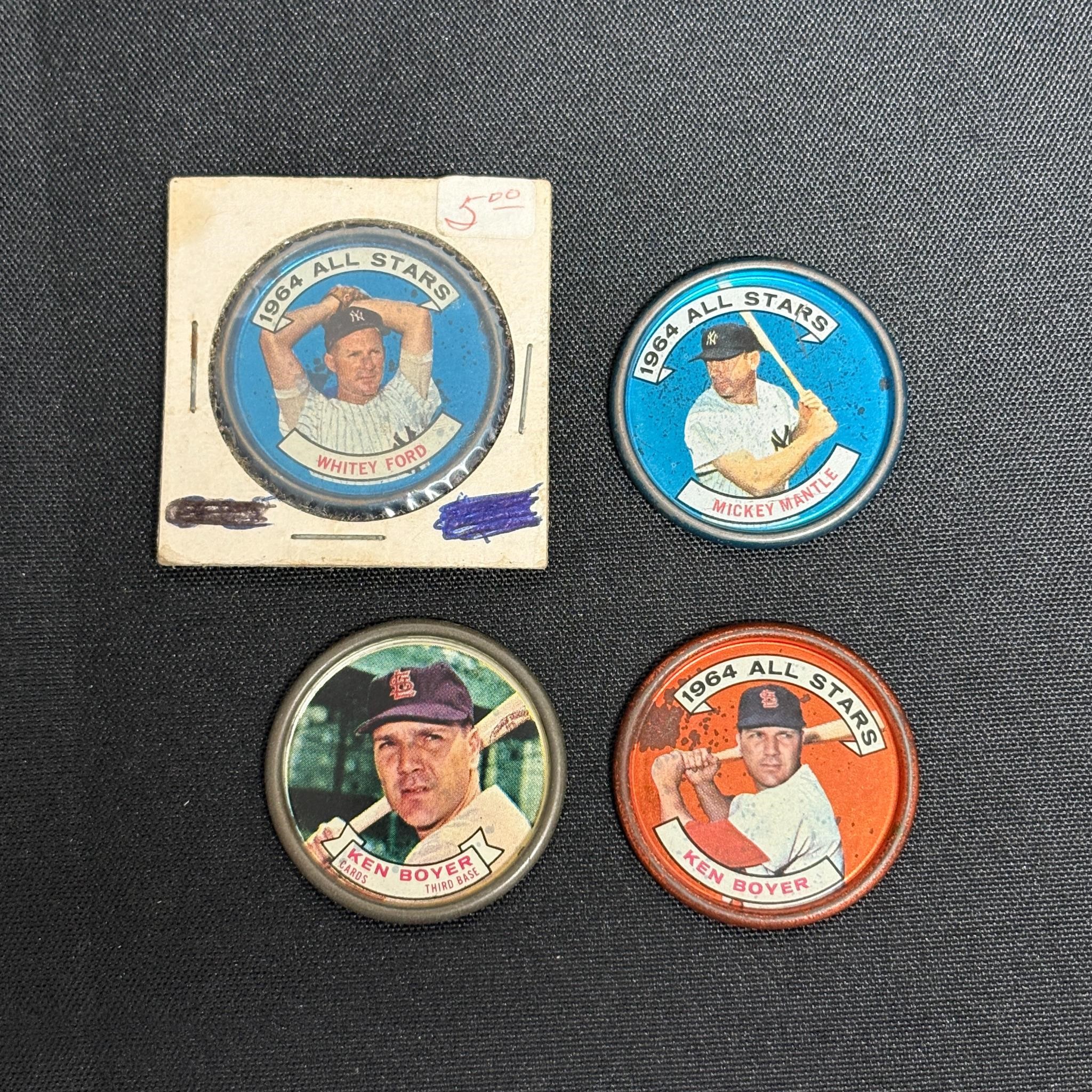 1964 Topps Baseball Coins. Mickey Mantle, Whitey Ford, Ken Boyer. All items are sold as is. Please look at pictures carefully to determine what you believe are the condition of each lot. By choosing which card to use to register to bid, you authorize us to use the card on file that you used at the time of registration.at the end of the auction to pay for any lots and shipping you won. Happy Bidding and Best of luck! We offer in-house shipping. We are currently accepting consignments.