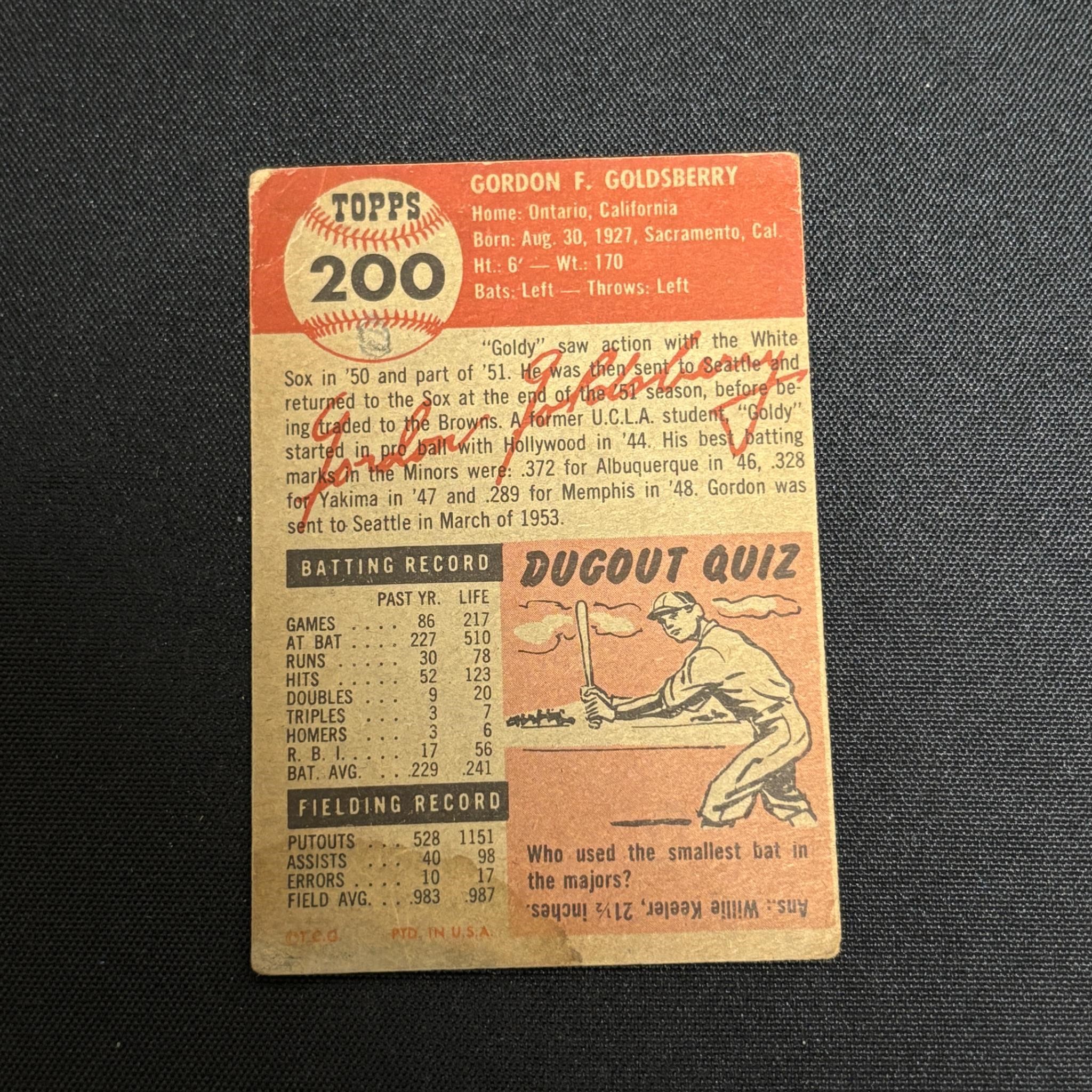 1953 Topps Baseball Card. Gordon Goldsberry #200 Signed card. All items are sold as is. Please look at pictures carefully to determine what you believe are the condition of each lot. By choosing which card to use to register to bid, you authorize us to use the card on file that you used at the time of registration.at the end of the auction to pay for any lots and shipping you won. Happy Bidding and Best of luck! We offer in-house shipping. We are currently accepting consignments.