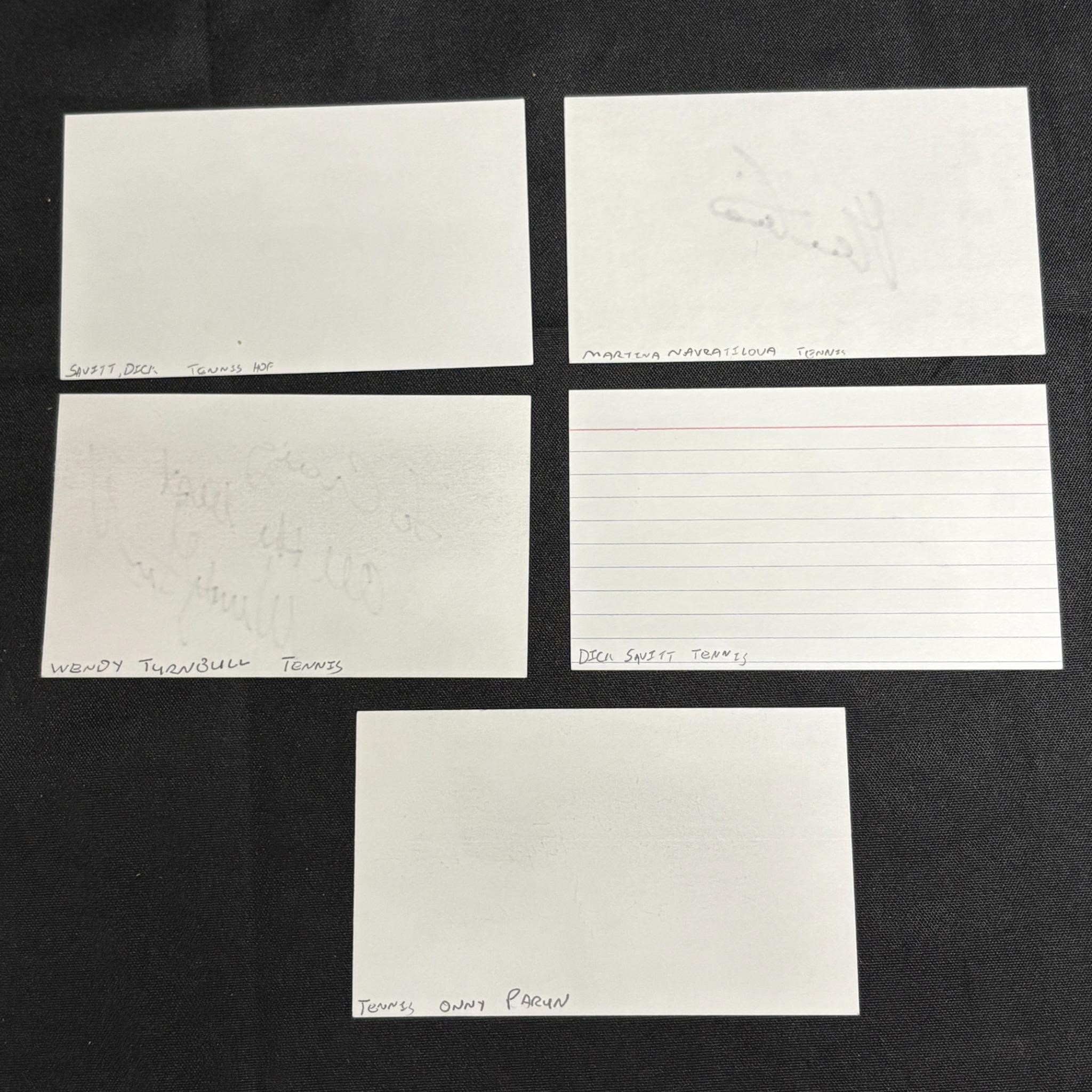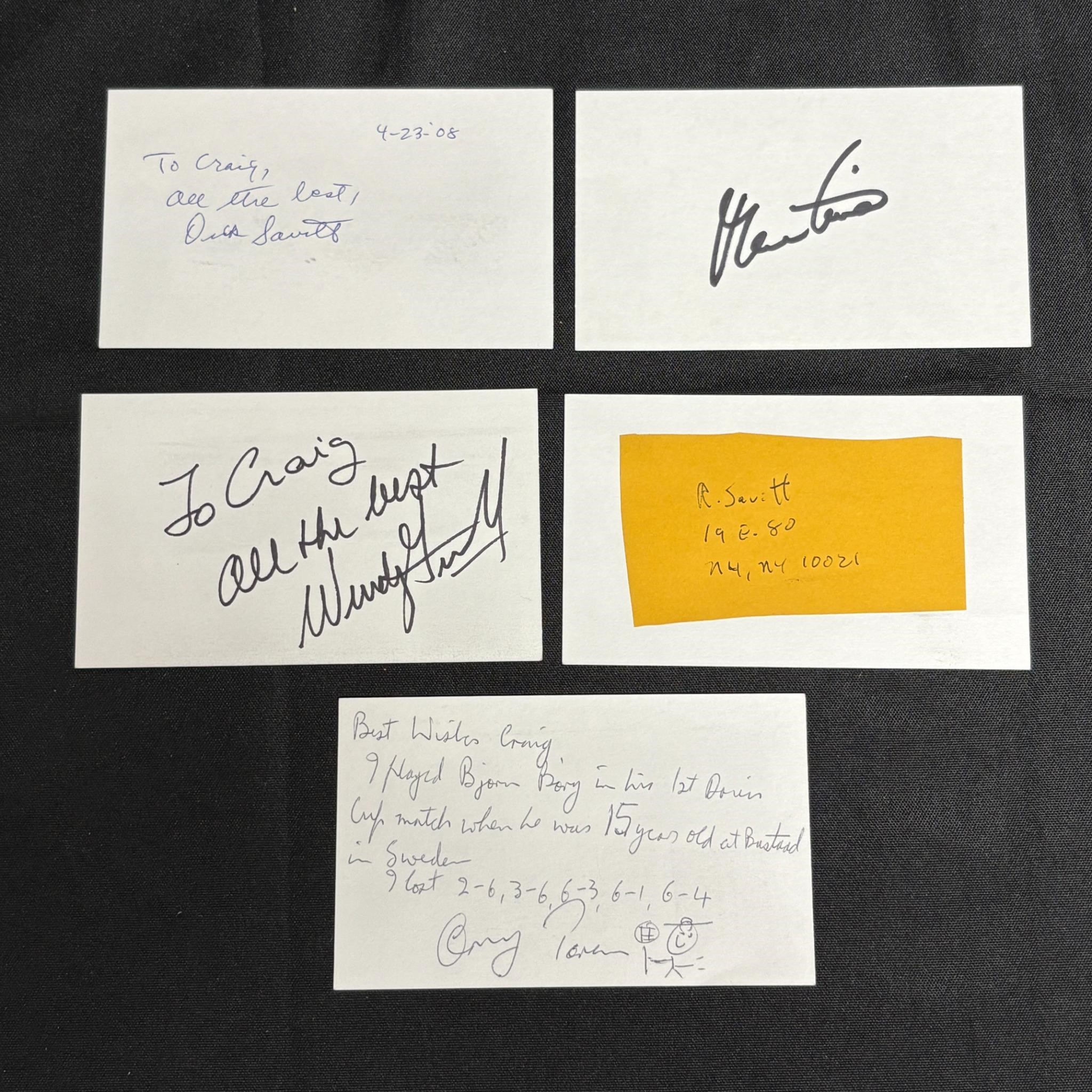 Signatures from professional tennis players. Includes Hall of Fame Member Dick Savitt, Wendy Turnbull, Martina Navratilova, and Onny Parun. All items are sold as is. Please look at pictures carefully to determine what you believe are the condition of each lot. By choosing which card to use to register to bid, you authorize us to use the card on file that you used at the time of registration.at the end of the auction to pay for any lots and shipping you won. Happy Bidding and Best of luck! We offer in-house shipping. We are currently accepting consignments.