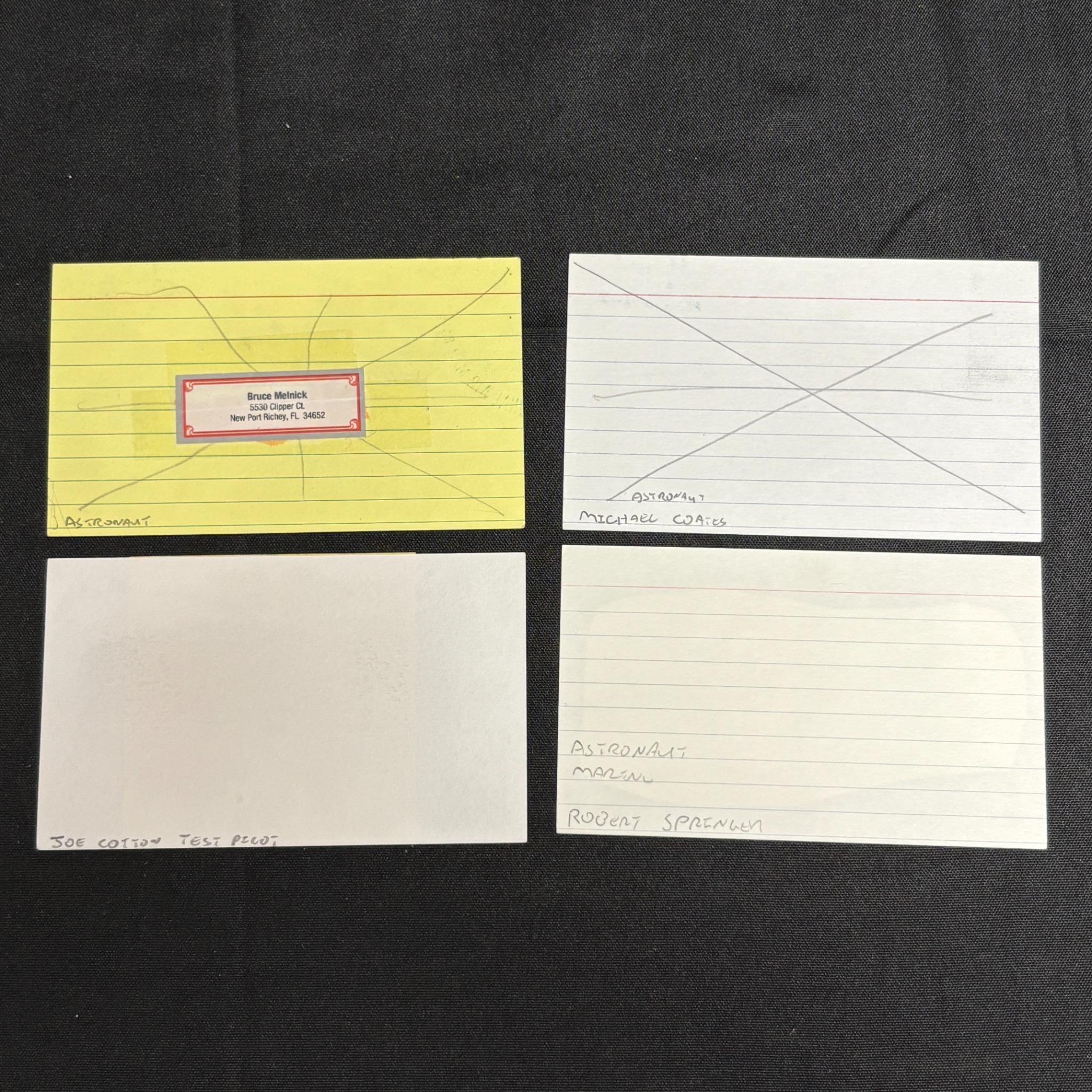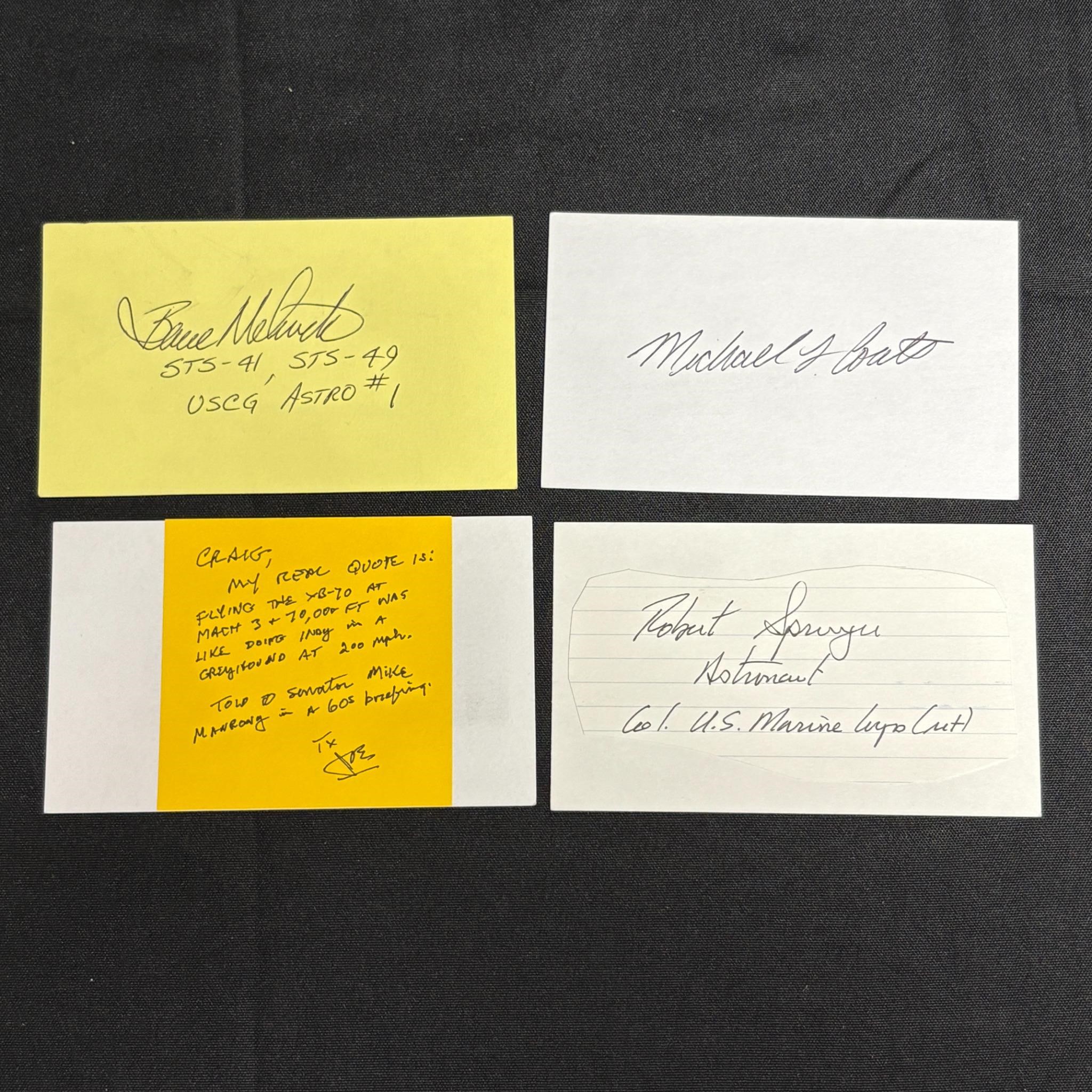 Lot of signatures from astronauts Michael Coates, Robert Springen, and Bruce Melnick. As well as test pilot Joe Cotton. All items are sold as is. Please look at pictures carefully to determine what you believe are the condition of each lot. By choosing which card to use to register to bid, you authorize us to use the card on file that you used at the time of registration.at the end of the auction to pay for any lots and shipping you won. Happy Bidding and Best of luck! We offer in-house shipping. We are currently accepting consignments.