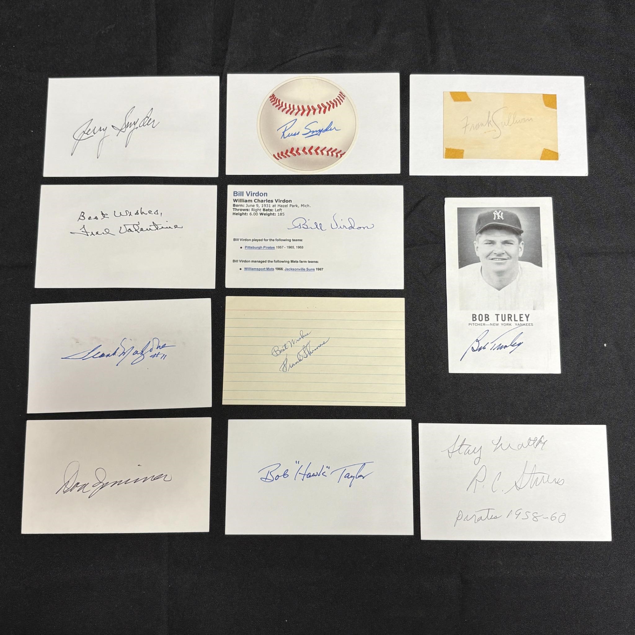 Large lot of Baseball player Signatures. Includes Jerry Snyder, Fred Valentine, Frank Malzone, Russ Snyder, Bill Virdon, Frank Thomas, and Bob Taylor ++ All items are sold as is. Please look at pictures carefully to determine what you believe are the condition of each lot. By choosing which card to use to register to bid, you authorize us to use the card on file that you used at the time of registration.at the end of the auction to pay for any lots and shipping you won. Happy Bidding and Best of luck! We offer in-house shipping. We are currently accepting consignments.