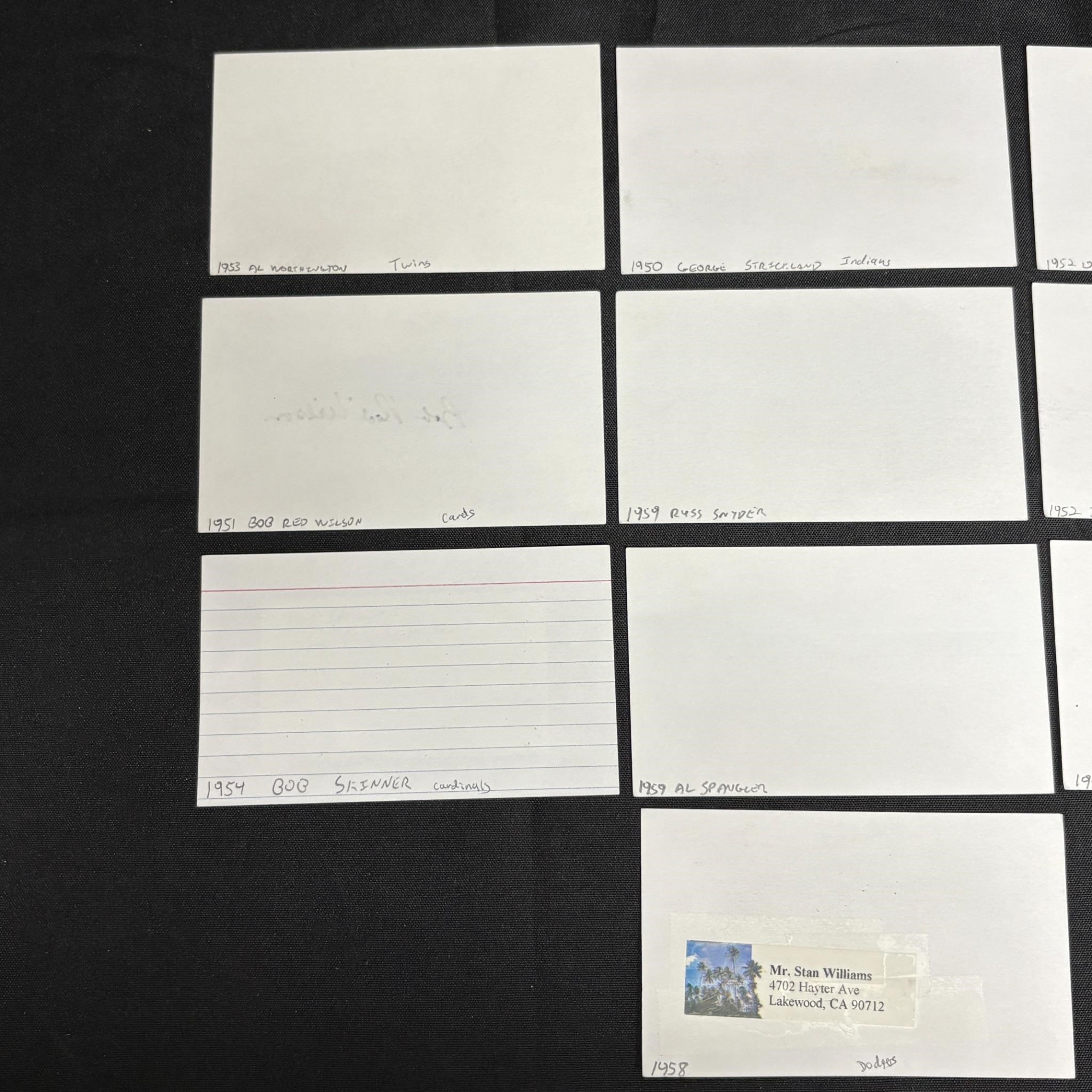 Large lot of baseball player signature includes Al Worthington, Bob Red Wilson, Bob Skinner, George Strickland, Russ Snyder, Al Spangler, Stan Williams, Jim Small, Jerry Snyder, Daryl Spencer. All items are sold as is. Please look at pictures carefully to determine what you believe are the condition of each lot. By choosing which card to use to register to bid, you authorize us to use the card on file that you used at the time of registration.at the end of the auction to pay for any lots and shipping you won. Happy Bidding and Best of luck! We offer in-house shipping. We are currently accepting consignments.