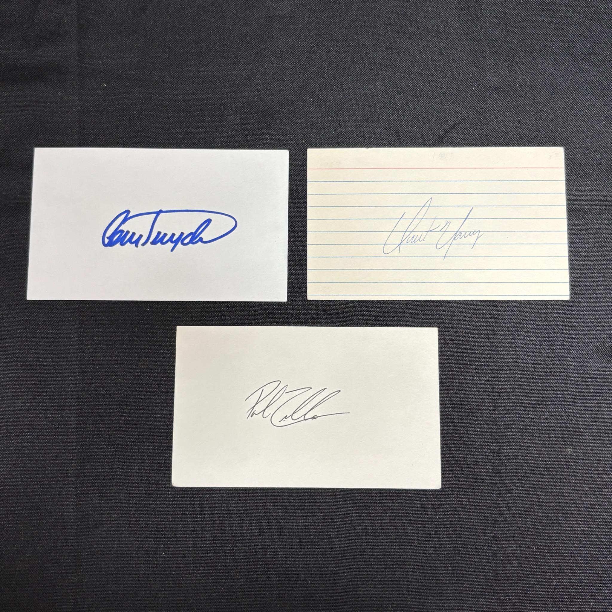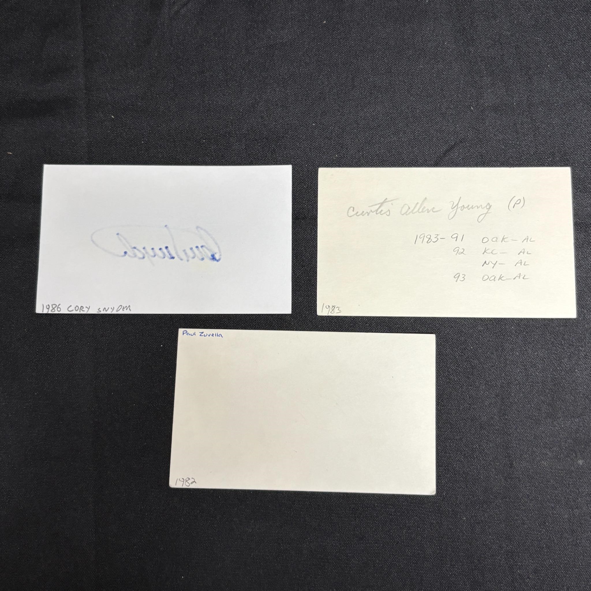 Lot of Baseball Player signatures. Includes Cory Snyder, Curtis Young, and Paul Zuvella. All items are sold as is. Please look at pictures carefully to determine what you believe are the condition of each lot. By choosing which card to use to register to bid, you authorize us to use the card on file that you used at the time of registration.at the end of the auction to pay for any lots and shipping you won. Happy Bidding and Best of luck! We offer in-house shipping. We are currently accepting consignments.