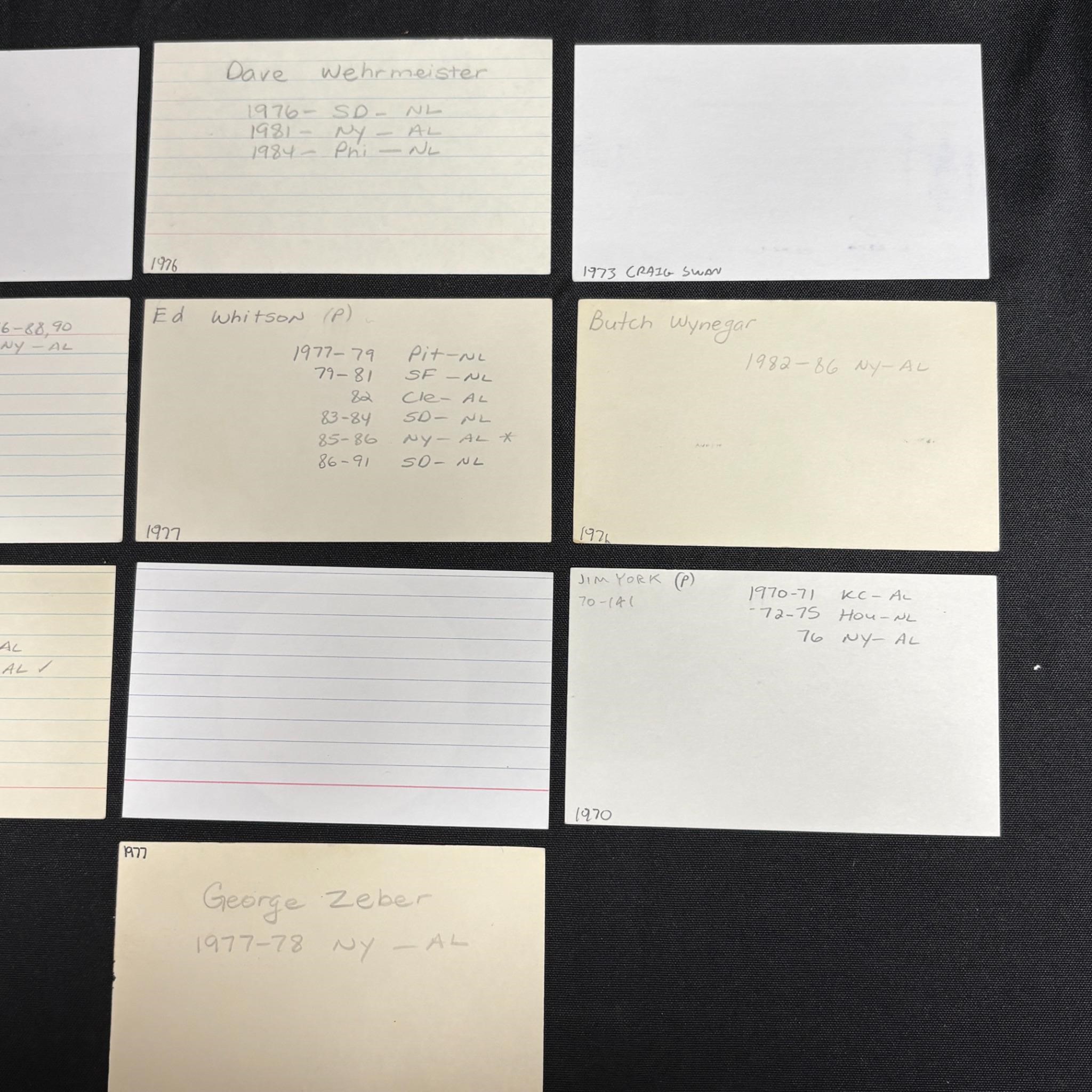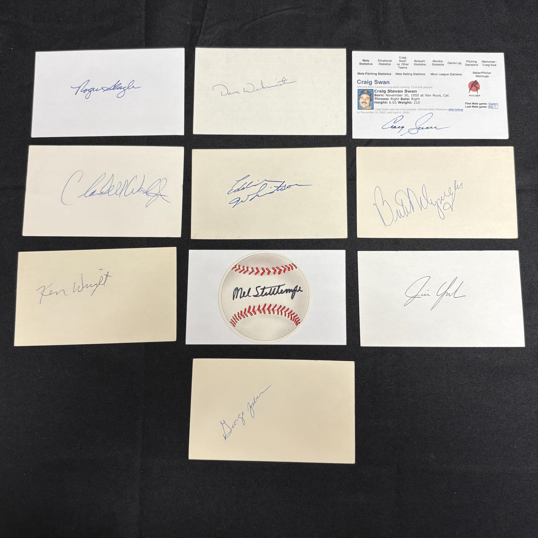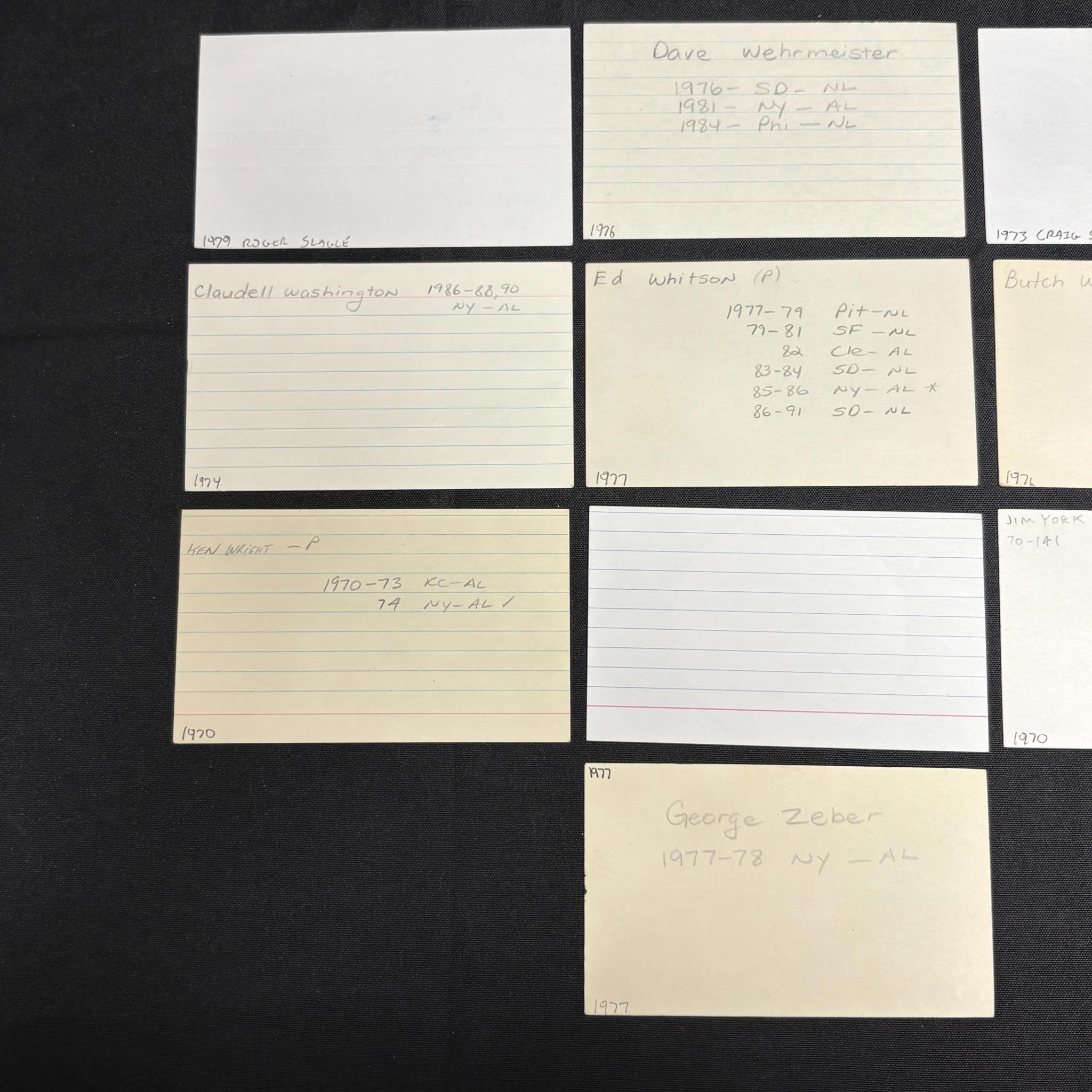 Large lot of baseball player signatures. Includes Roger Slagle, Claudell Washington, Ken Wright, Dave Wehrmeister, Ed Whitson, George Zeber, Craig Swan, Butch Wynegar, and Jim York. All items are sold as is. Please look at pictures carefully to determine what you believe are the condition of each lot. By choosing which card to use to register to bid, you authorize us to use the card on file that you used at the time of registration.at the end of the auction to pay for any lots and shipping you won. Happy Bidding and Best of luck! We offer in-house shipping. We are currently accepting consignments.