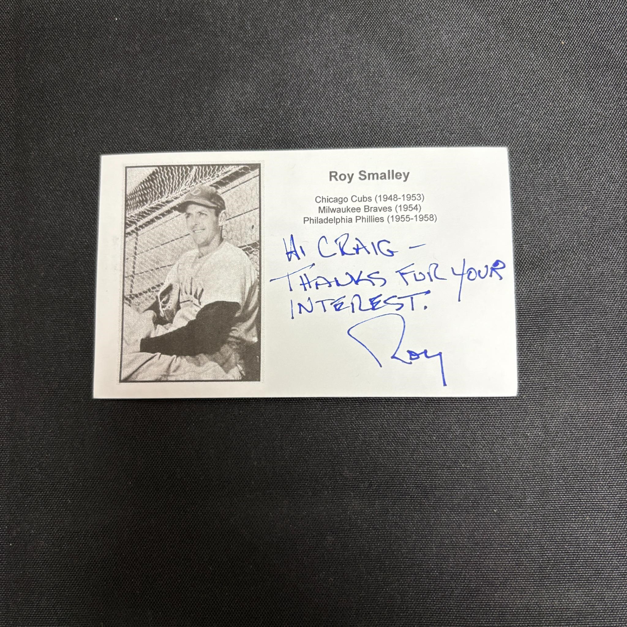 Baseball Player Roy Smalley note and Signature. All items are sold as is. Please look at pictures carefully to determine what you believe are the condition of each lot. By choosing which card to use to register to bid, you authorize us to use the card on file that you used at the time of registration.at the end of the auction to pay for any lots and shipping you won. Happy Bidding and Best of luck! We offer in-house shipping. We are currently accepting consignments.