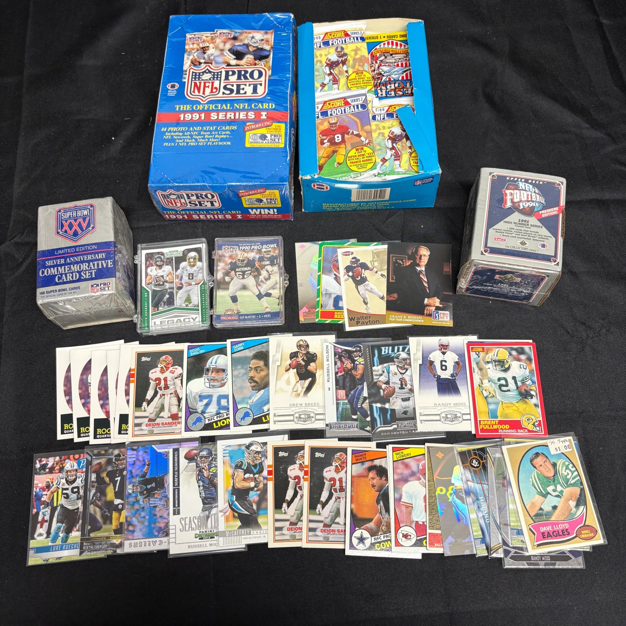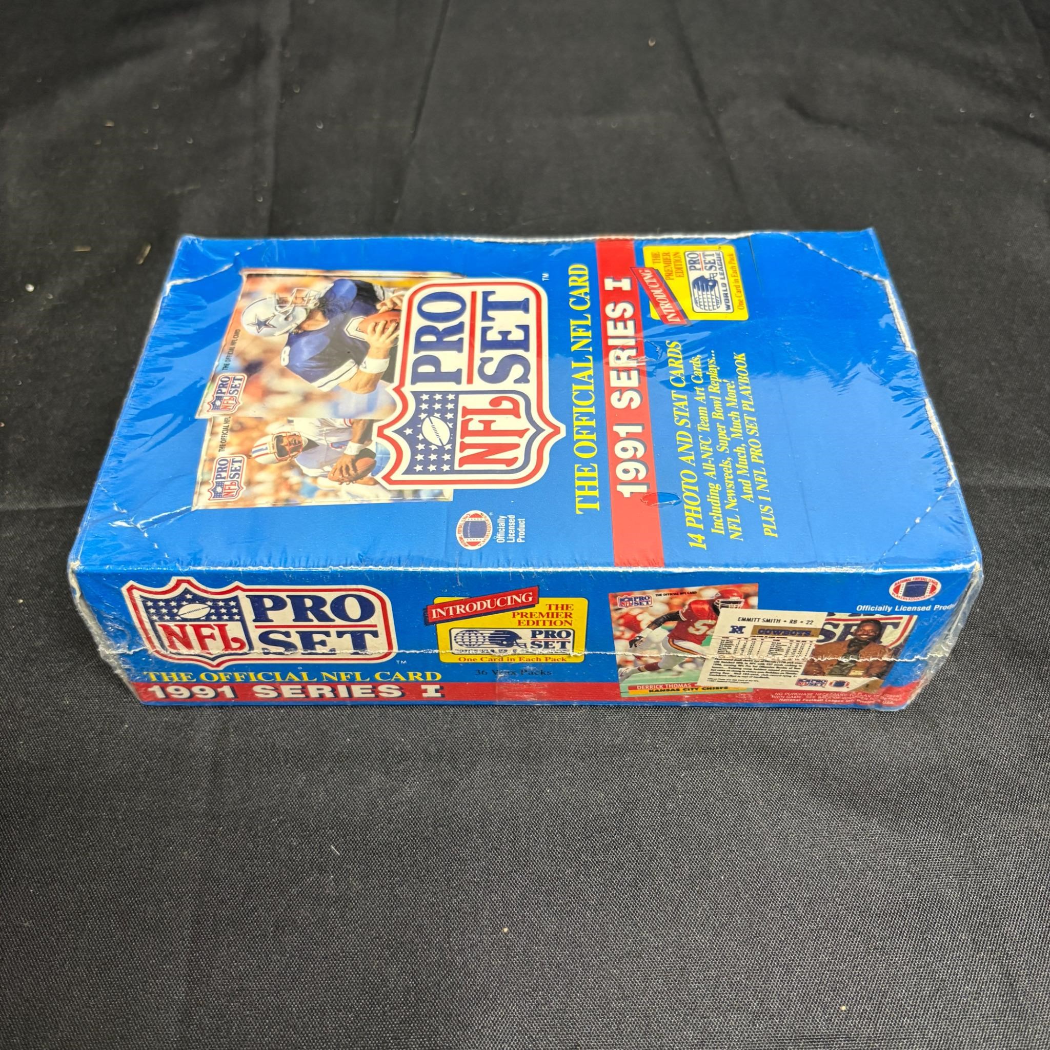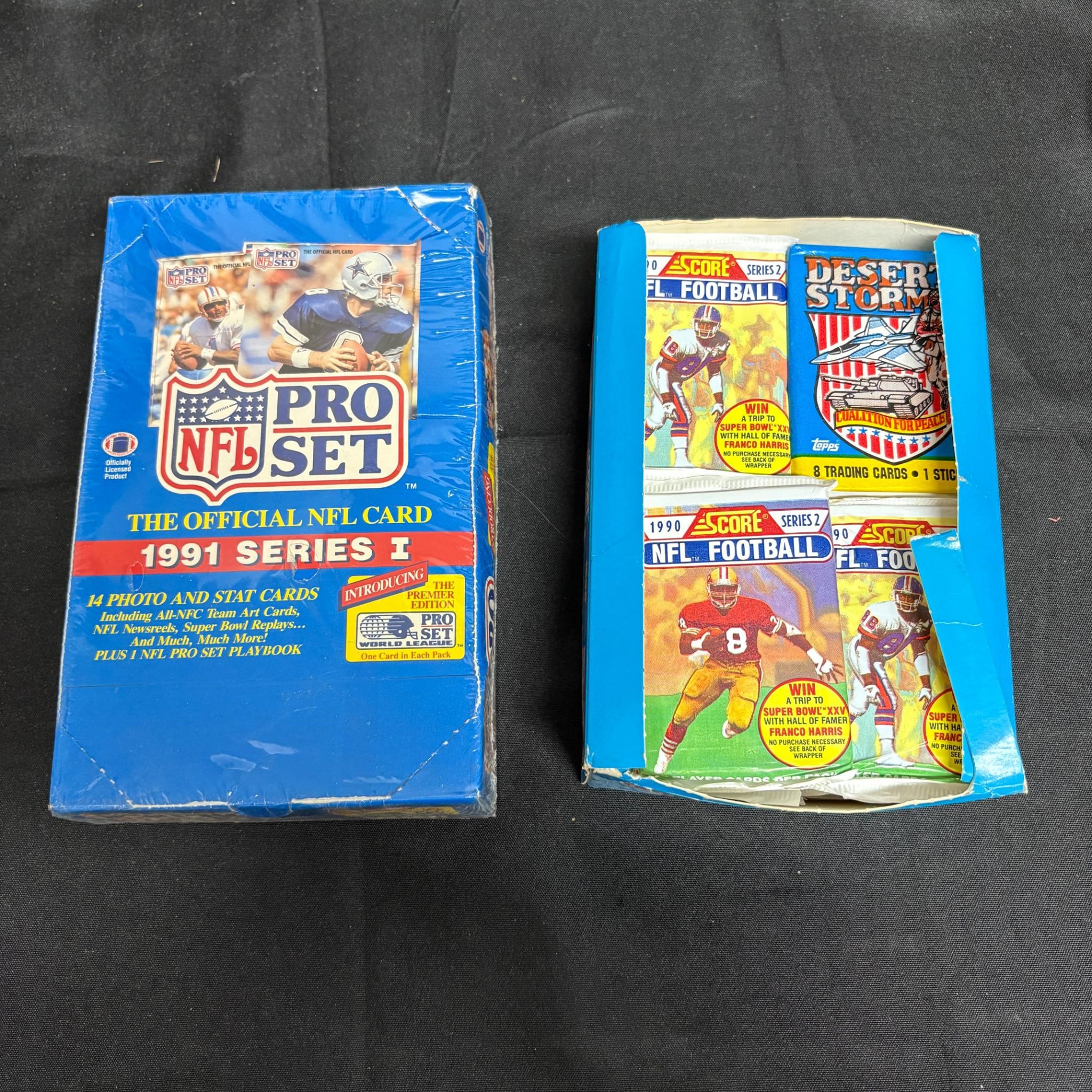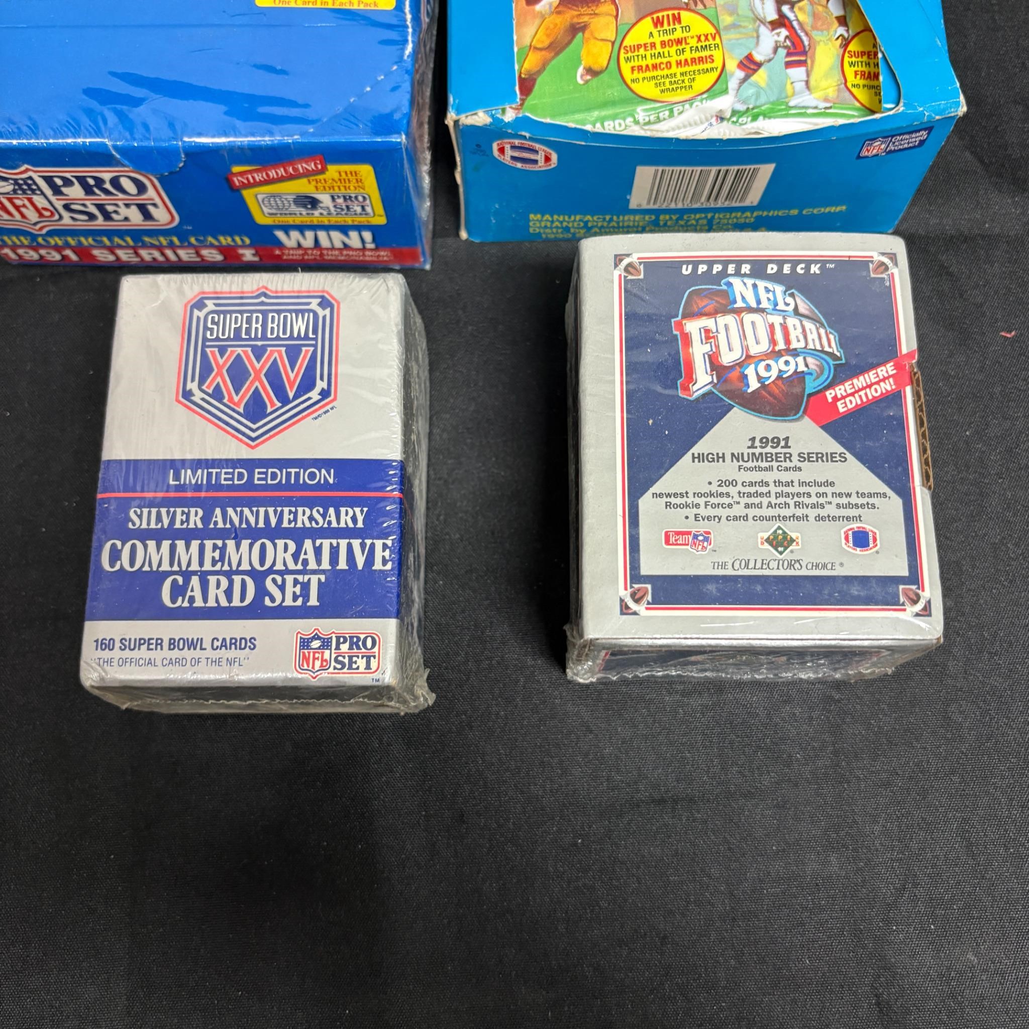 Sealed 1991 Series 1 Proset Football Card Box, Sealed 1990 Score Series Two Football Packs, Sealed Commemorative Superbowl set, and Sealed Upper Deck NFL Football 1991 Premiere Edition Box. All items are sold as is. Please look at pictures carefully to determine what you believe are the condition of each lot. By choosing which card to use to register to bid, you authorize us to use the card on file that you used at the time of registration.at the end of the auction to pay for any lots and shipping you won. Happy Bidding and Best of luck! We offer in-house shipping. We are currently accepting consignments.