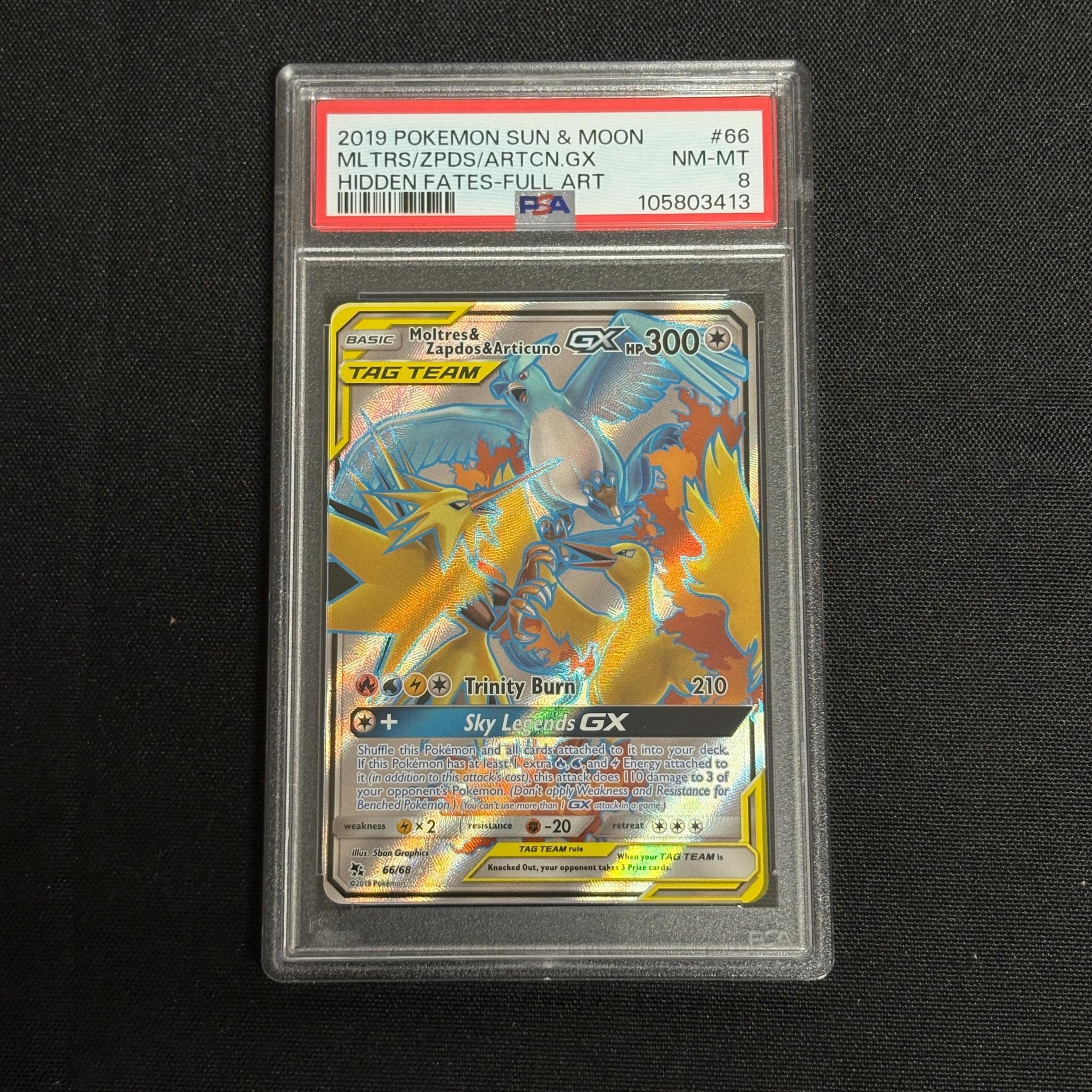PSA 8 Moltres and Zapdos and Articuno GX #66 Hidden Fates Full Art Pokemon Card. All items are sold as is. Please look at pictures carefully to determine what you believe are the condition of each lot. By choosing which card to use to register to bid, you authorize us to use the card on file that you used at the time of registration.at the end of the auction to pay for any lots and shipping you won. Happy Bidding and Best of luck! We offer in-house shipping. We are currently accepting consignments.