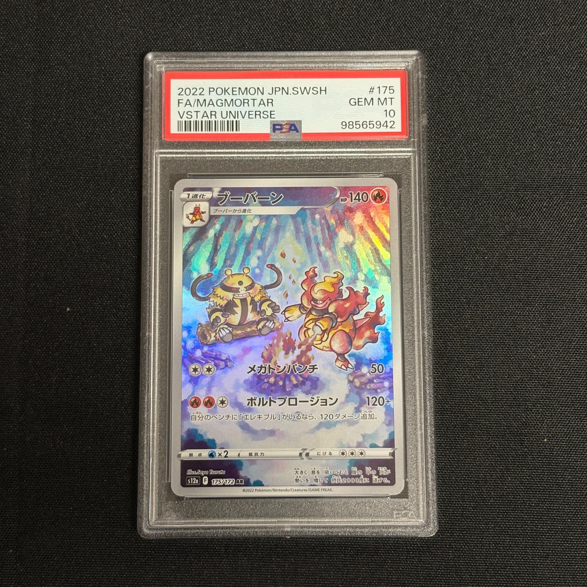 PSA 10 Magmorar #175 Art Rare Japanese VSTAR Universe Pokemon Card. All items are sold as is. Please look at pictures carefully to determine what you believe are the condition of each lot. By choosing which card to use to register to bid, you authorize us to use the card on file that you used at the time of registration.at the end of the auction to pay for any lots and shipping you won. Happy Bidding and Best of luck! We offer in-house shipping. We are currently accepting consignments.