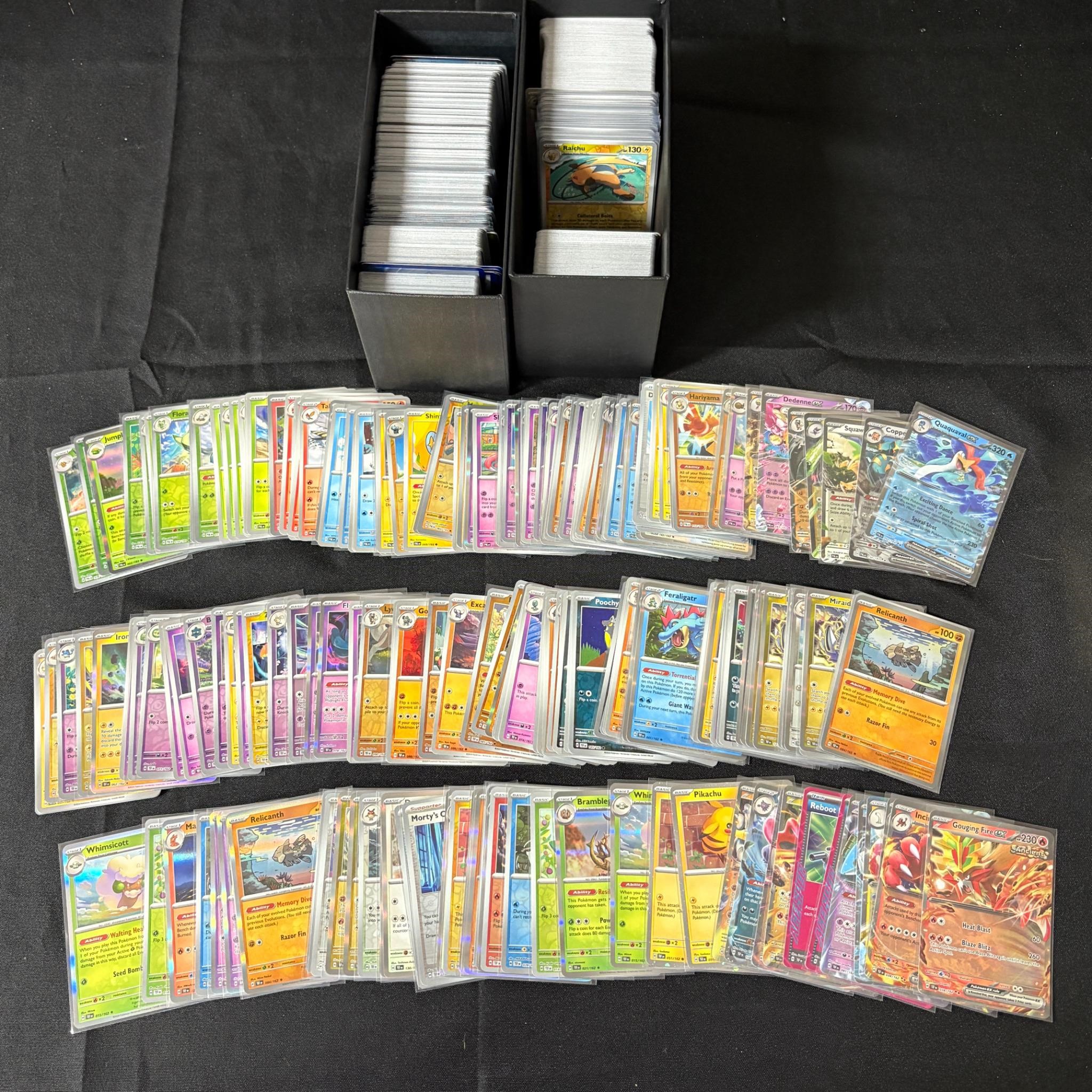 Bulk lot of Temporal Forces and Paldea Evolved Pokemon Cards. Includes Some hits but mostly holos, rev holos, and bulk. All items are sold as is. Please look at pictures carefully to determine what you believe are the condition of each lot. By choosing which card to use to register to bid, you authorize us to use the card on file that you used at the time of registration.at the end of the auction to pay for any lots and shipping you won. Happy Bidding and Best of luck! We offer in-house shipping. We are currently accepting consignments.
