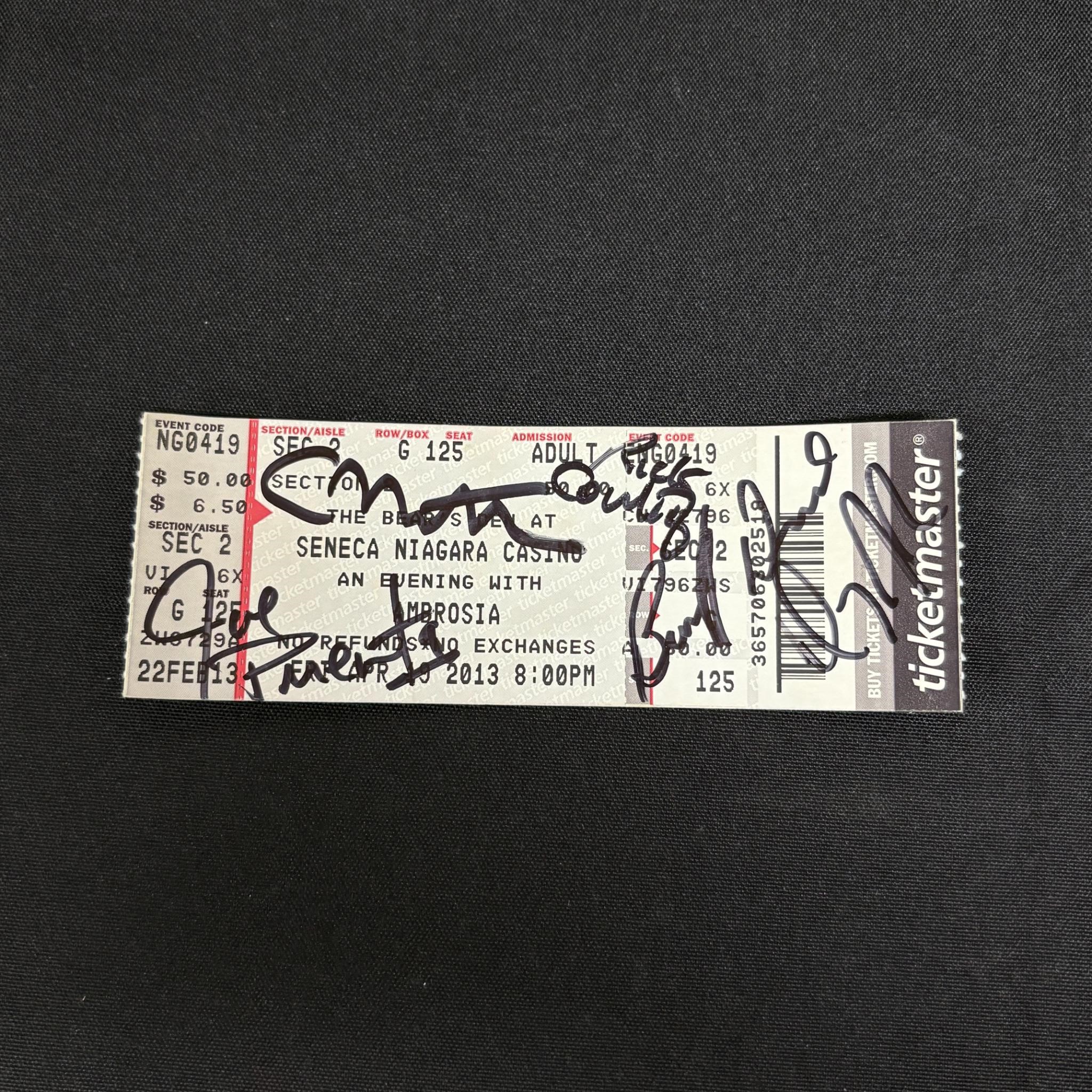 Concert Ticket Signed by the Members of the Band Ambrosia. All items are sold as is. Please look at pictures carefully to determine what you believe are the condition of each lot. By choosing which card to use to register to bid, you authorize us to use the card on file that you used at the time of registration.at the end of the auction to pay for any lots and shipping you won. Happy Bidding and Best of luck! We offer in-house shipping. We are currently accepting consignments.