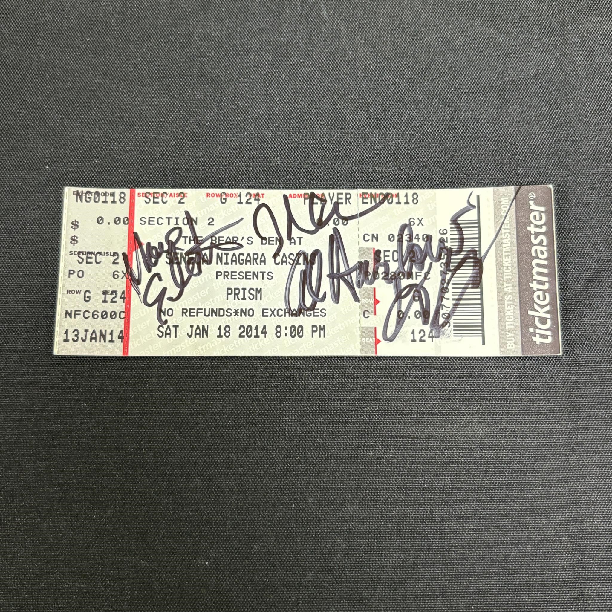 Concert Ticket for the Band Prism, Signed by Multiple Band members, including Al Harlow. All items are sold as is. Please look at pictures carefully to determine what you believe are the condition of each lot. By choosing which card to use to register to bid, you authorize us to use the card on file that you used at the time of registration.at the end of the auction to pay for any lots and shipping you won. Happy Bidding and Best of luck! We offer in-house shipping. We are currently accepting consignments.
