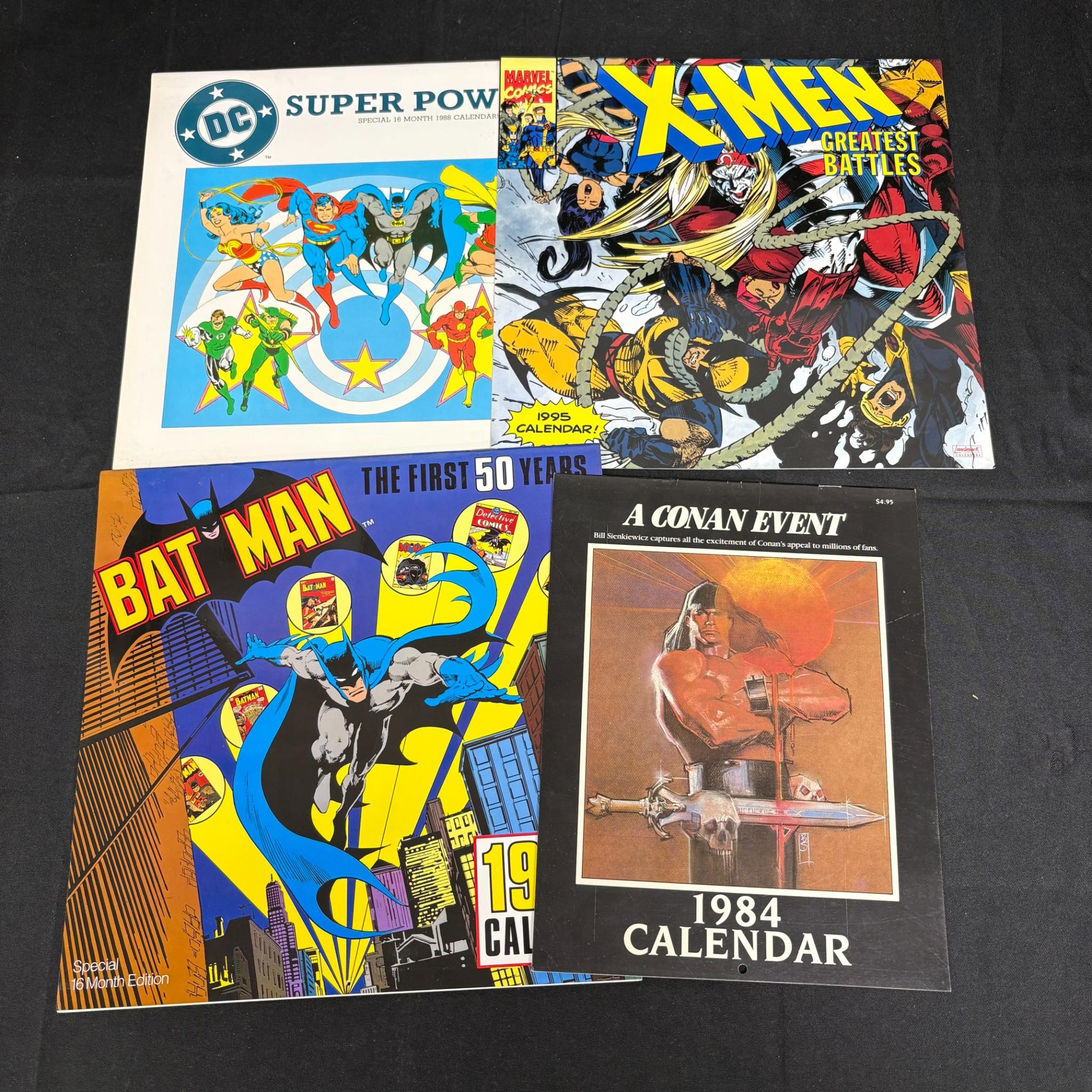 DC Super Heroes, Batman, X-Men Greatest Battles, and 1984 Conan Calendar. All items are sold as is. Please look at pictures carefully to determine what you believe are the condition of each lot. By choosing which card to use to register to bid, you authorize us to use the card on file that you used at the time of registration.at the end of the auction to pay for any lots and shipping you won. Happy Bidding and Best of luck! We offer in-house shipping. We are currently accepting consignments.