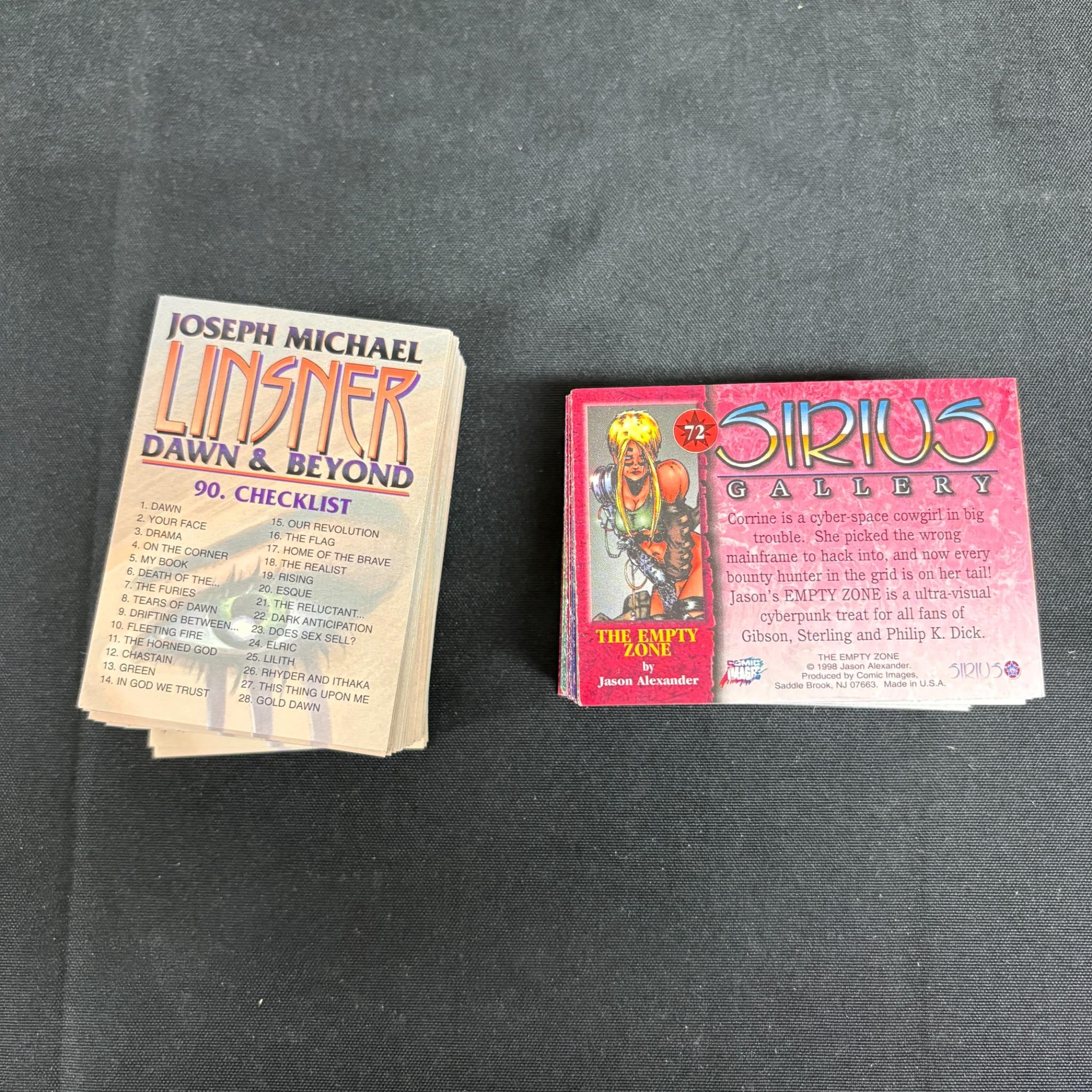 Complete Sets of Joseph Michael Linsner’s Dawn and Beyond Cards 1-90, and Sirius Gallery by Comic Images 1998 Trading Cards 1-72. All items are sold as is. Please look at pictures carefully to determine what you believe are the condition of each lot. By choosing which card to use to register to bid, you authorize us to use the card on file that you used at the time of registration.at the end of the auction to pay for any lots and shipping you won. Happy Bidding and Best of luck! We offer in-house shipping. We are currently accepting consignments.