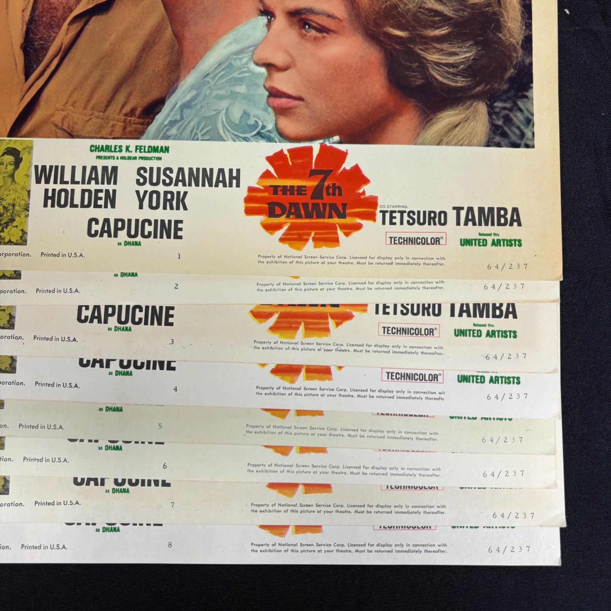 Set of 8 Original 1964 Lobby Cards for the film The 7th Dawn. All items are sold as is. Please look at pictures carefully to determine what you believe are the condition of each lot. By choosing which card to use to register to bid, you authorize us to use the card on file that you used at the time of registration.at the end of the auction to pay for any lots and shipping you won. Happy Bidding and Best of luck! We offer in-house shipping. We are currently accepting consignments.