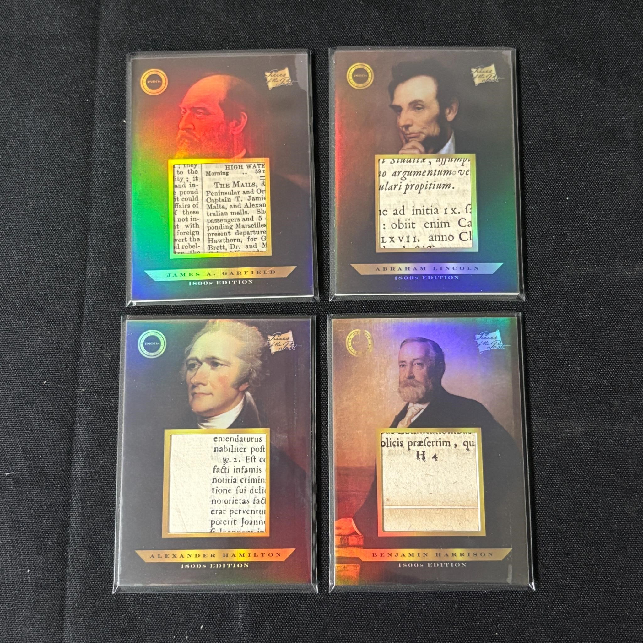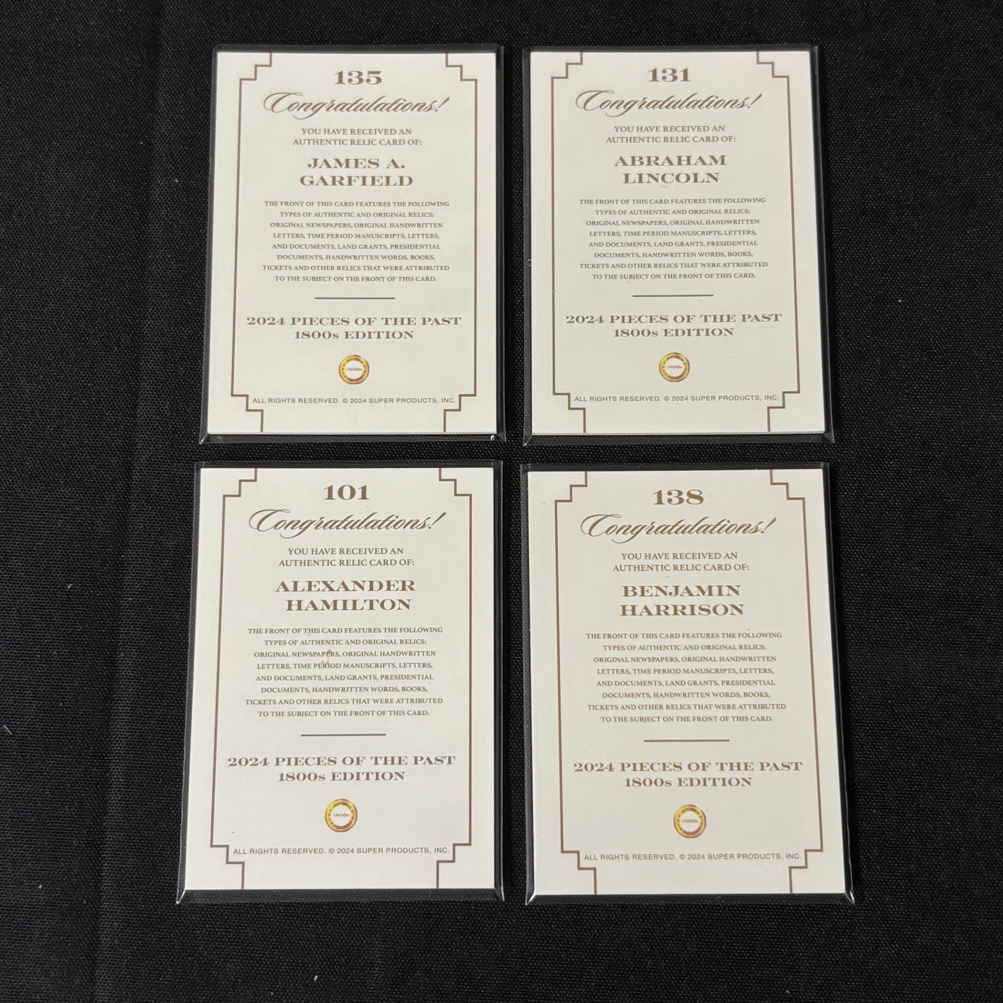 Lot of Pieces of the Past 2024 1800s Edition Relic Cards. includes James Garfield, Alexander Hamilton, Abraham Lincoln, Benjamin Harrison. All items are sold as is. Please look at pictures carefully to determine what you believe are the condition of each lot. By choosing which card to use to register to bid, you authorize us to use the card on file that you used at the time of registration.at the end of the auction to pay for any lots and shipping you won. Happy Bidding and Best of luck! We offer in-house shipping. We are currently accepting consignments.